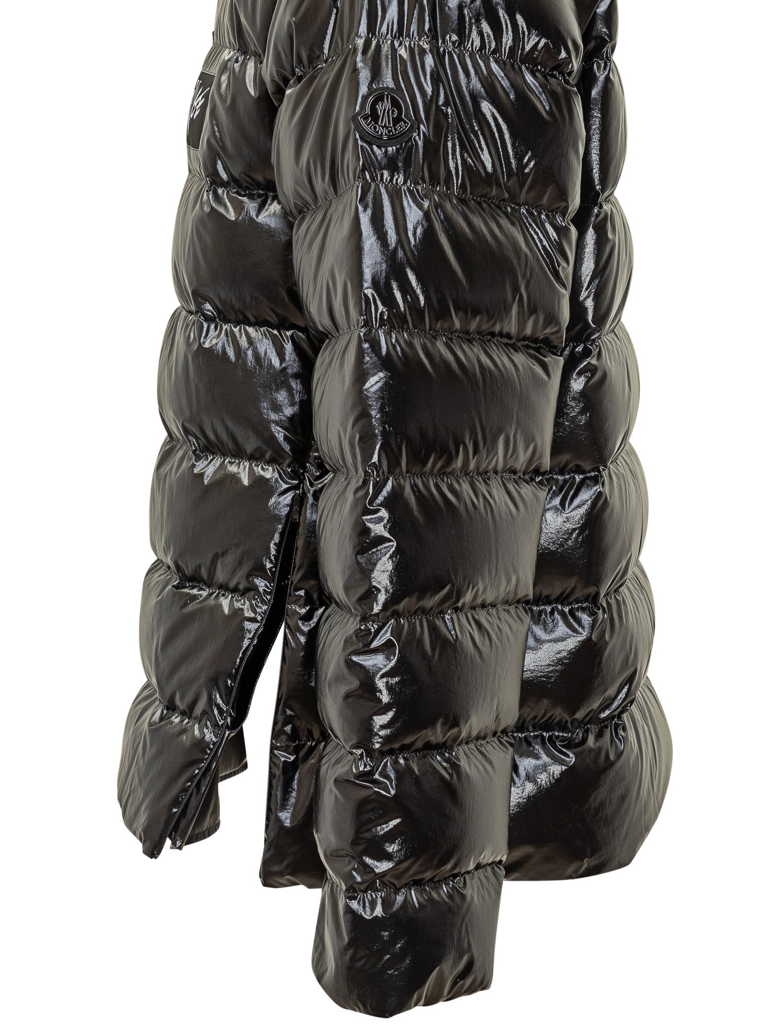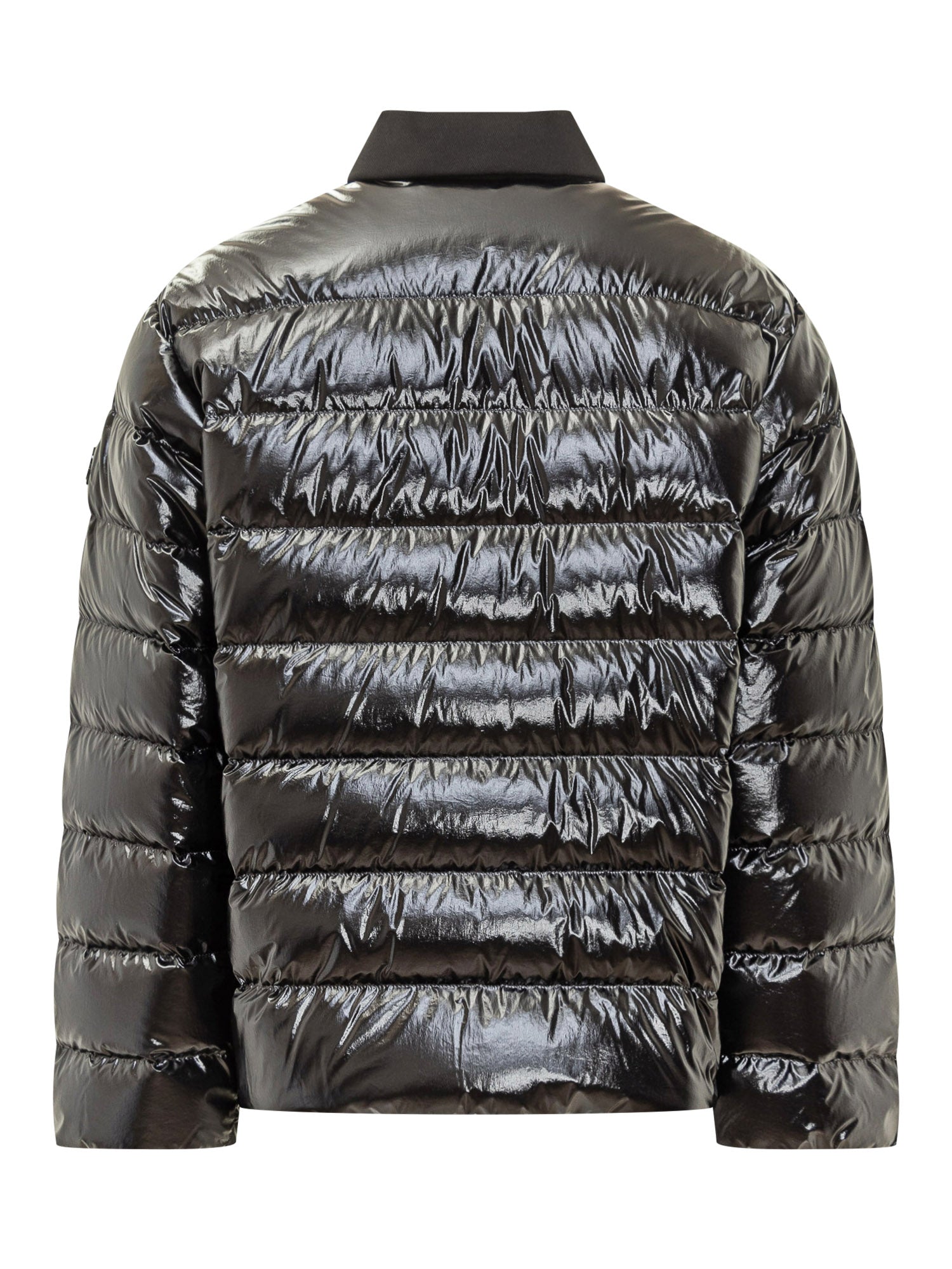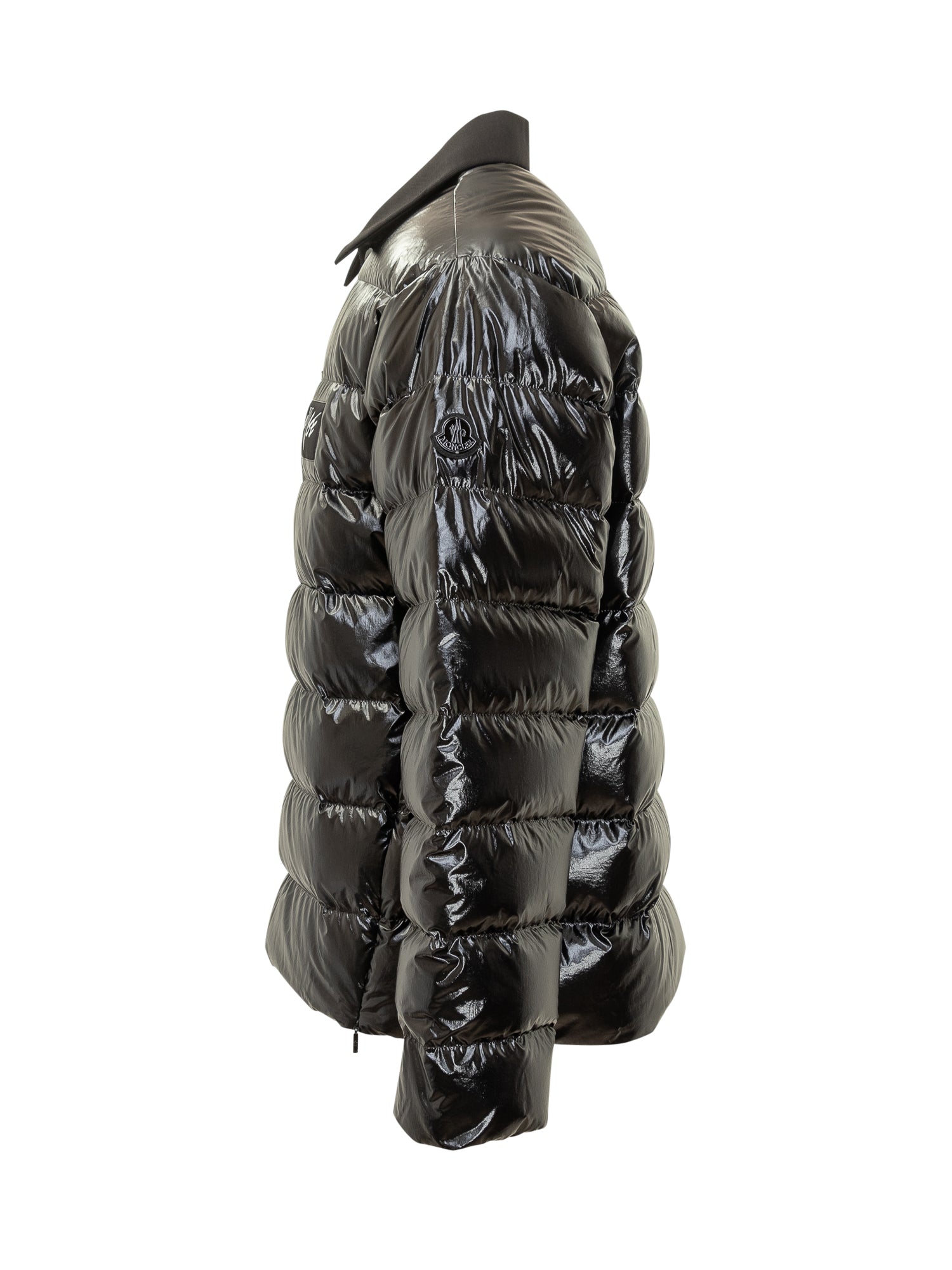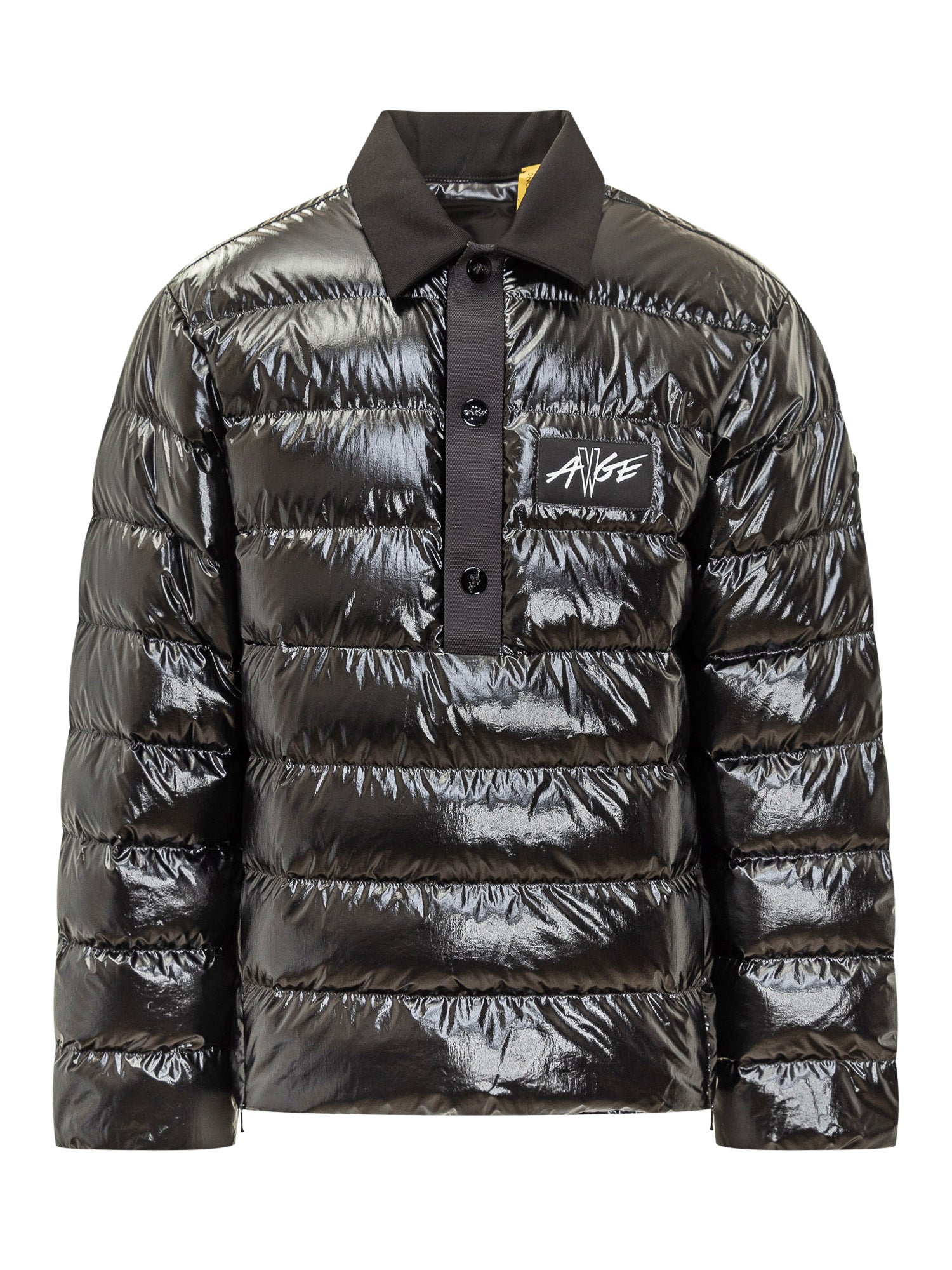 Piumino corto 1 Moncler Genius Asap Rocky in nylon lucido nero, con chiusura a bottoni, colletto a contrasto e logo applicato sul petto. Linea moderna con dettagli laterali a zip.