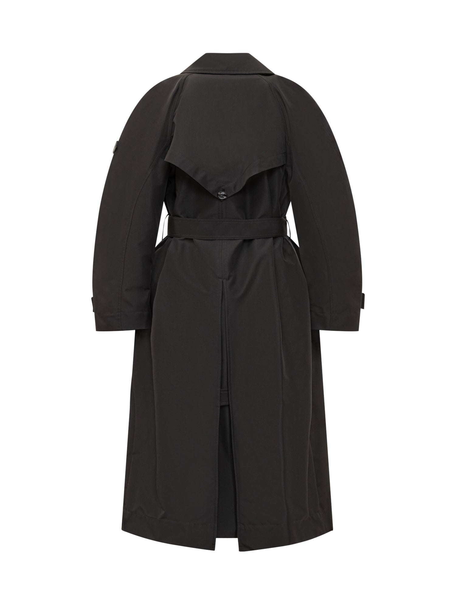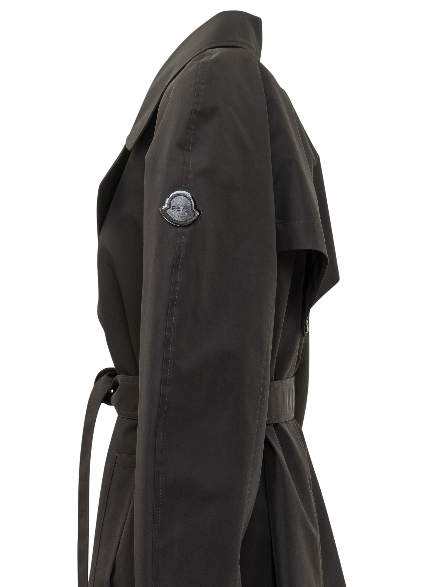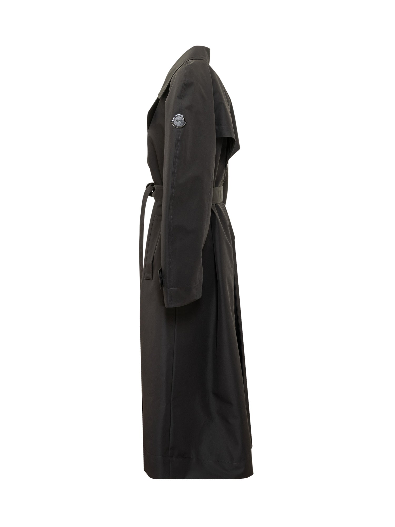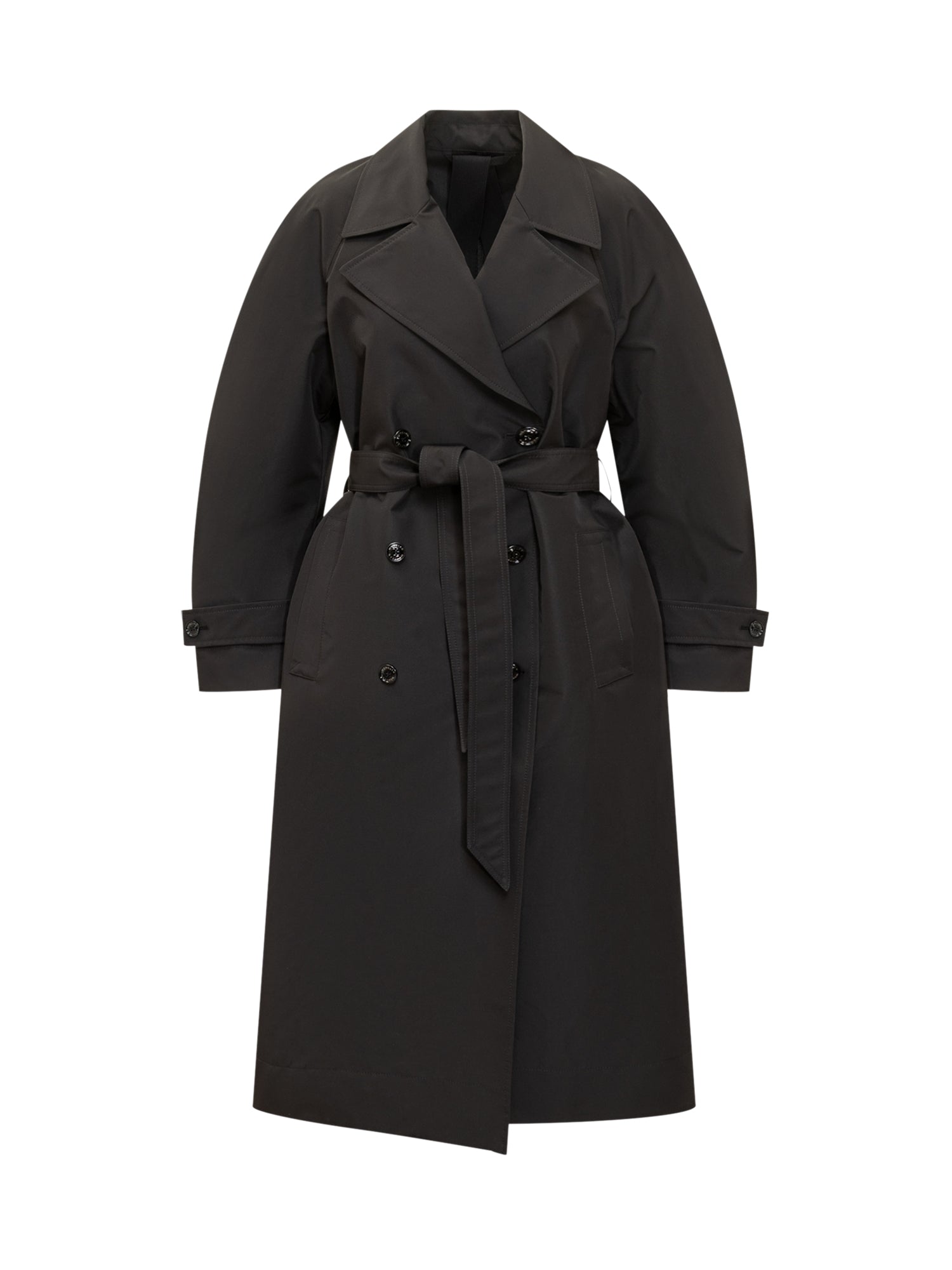 Elegante e senza tempo, il trench nero doppiopetto 4 Moncler Edward Enninful con cintura in vita e revers ampi è il capo must-have per look versatili.