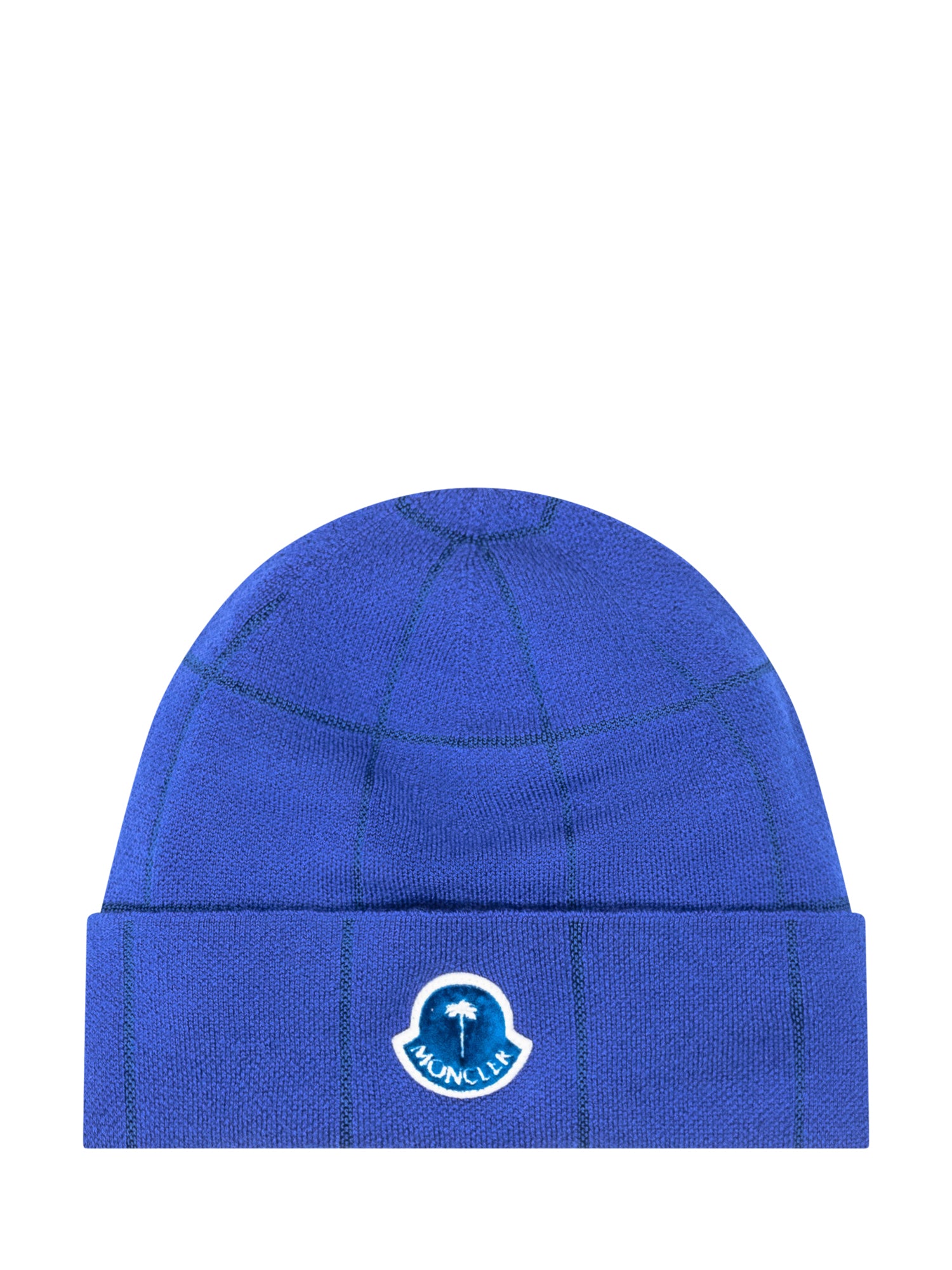 Berretto blu a quadri jacquared. Patch logo Palm e Moncler sul risvolto davanti.