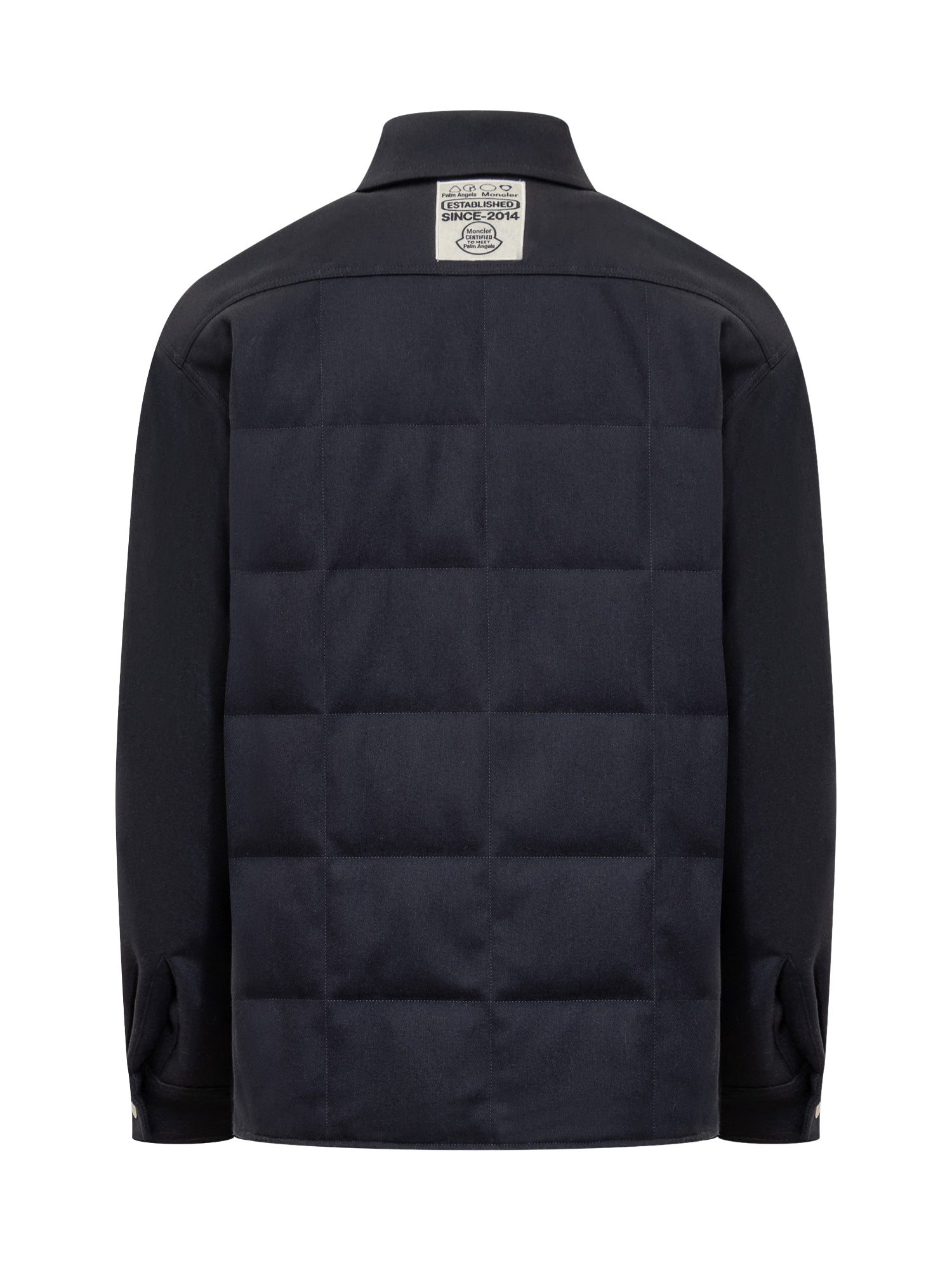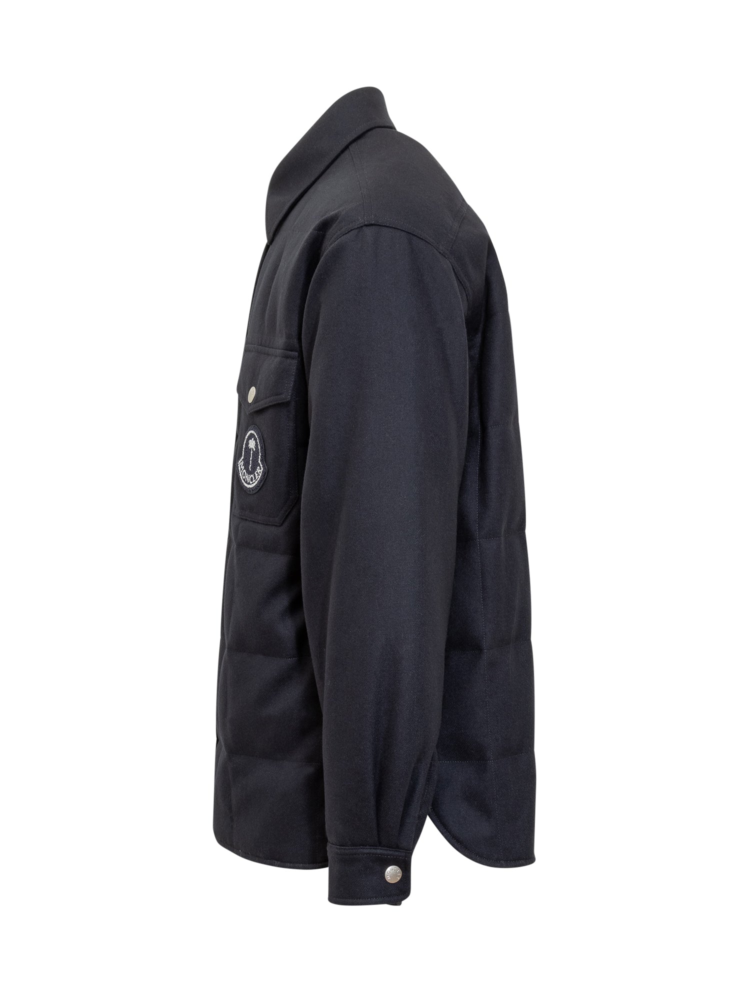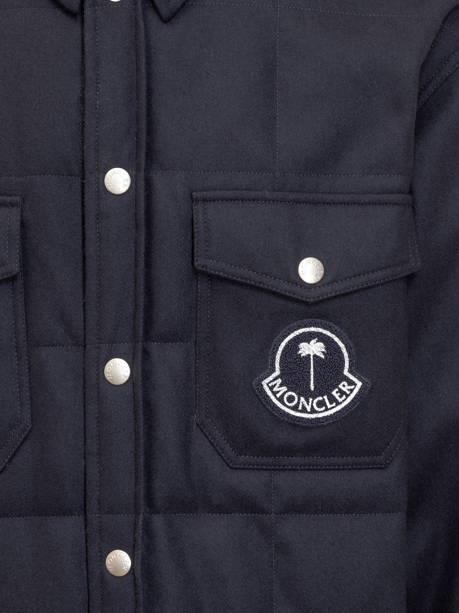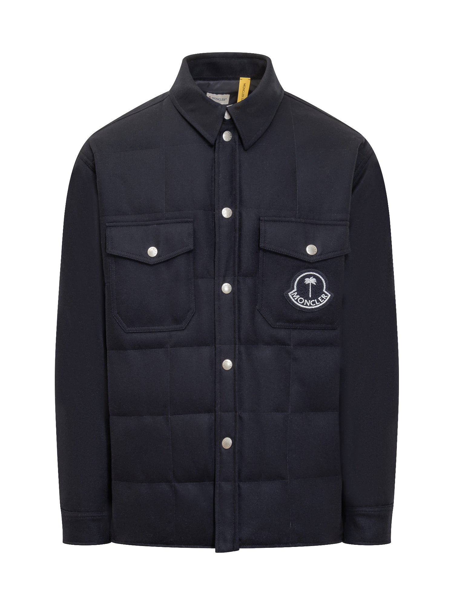 Camicia imbottita blu. Chiusura con automatici. Tasche con patta. Patch di spugna con palma e Moncler. Polsini con bottoni automatici.