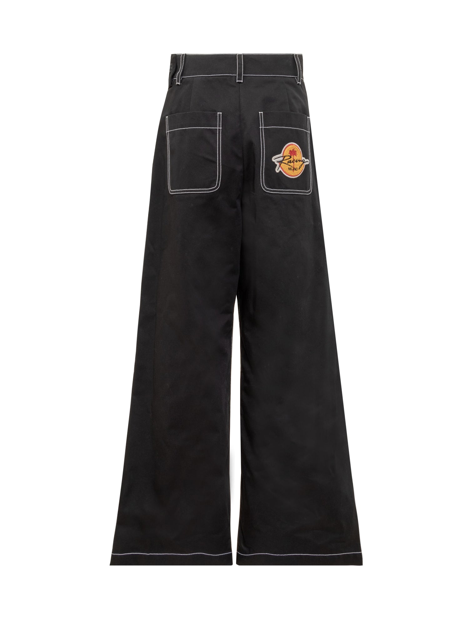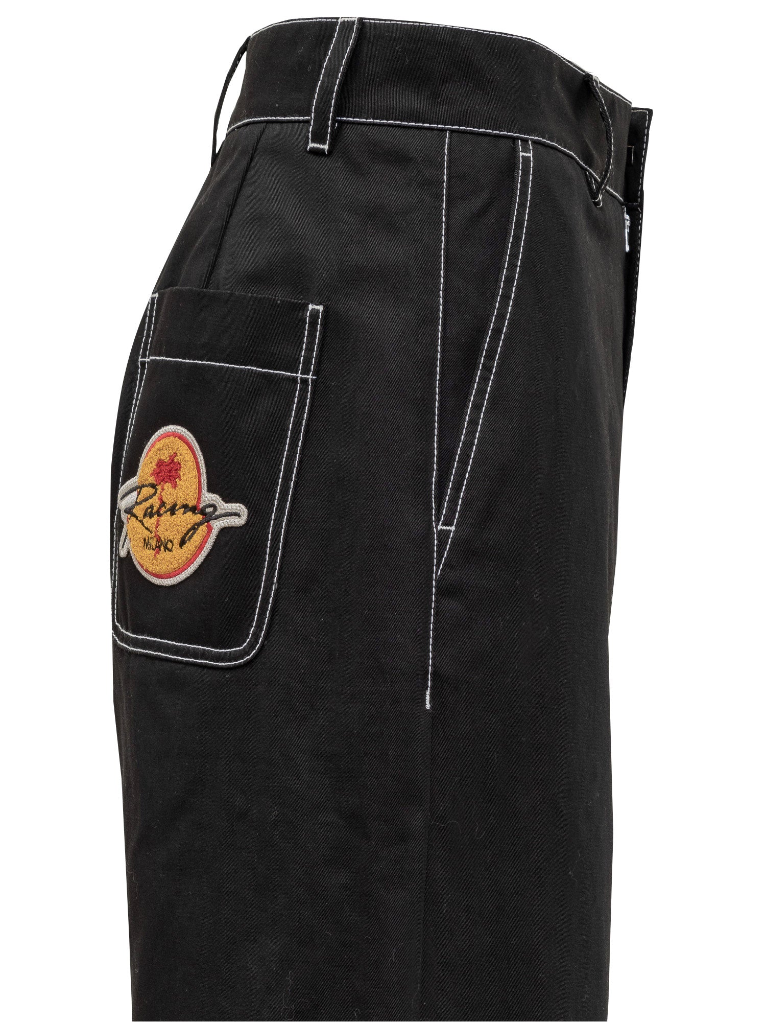 Pantaloni neri. Vestibilità ampia. Cuciture a contrasto. Bandiera italiana e Palm Angels ricamata. Patch a scacchi sul retro. Chiusura con bottone, gancio e zip.