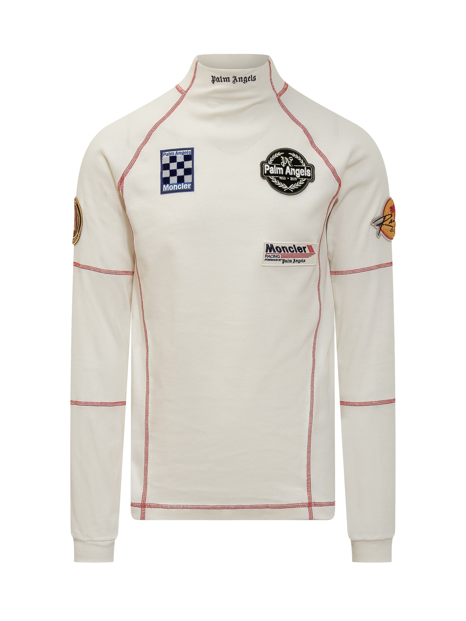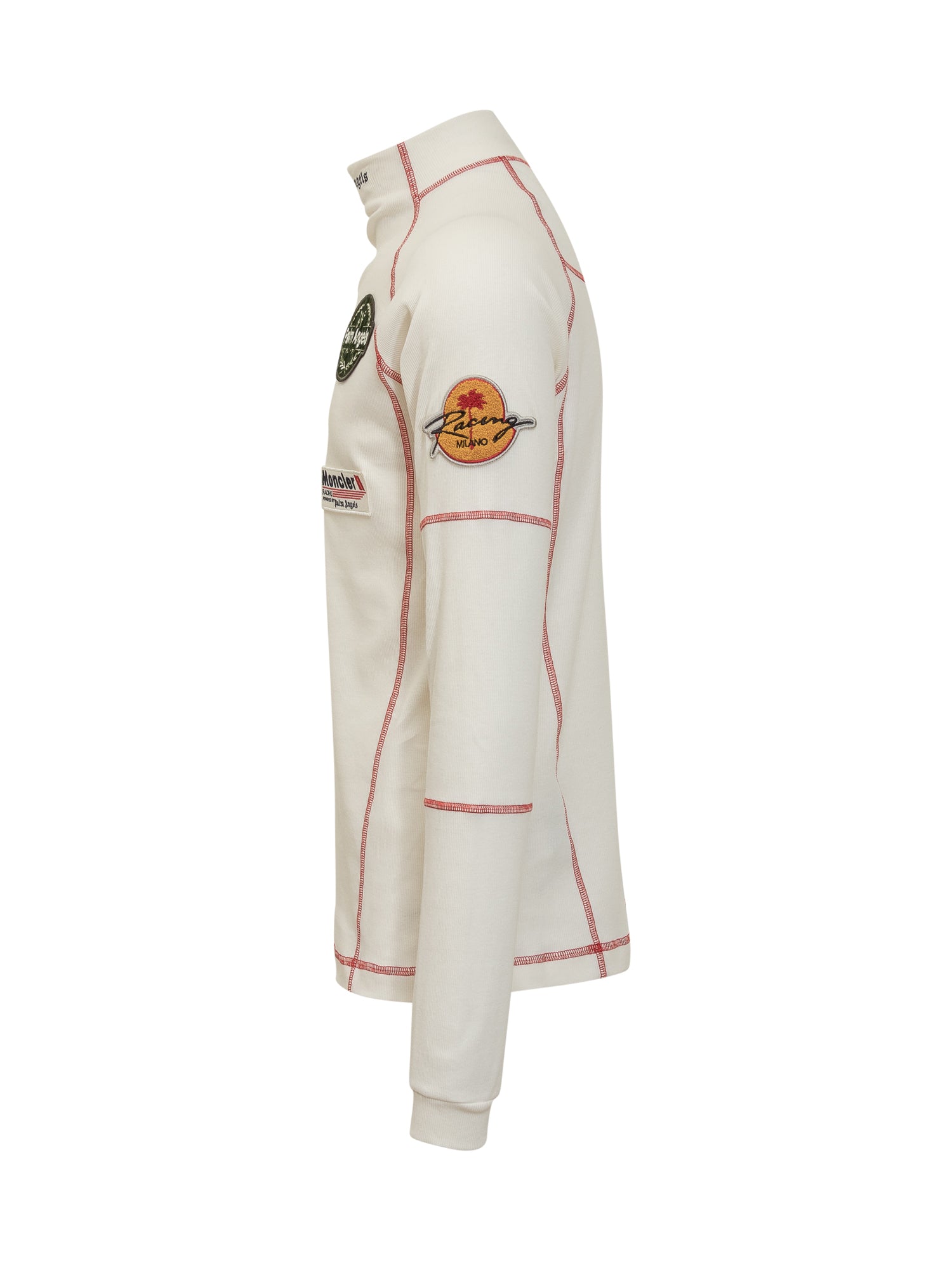 T-shirt bianca collo alto. Maniche lunghe. Scritte sul davanti. Patch sul davanti e sulle maniche. Cuciture a contrasto.