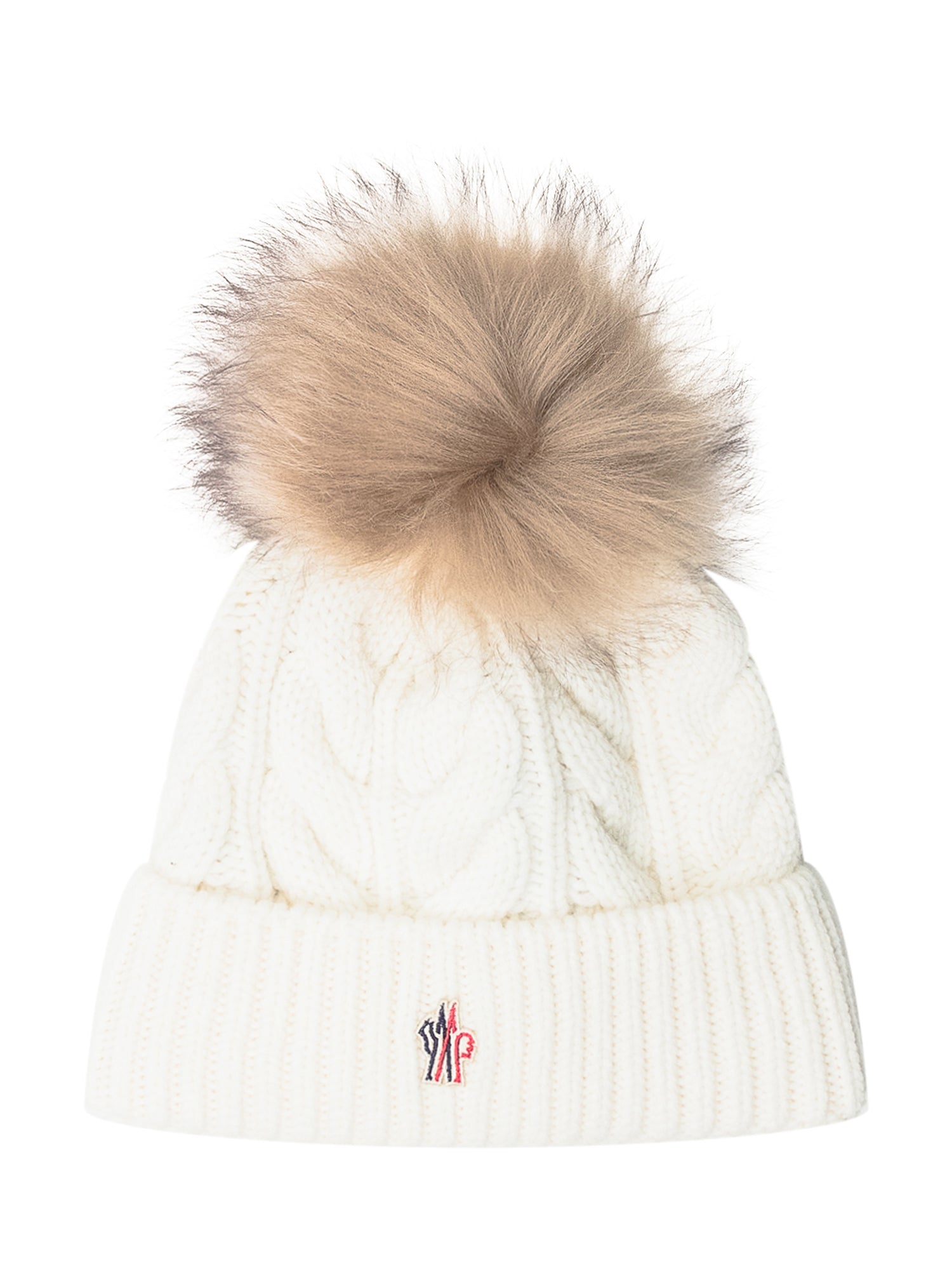 Cappello Moncler Grenoble in lana bianca con pompon in pelliccia e logo frontale.