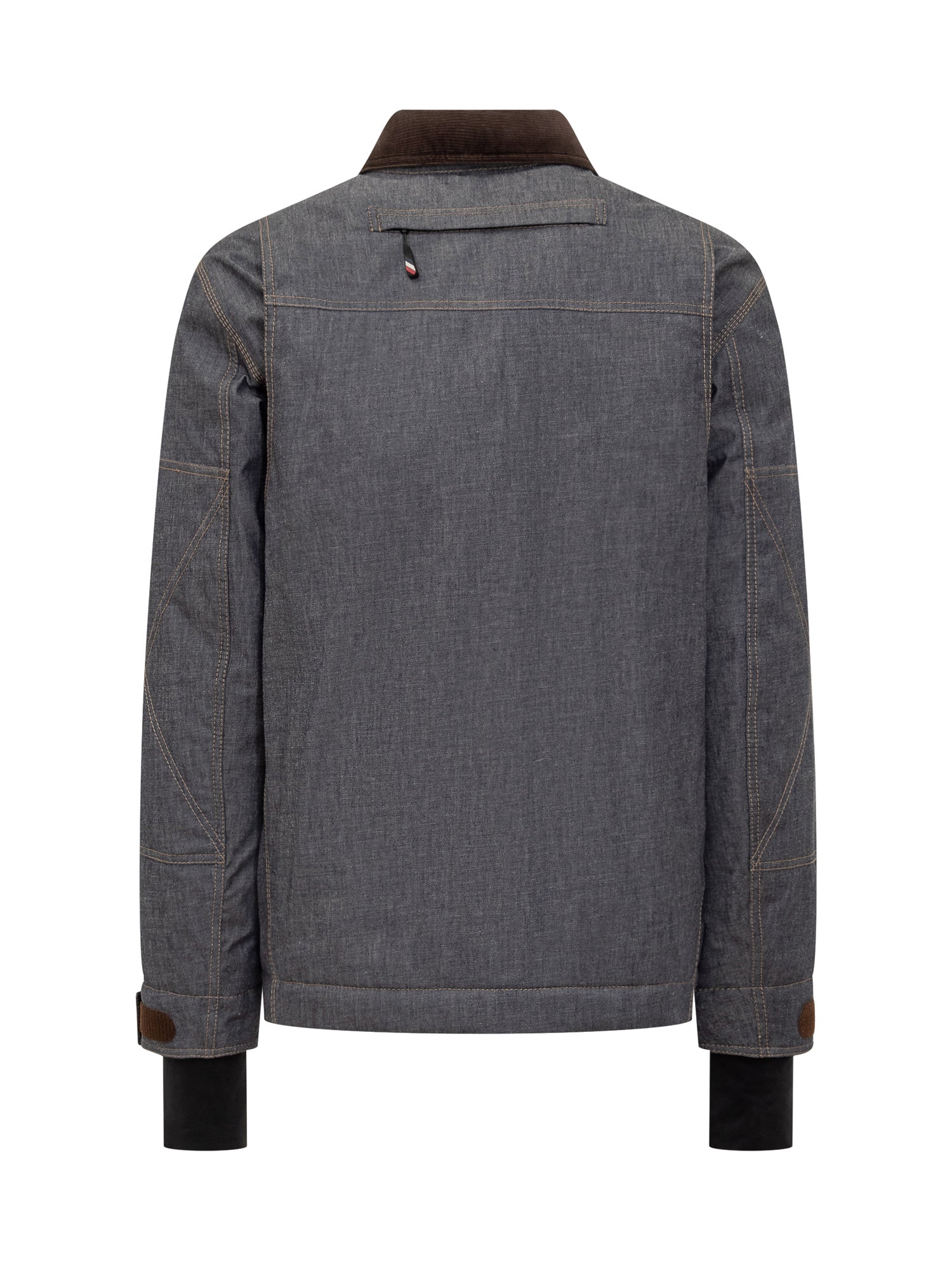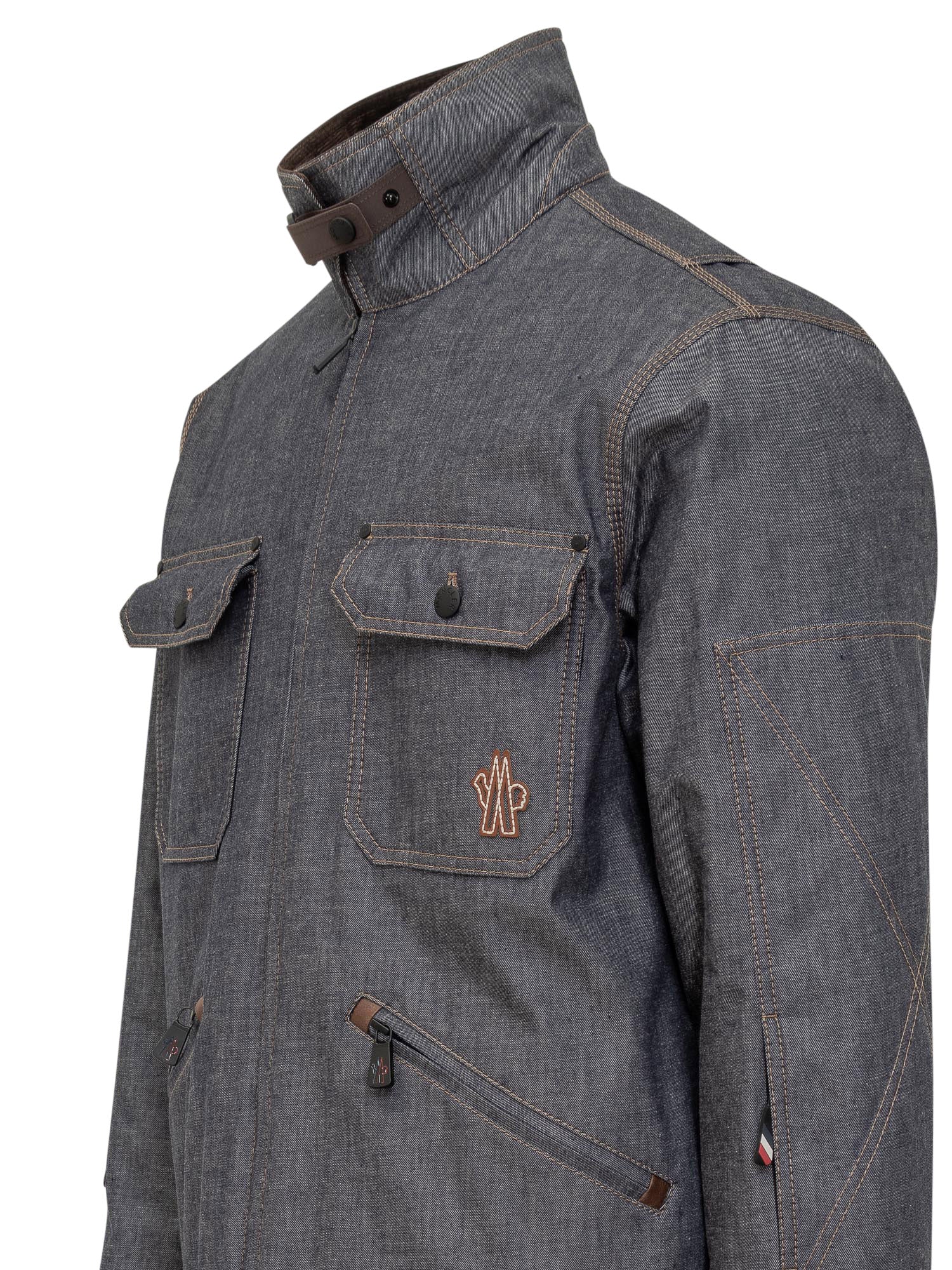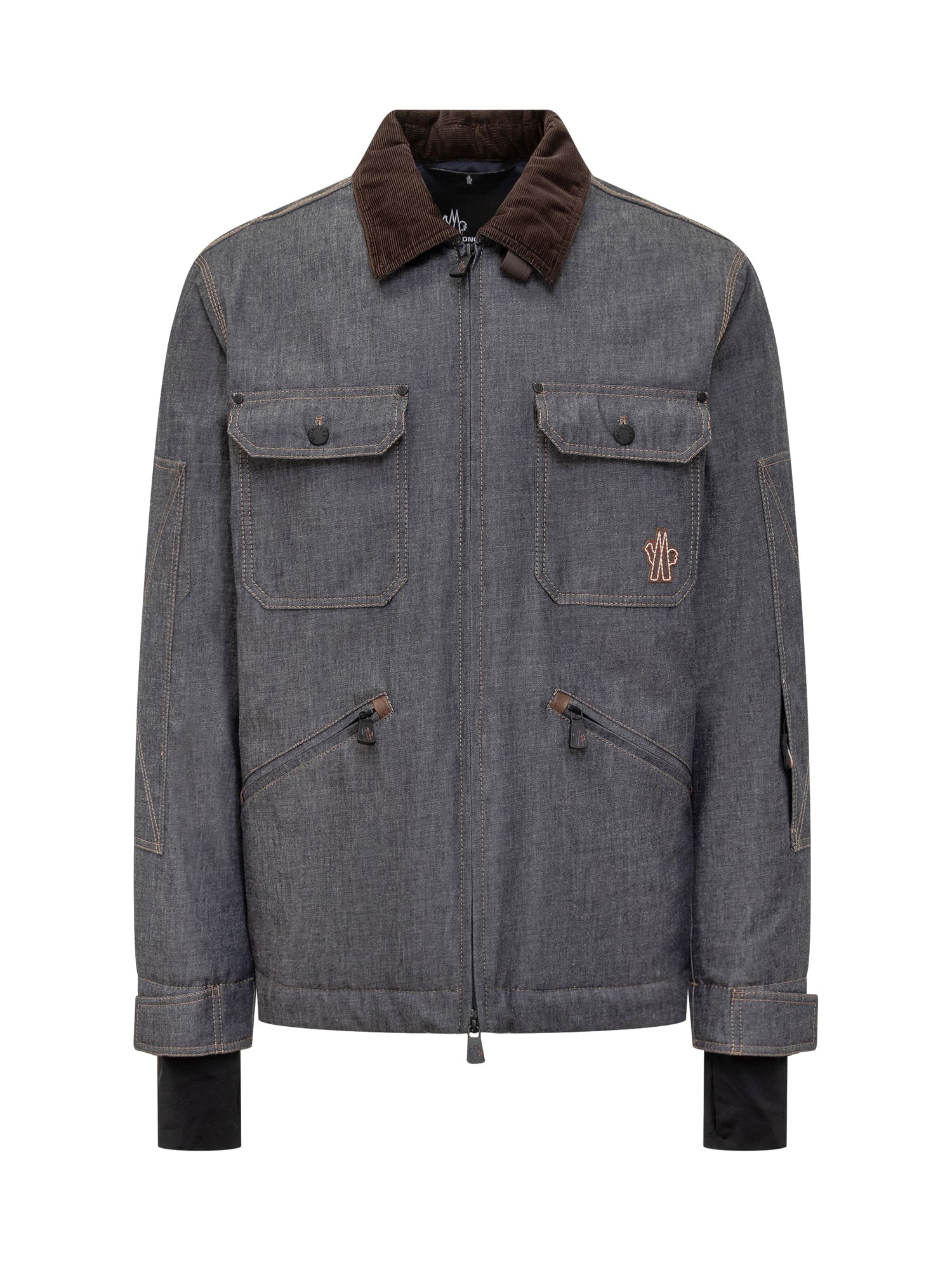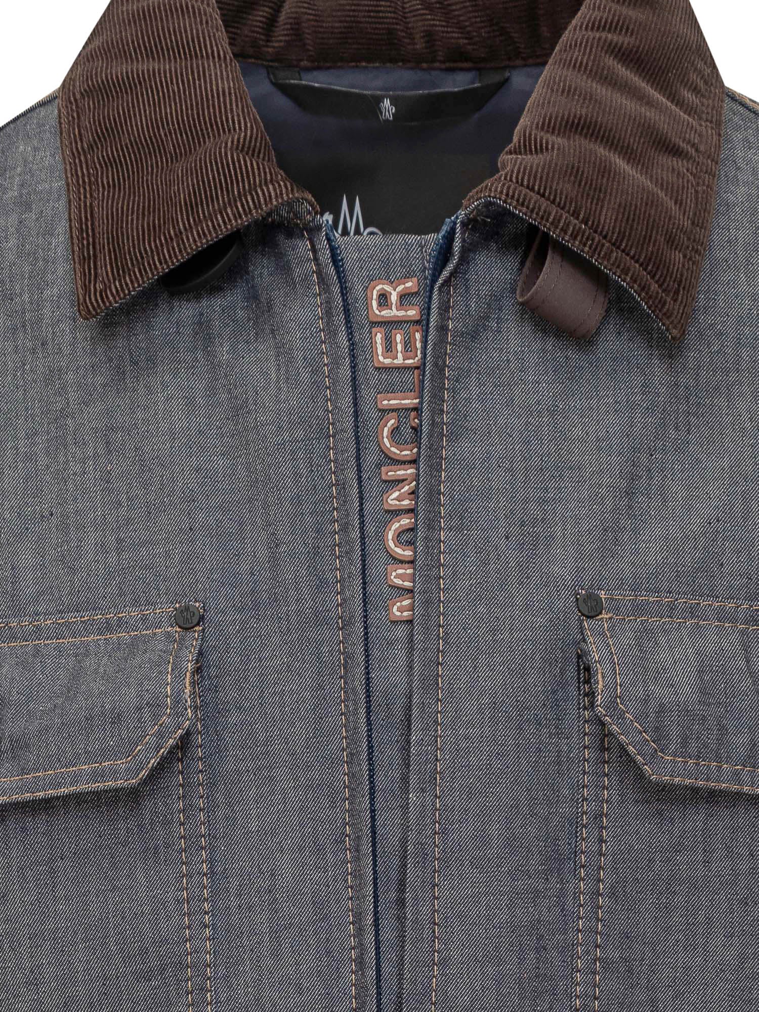 Giacca Moncler Grenoble Croatan in tessuto tecnico effetto denim con colletto in velluto a coste e chiusura a zip. Design funzionale con tasche multiple e logo ricamato sul petto.