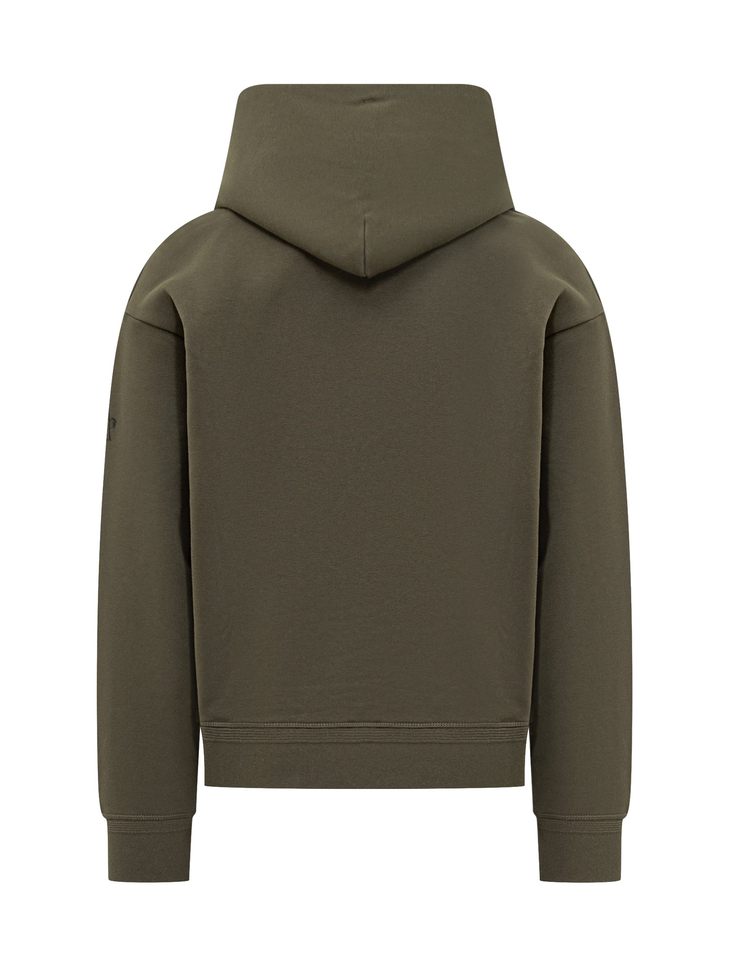 Felpa Moncler Grenoble verde con cappuccio regolabile, patch montagna sul petto e cordoncino intrecciato.