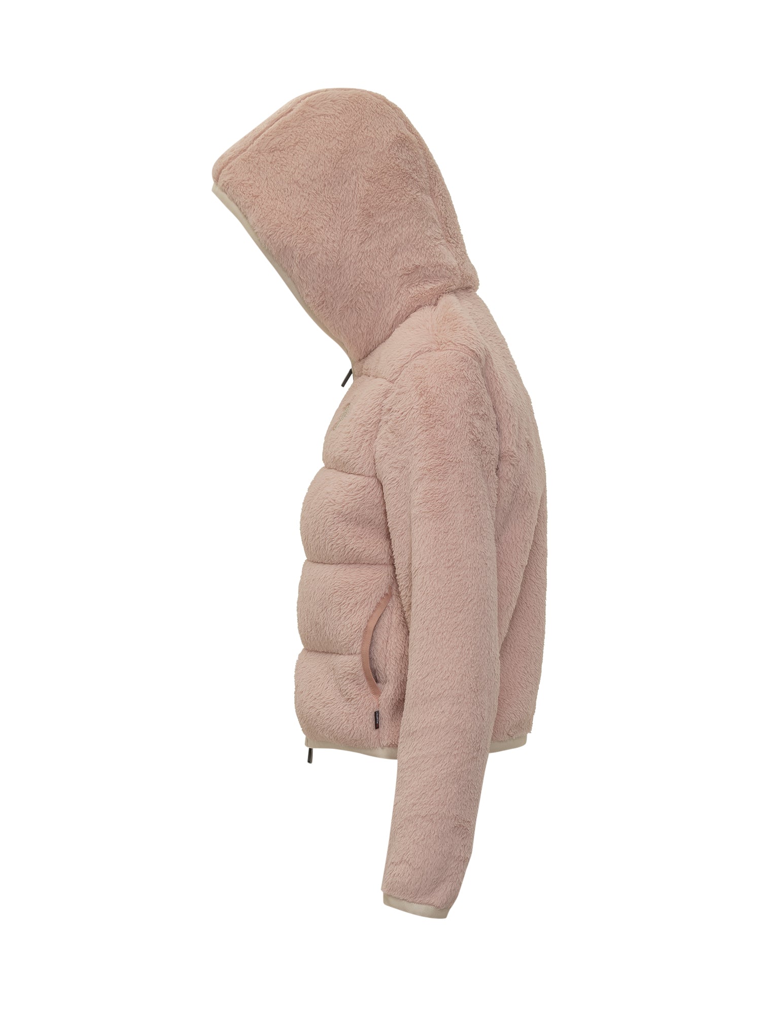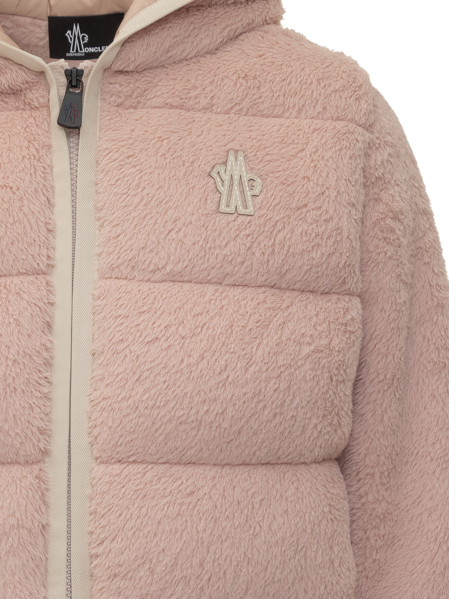 Piumino Moncler Grenoble in rosa con texture effetto peluche e cappuccio imbottito.