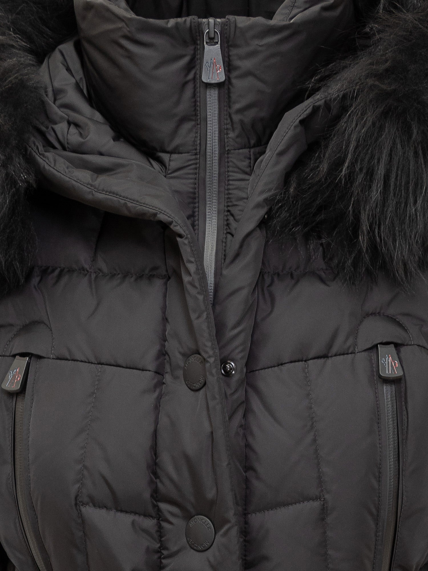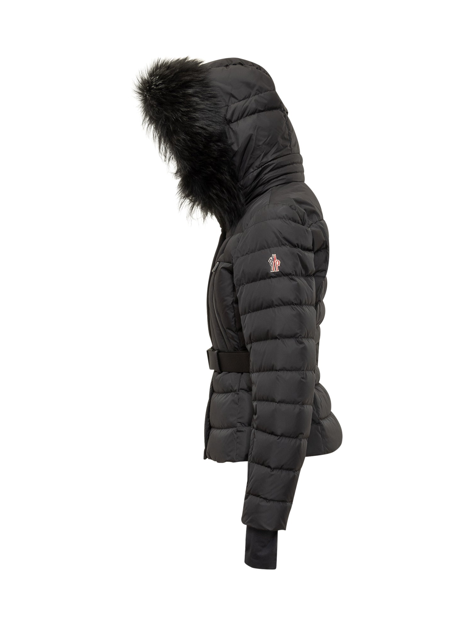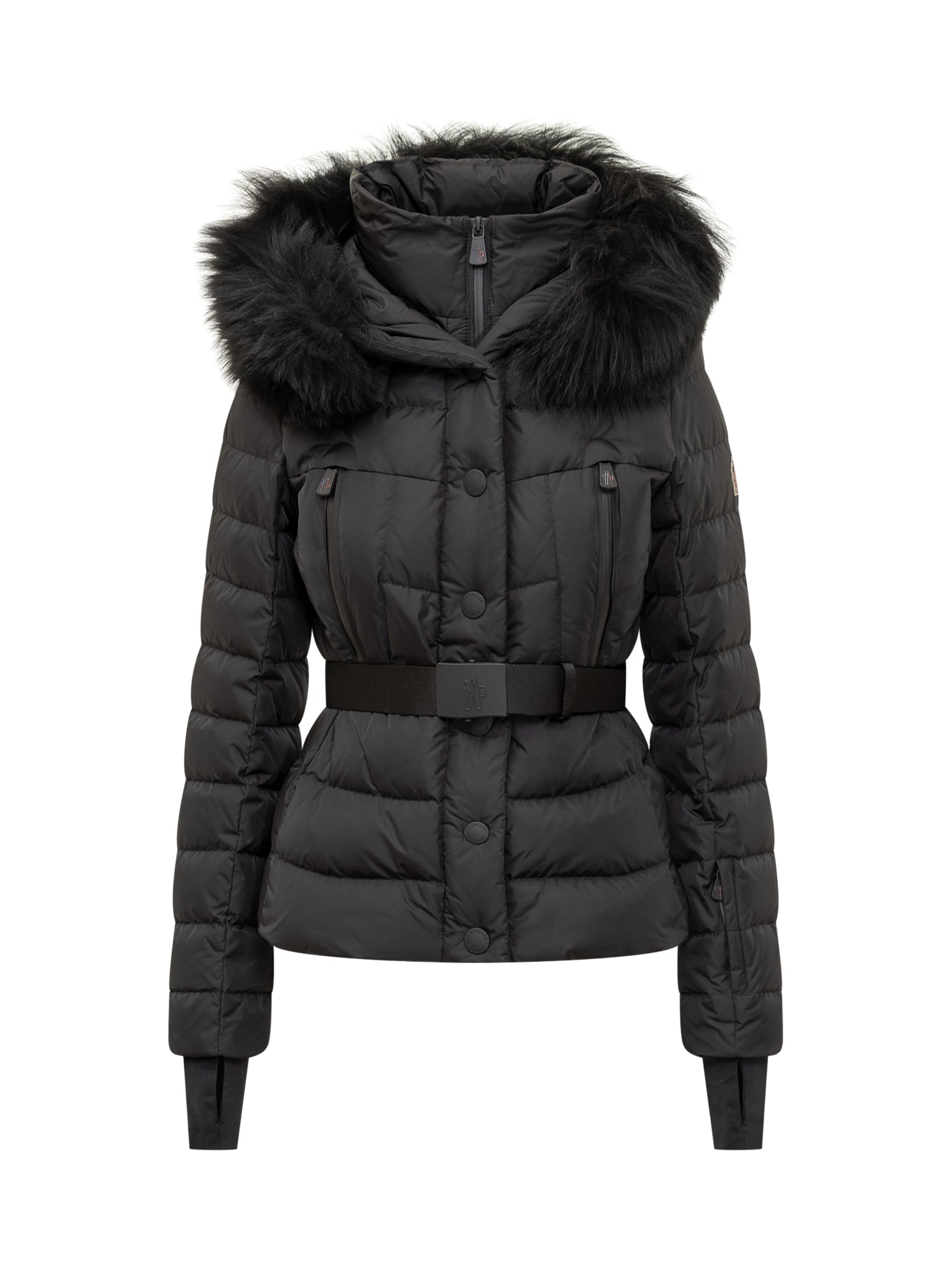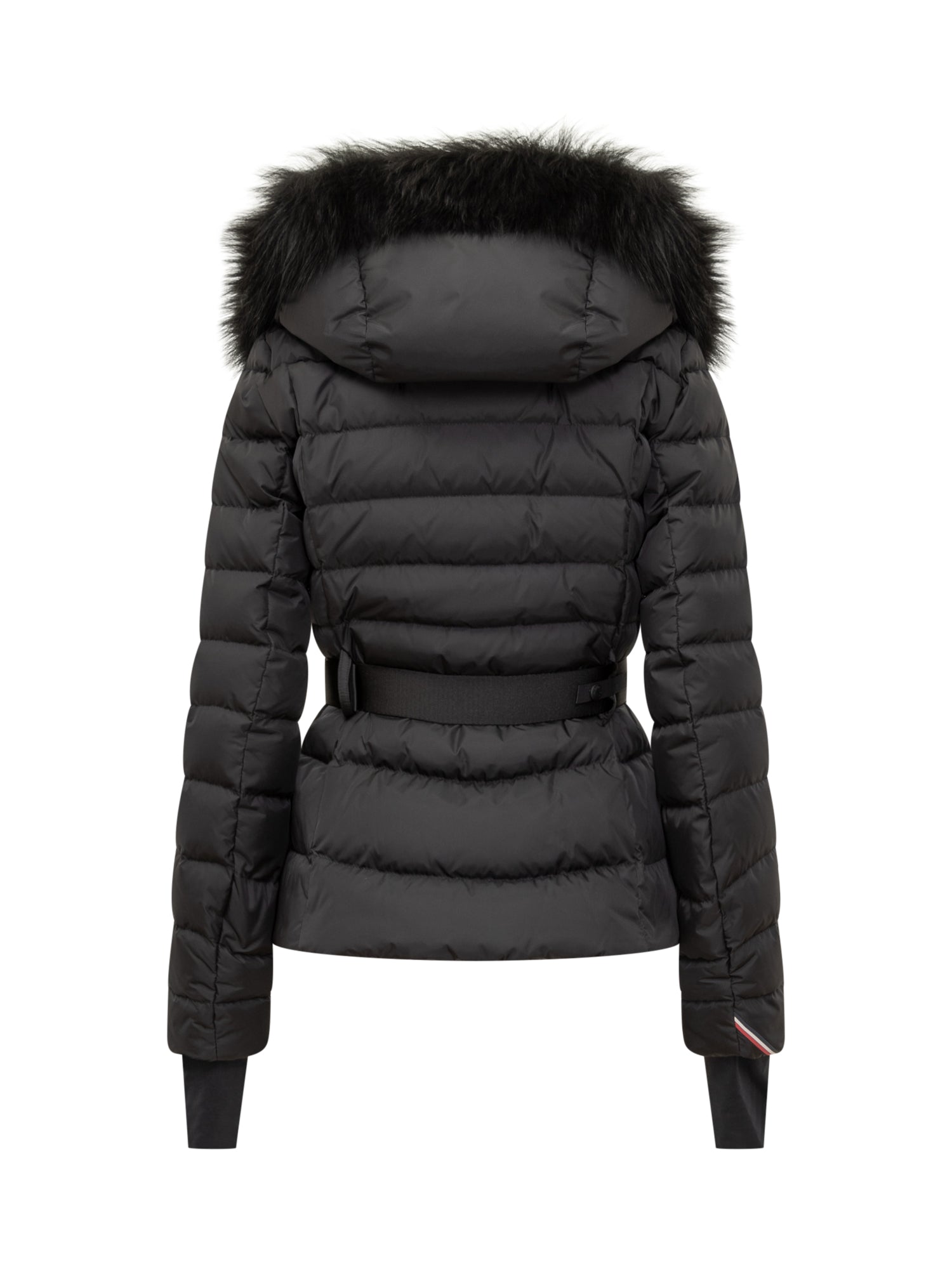 Piumino Moncler nero con imbottitura calda, cappuccio con bordo in pelliccia sintetica e cintura in vita. Chiusura con zip e bottoni.