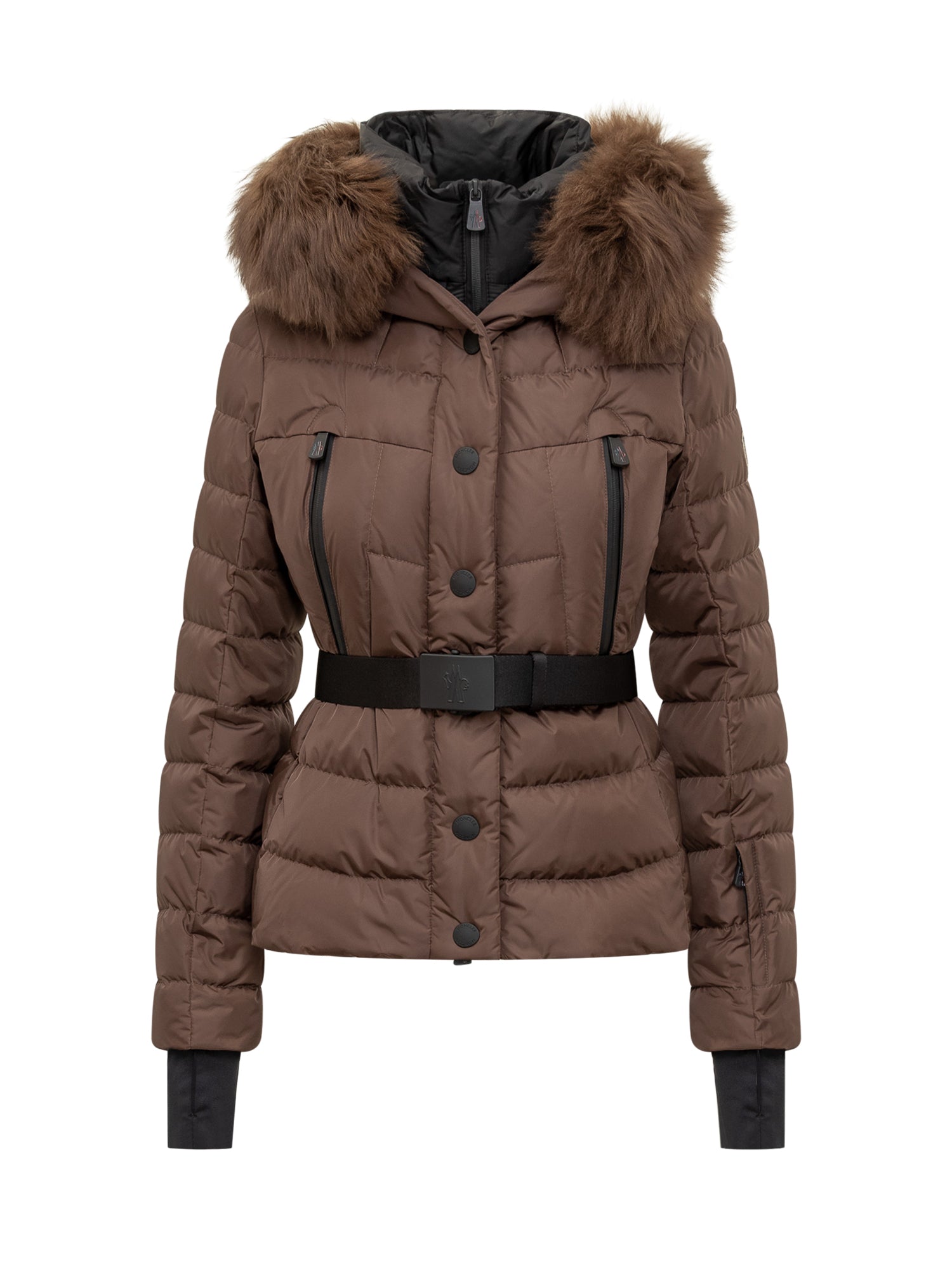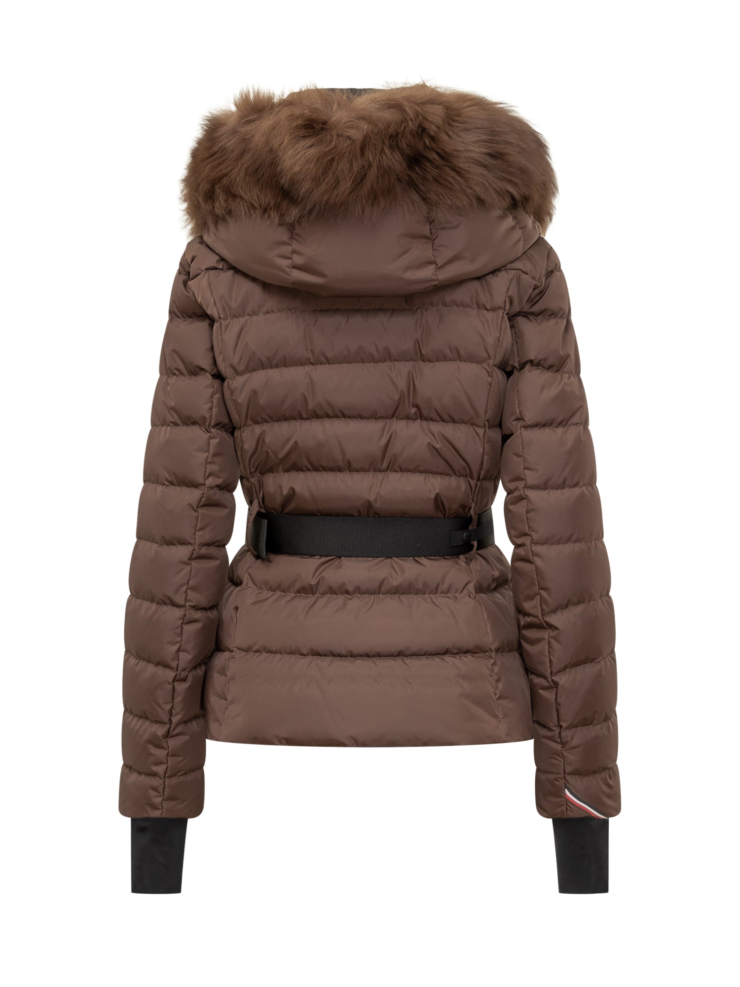 Piumino Moncler marrone con imbottitura calda, cappuccio con bordo in pelliccia sintetica e cintura in vita. Chiusura con zip e bottoni.
