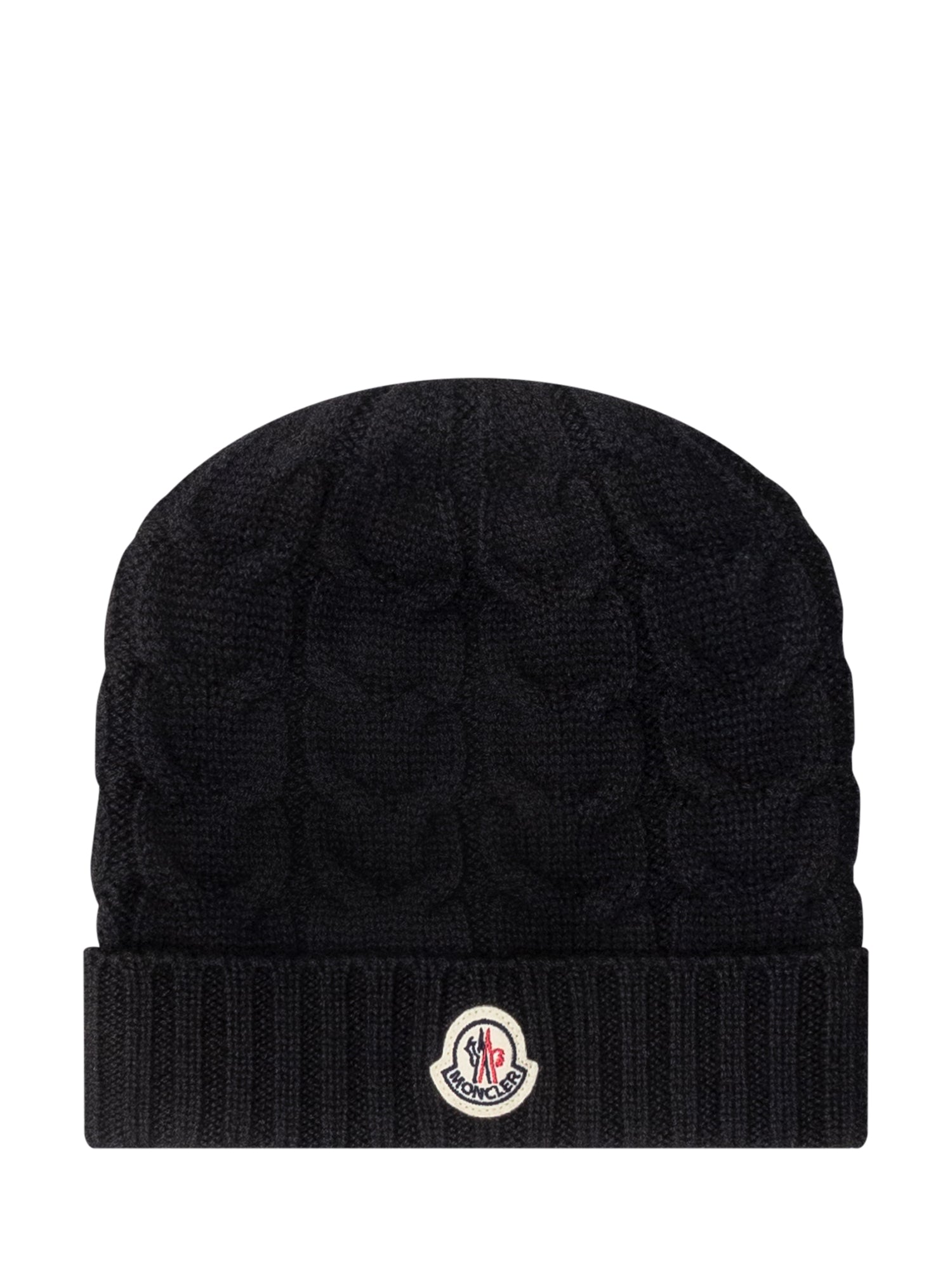 Cappello Moncler in lana nera con lavorazione a trecce e risvolto a costine.