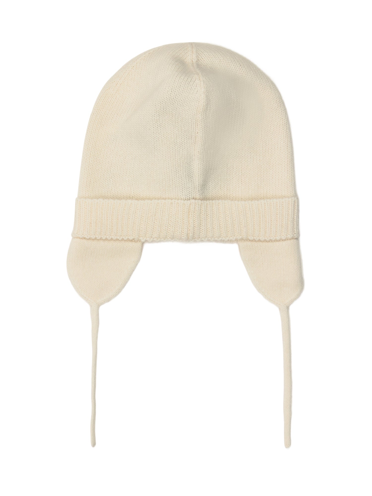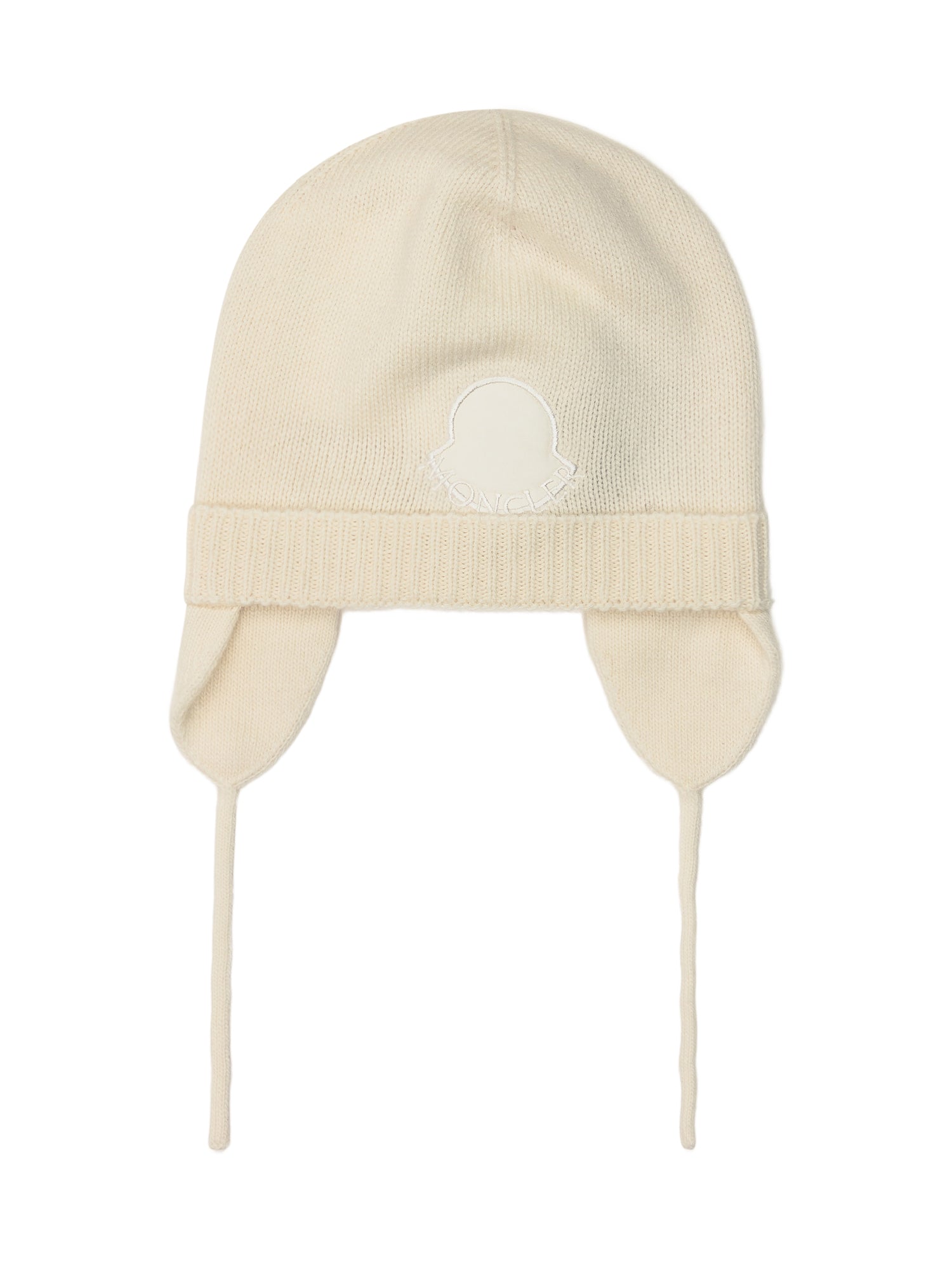 Cuffia bianca a costine. Copri-orecchie con lacci. Logo sul davanti.