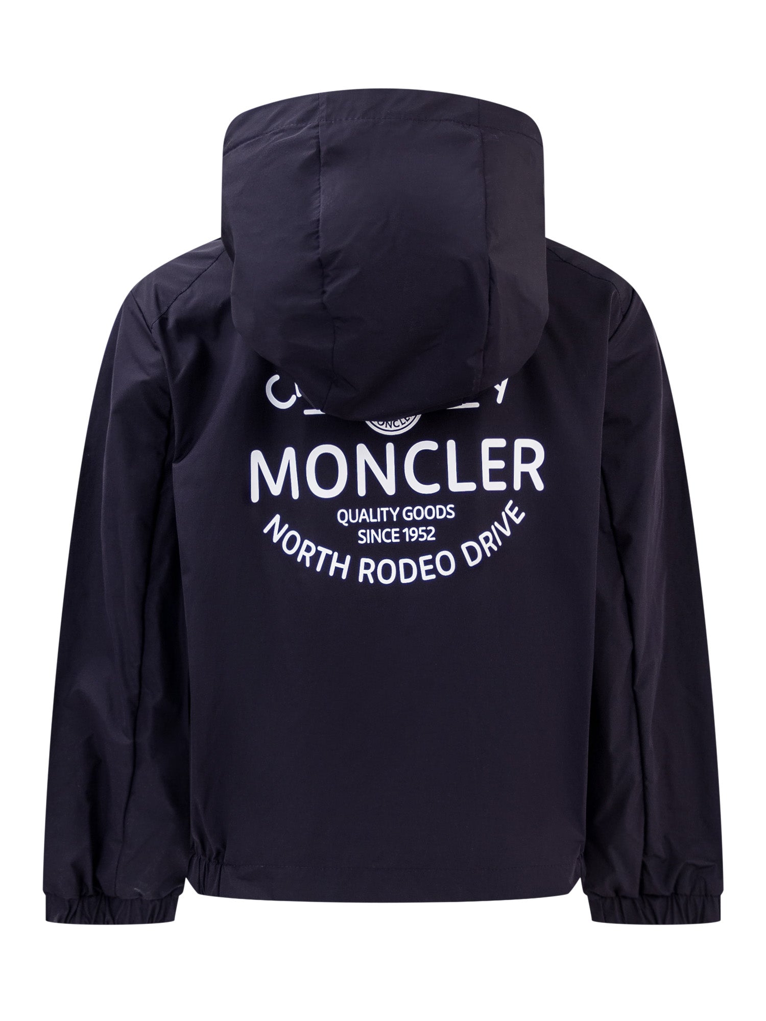 Giacca blu a maniche lunghe con cappuccio. Polsi elasticizzati. Chiusura con zip sul davanti. Tasca frontale con bottone e patch logo. Stampa californiana sul retro.