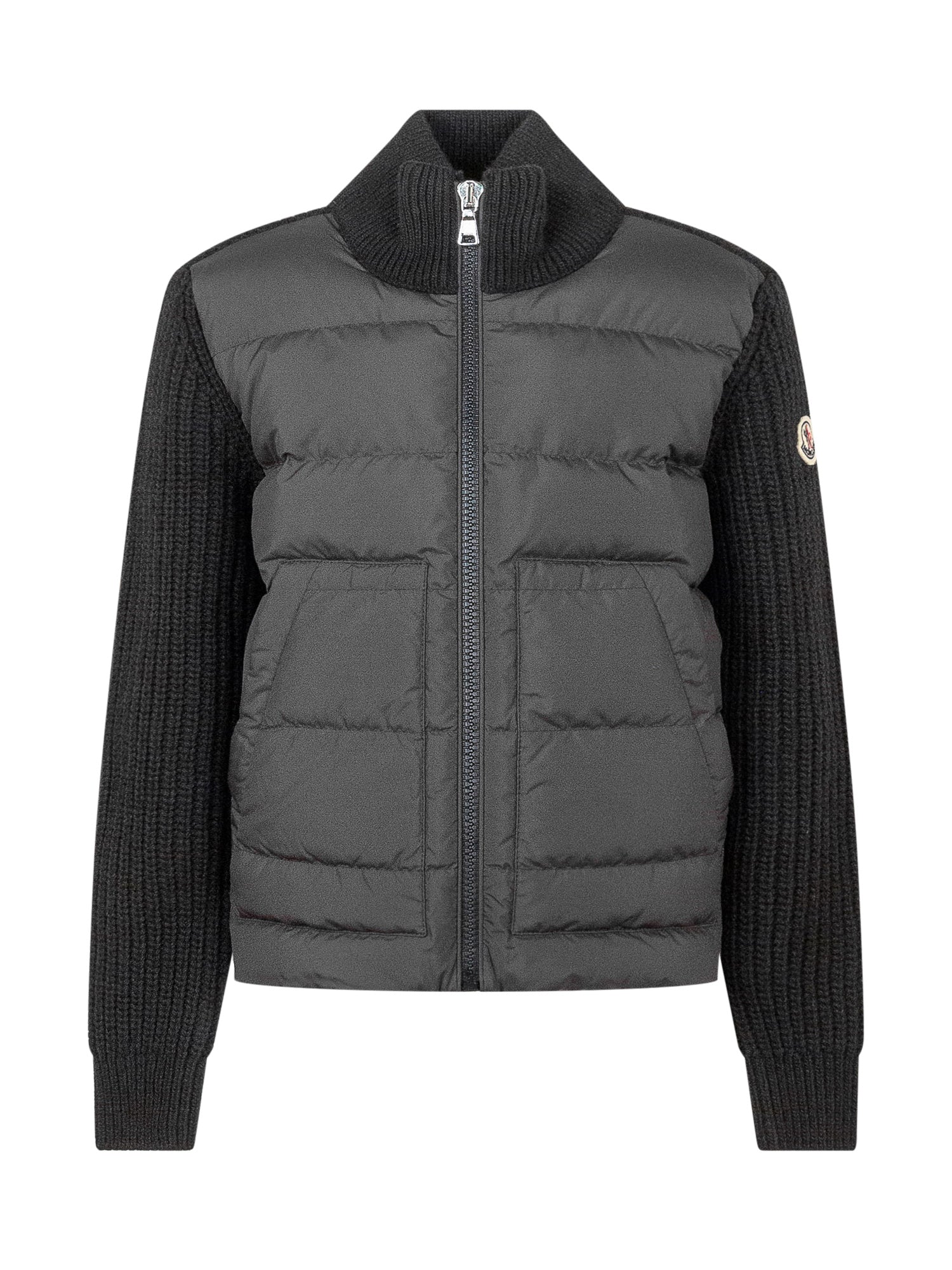 Giacca Moncler Kids con corpo imbottito e maniche in maglia a coste. Chiusura con zip, collo alto e logo sulla manica.