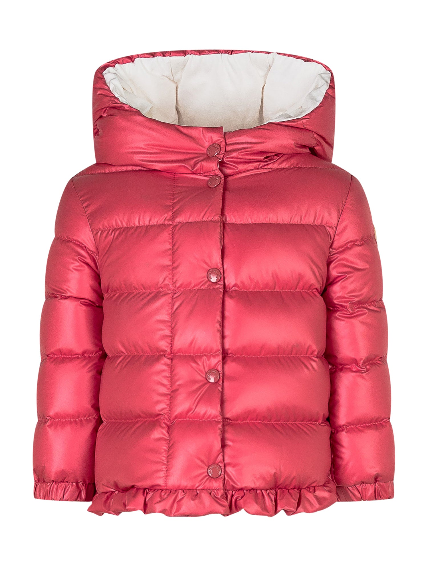 Piumino rosa lucido con cappuccio, chiusura a bottoni e raffinato dettaglio volant sul fondo.
