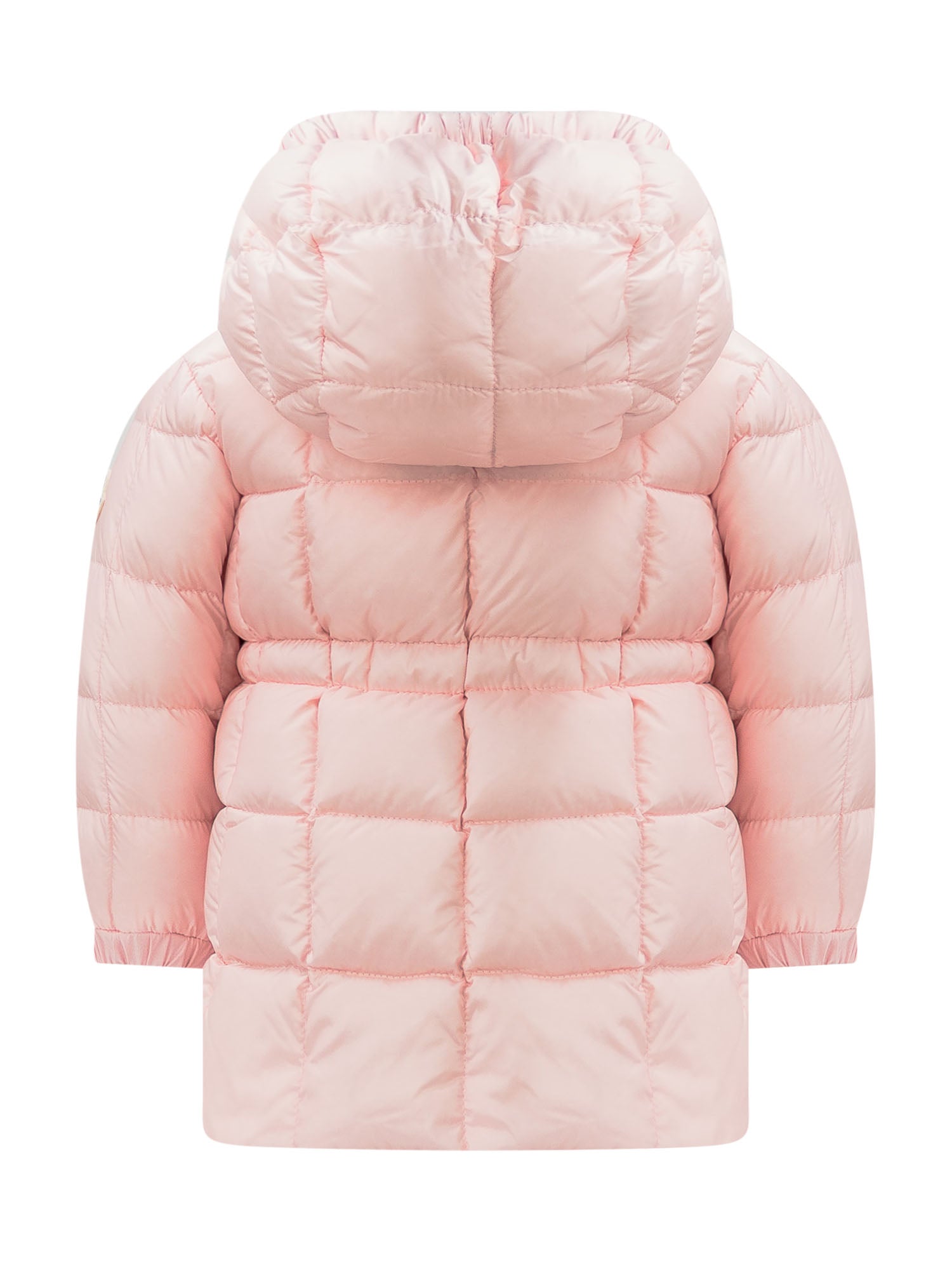 Piumino rosa a maniche lunghe. Cappuccio con elastico. Chiusura frontale con zip. Logo ricamato sulla manica. Elastico ai polsi. Trapuntato.