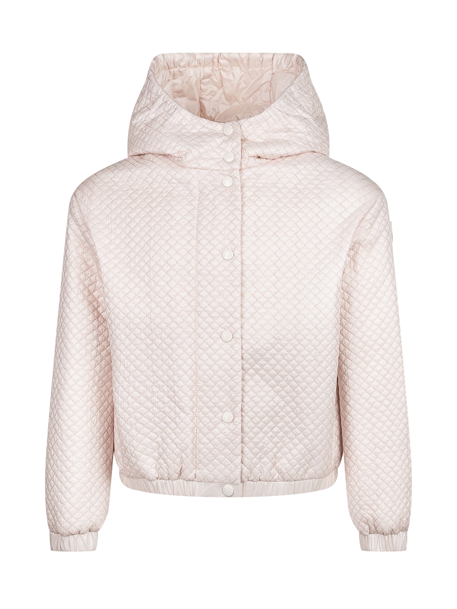 Piumino rosa con cappuccio. Chiusura con zip e bottoni. Tasche con zip. Orlo e polsi elasticizzati.