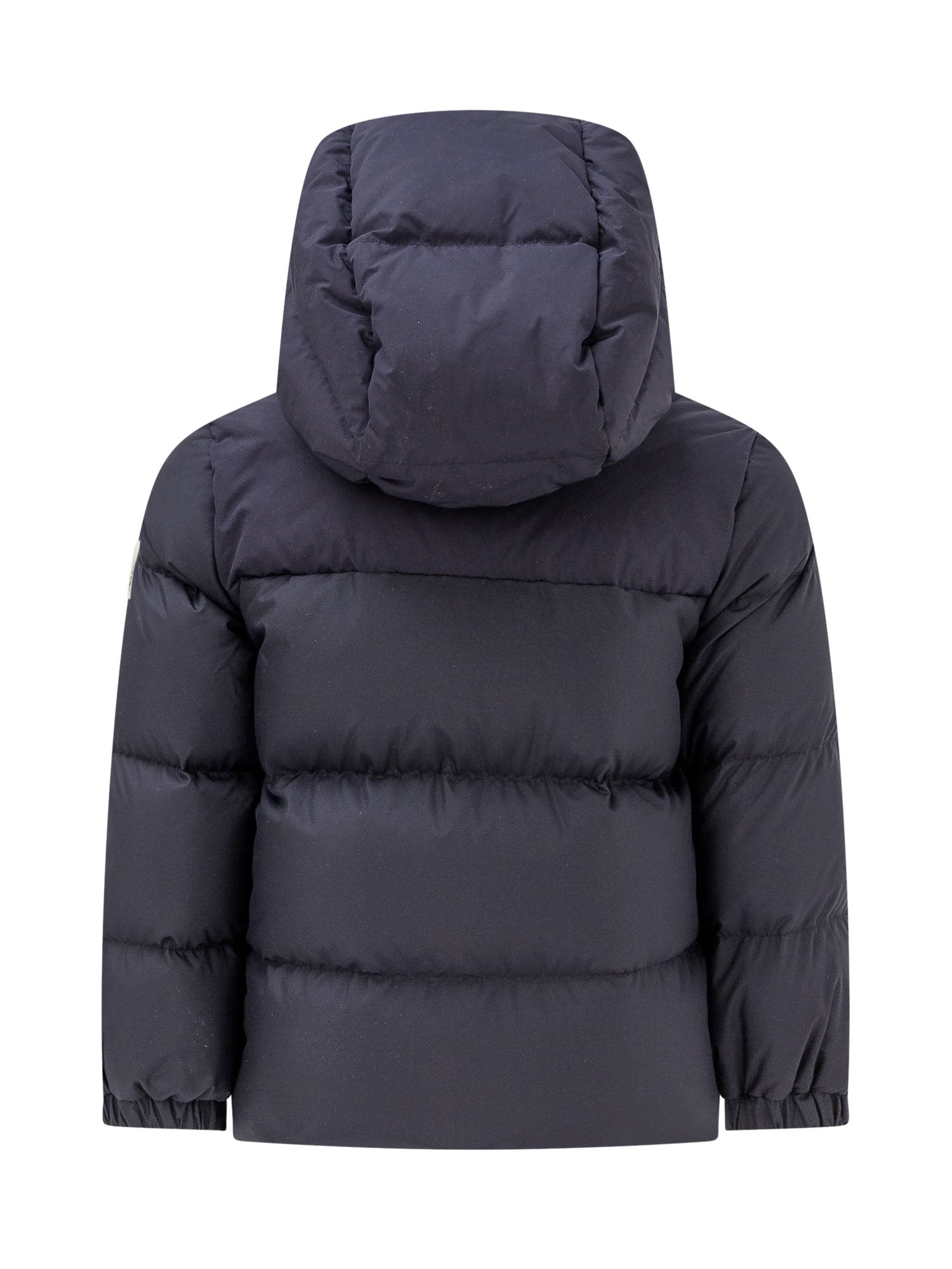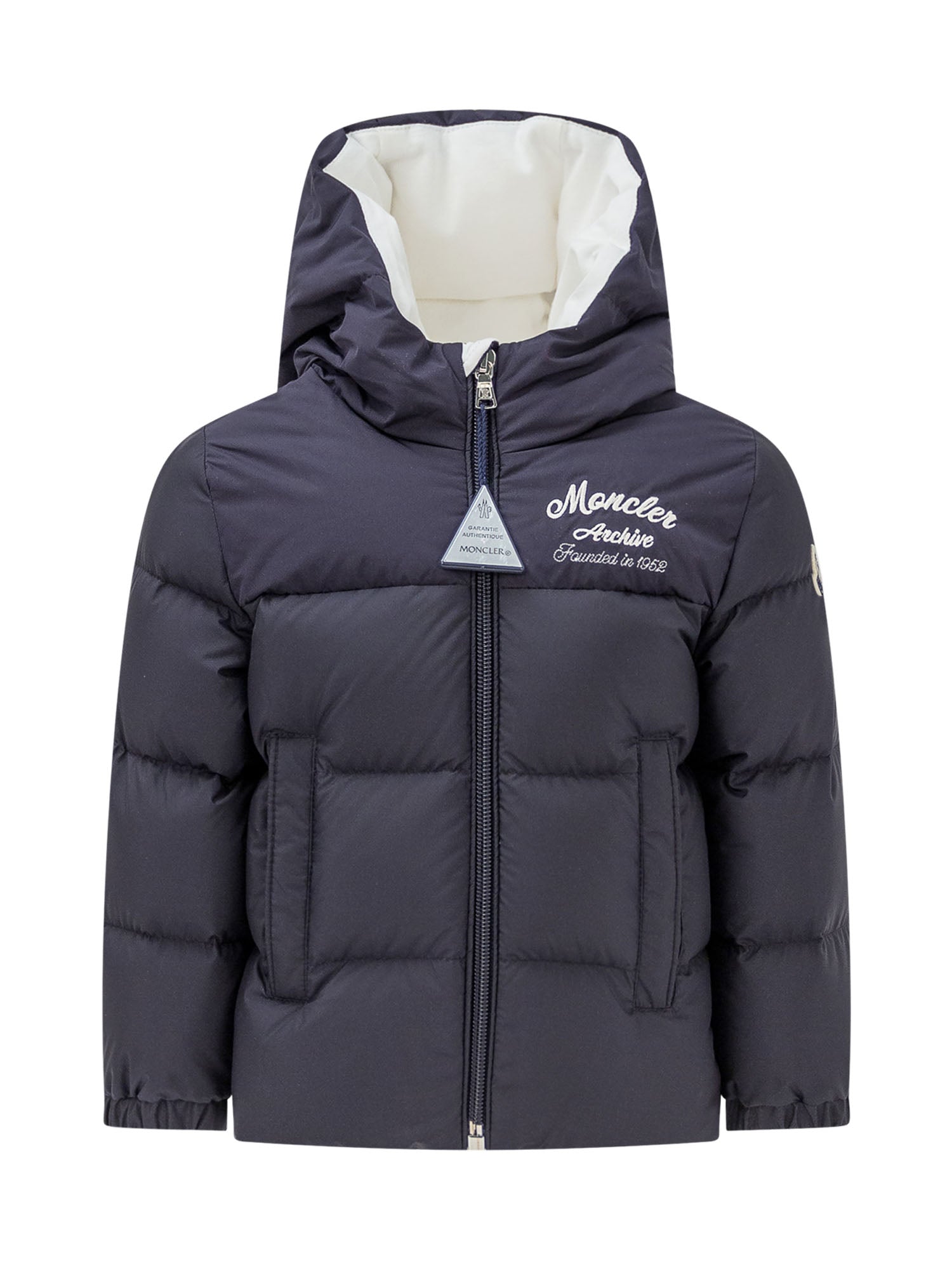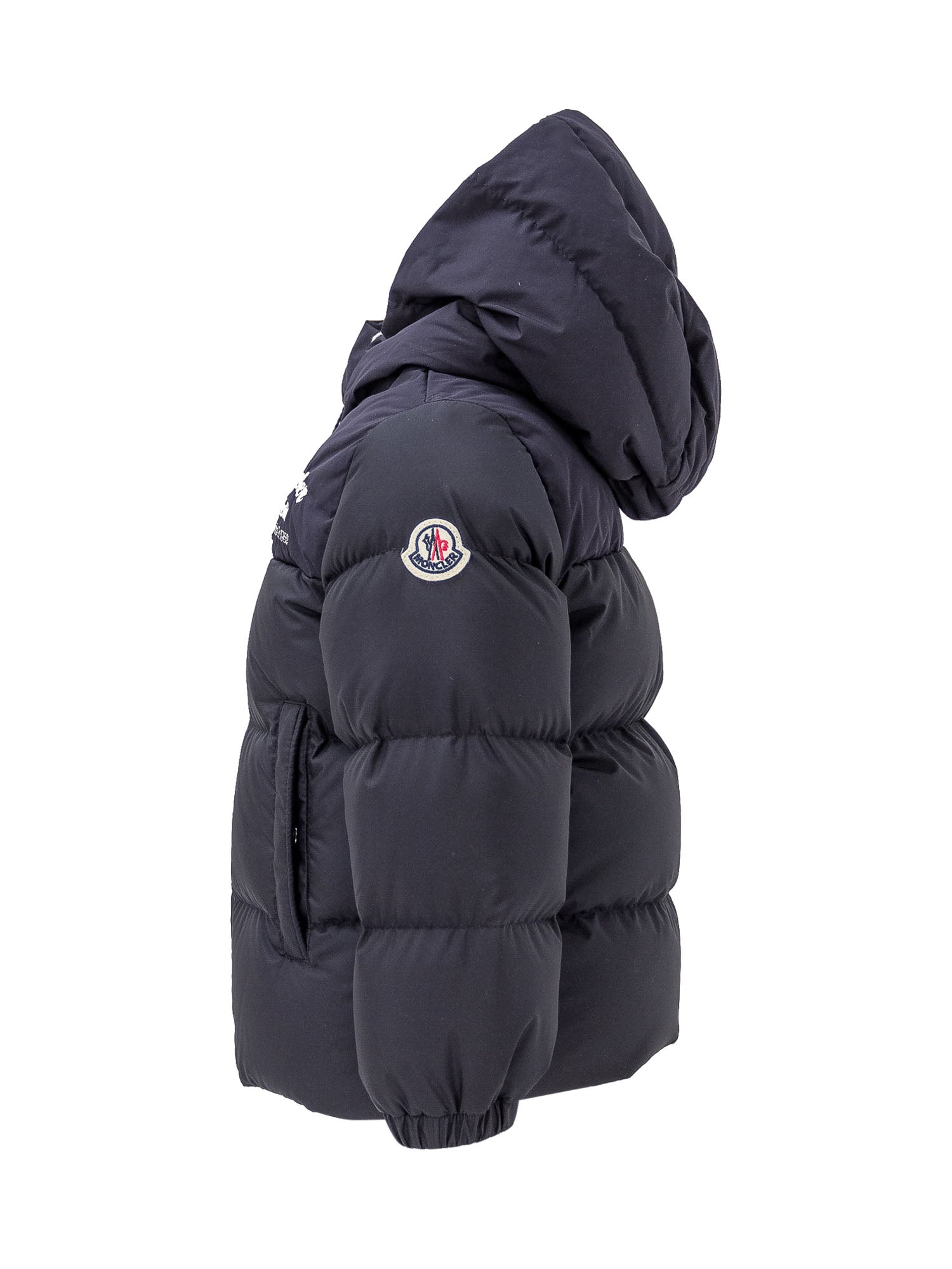 Piumino blu a maniche lunghe. Cappuccio. Logo sul petto e sulla manica. Tasche laterali. Chiusura frontale con zip. Elastico ai polsi.