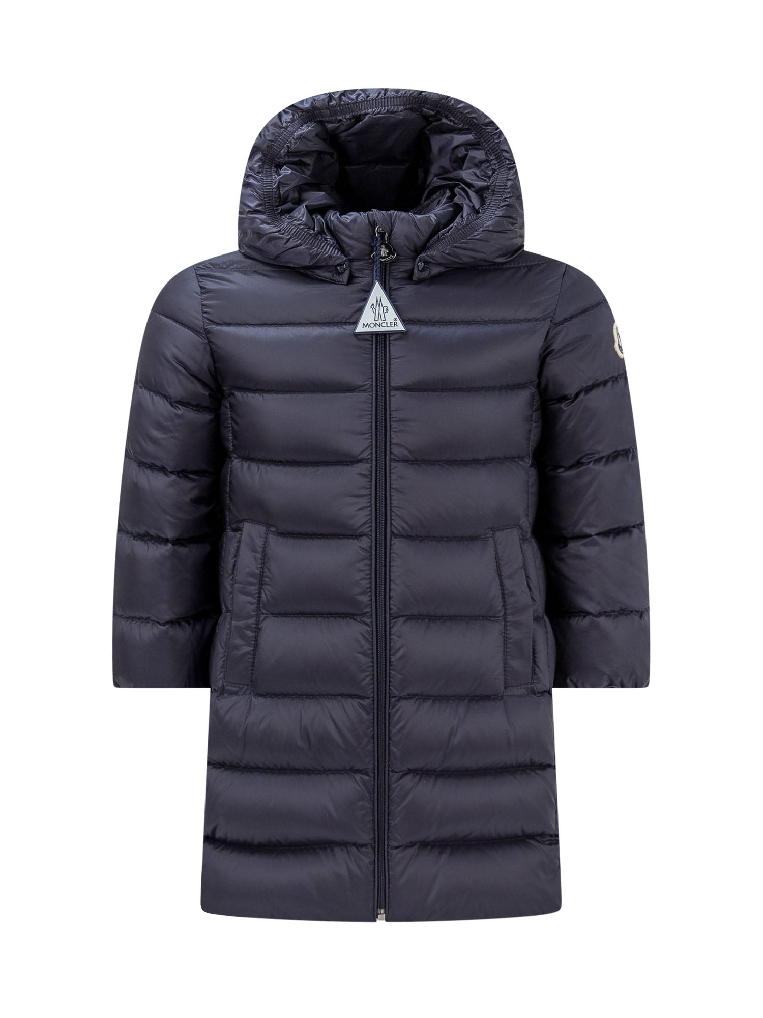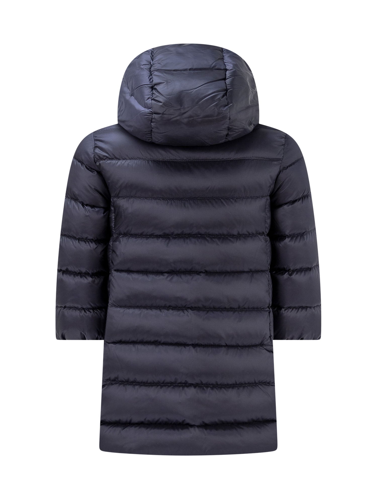 Piumino blu a maniche lunghe. Cappuccio con bottoni. Lunghezza midi. Logo sulla manica. Tasche laterali. Chiusura frontale con zip.