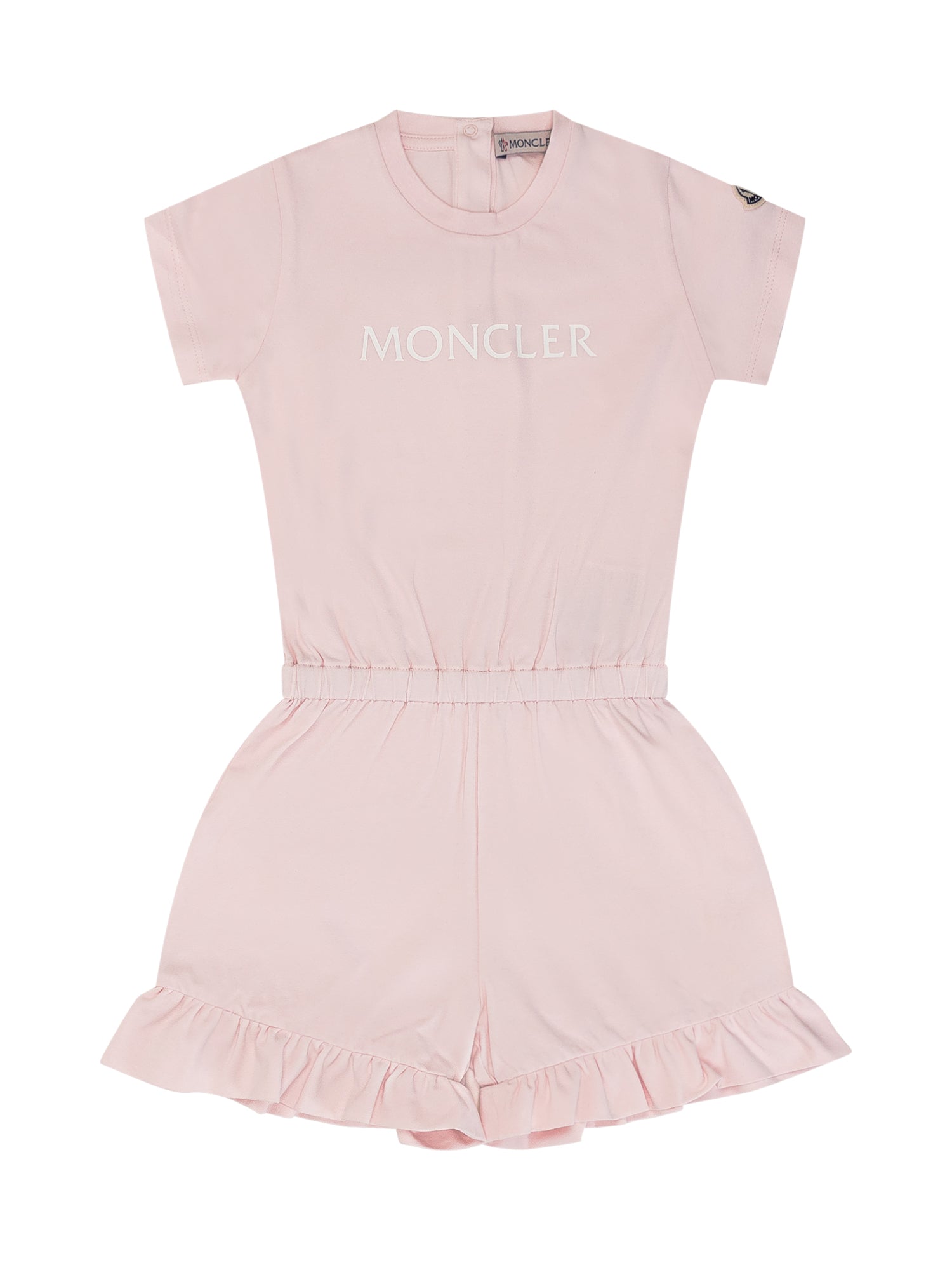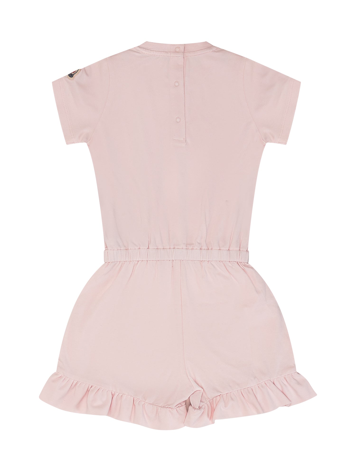 Tutina rosa a maniche corte con pantaloncino. Punto vita elasticizzato. Chiusura con bottoni sul retro. Patch logo sulla manica.