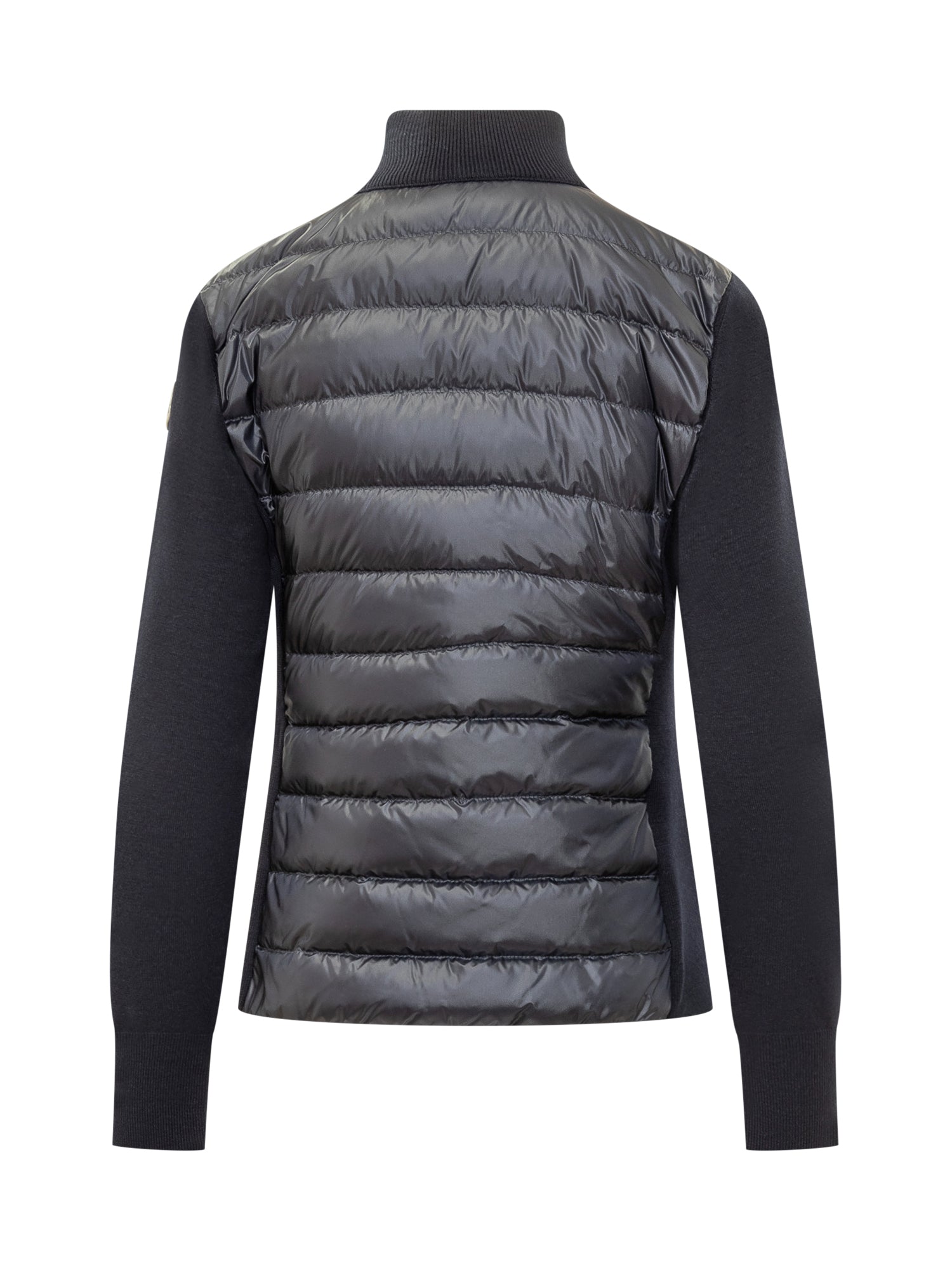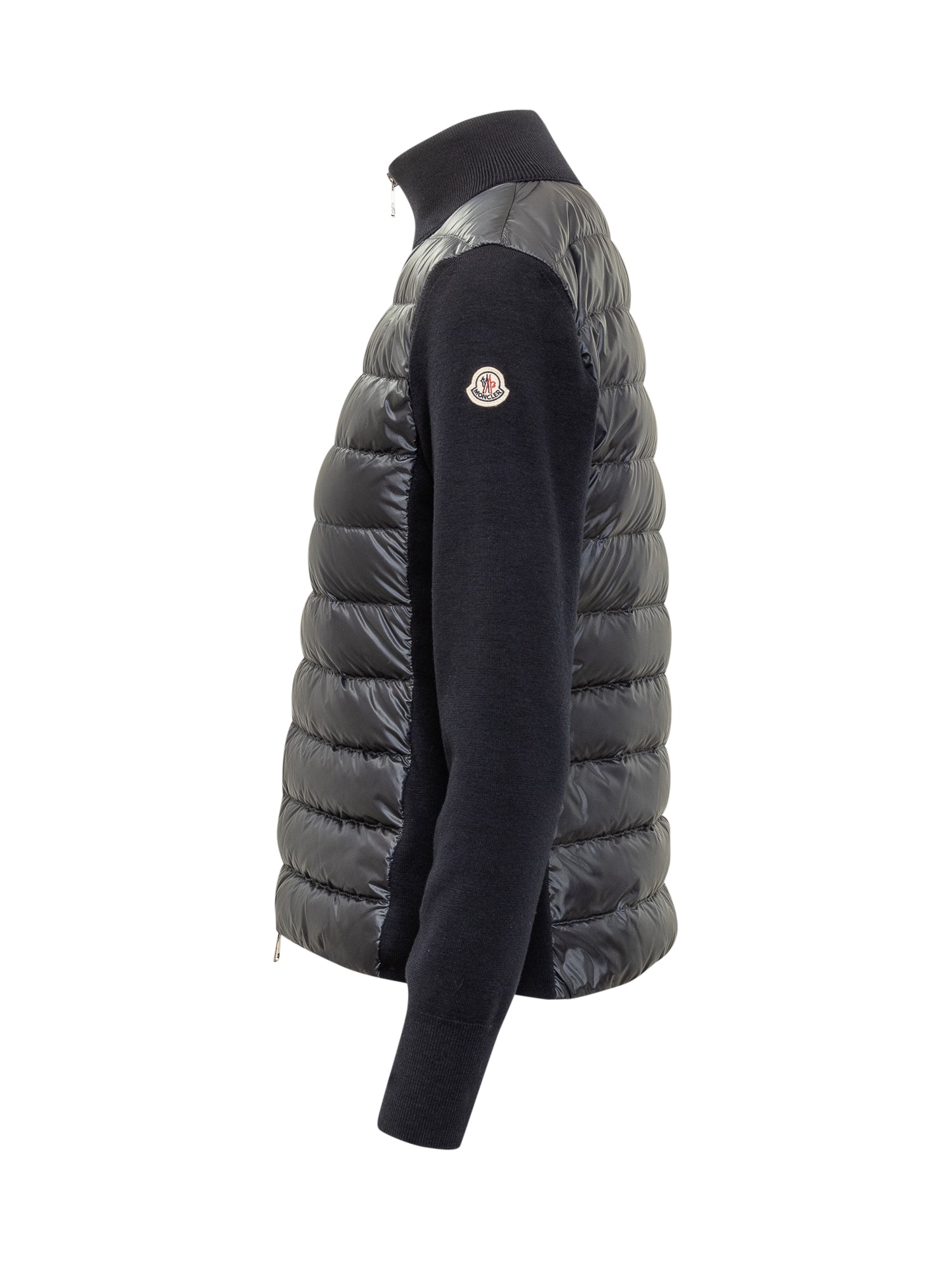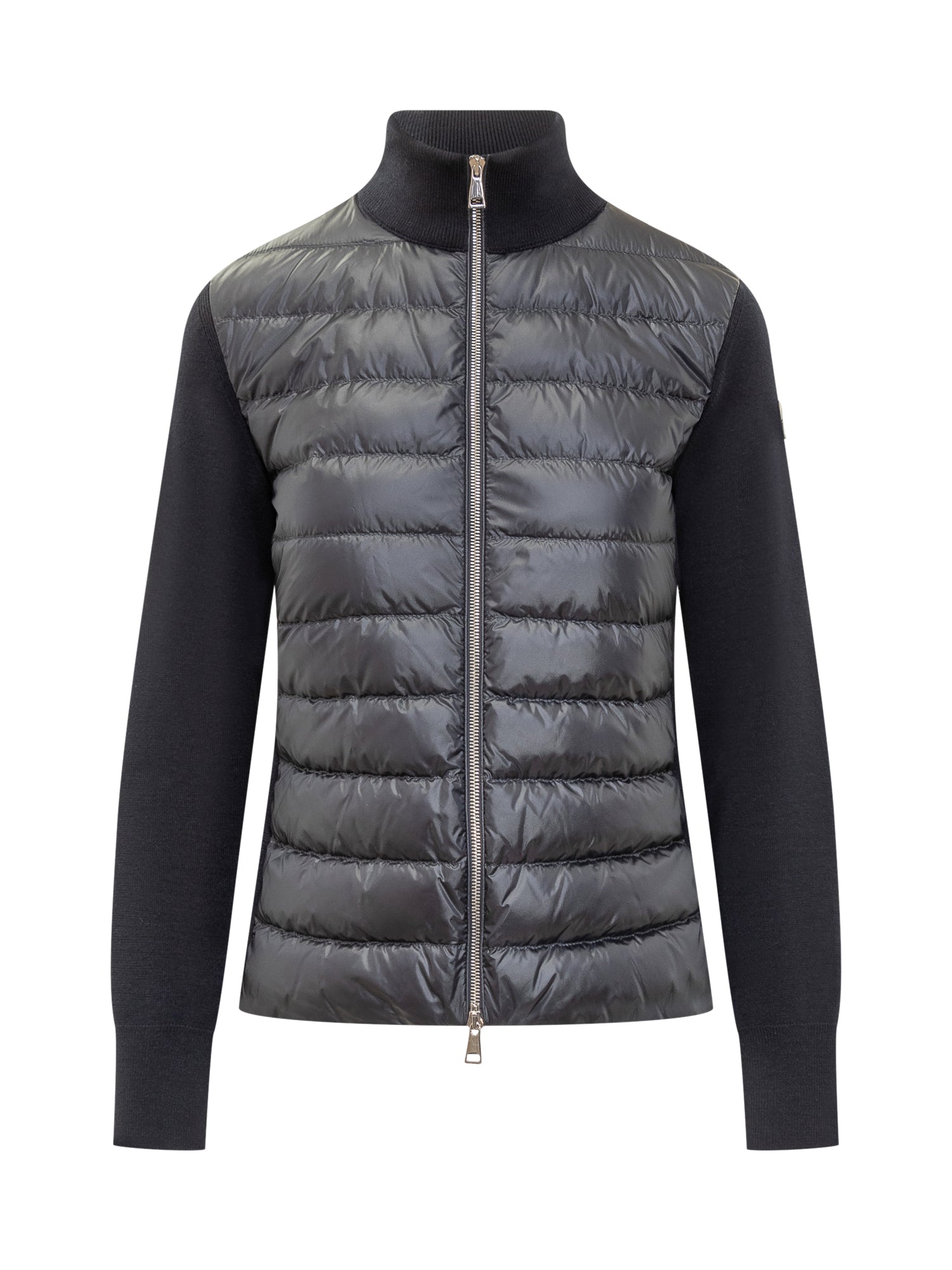 Cardigan da donna con parte frontale in nylon trapuntato nero e maniche in maglia. Zip a doppio cursore e collo alto a costine.