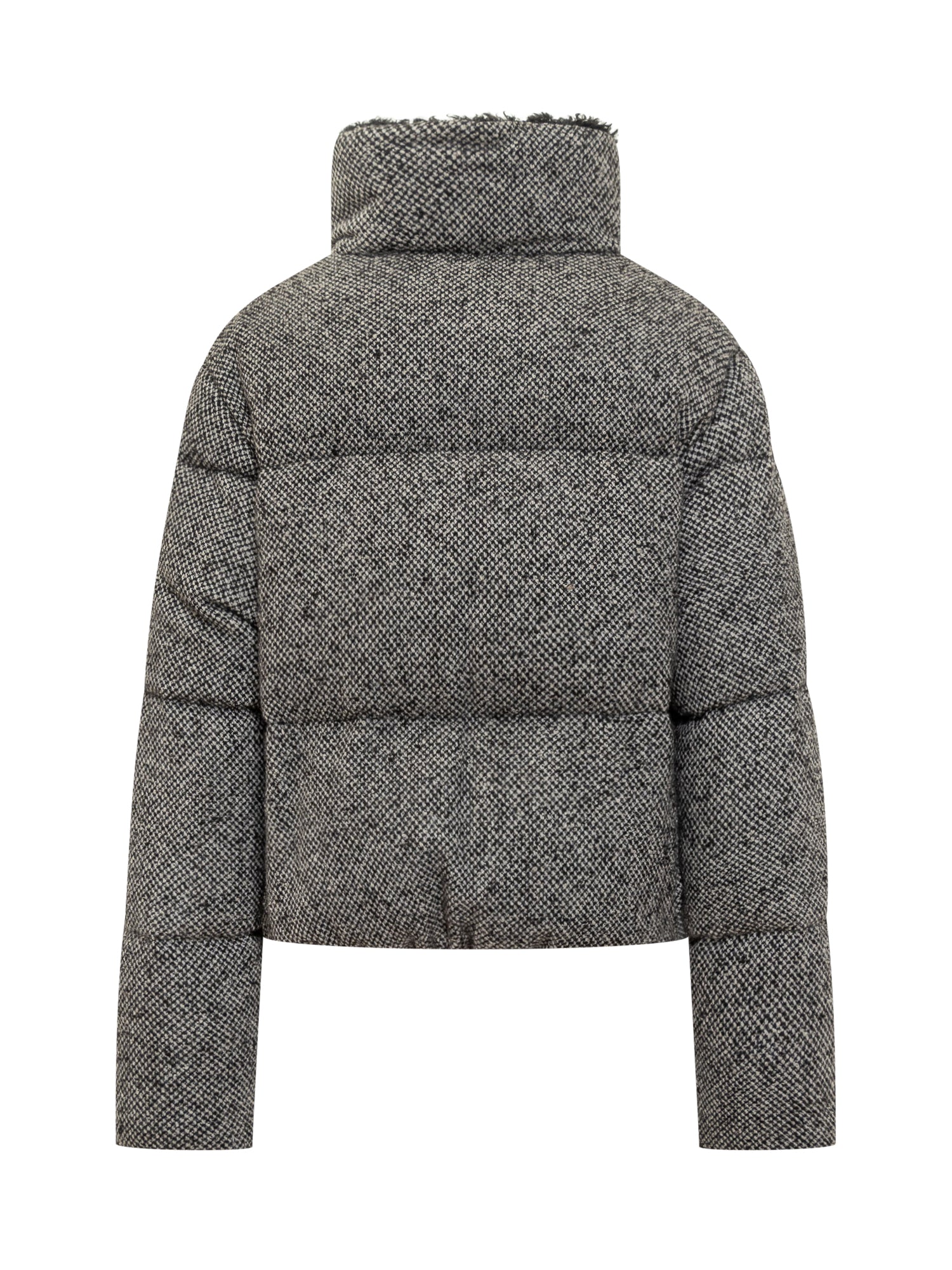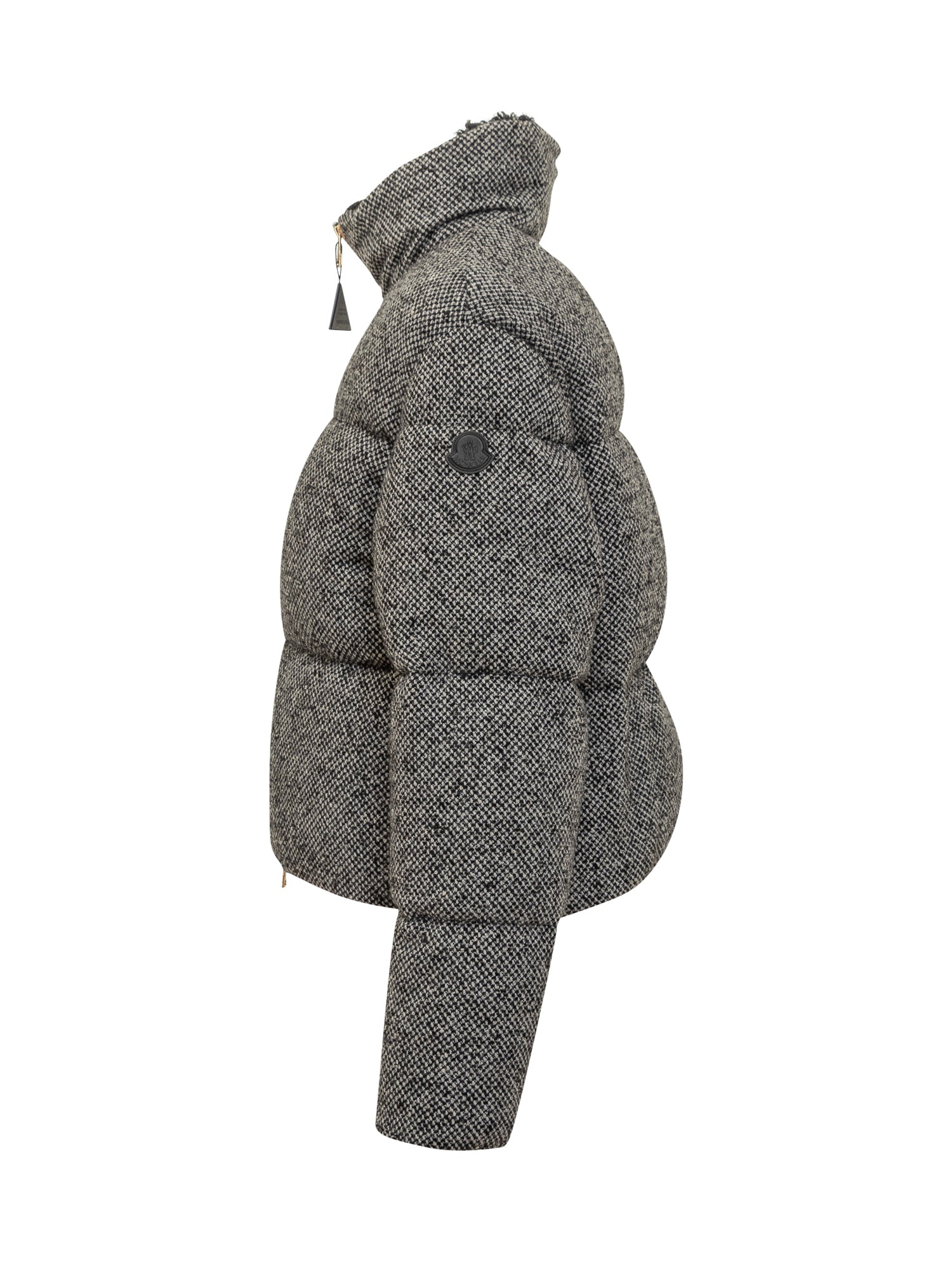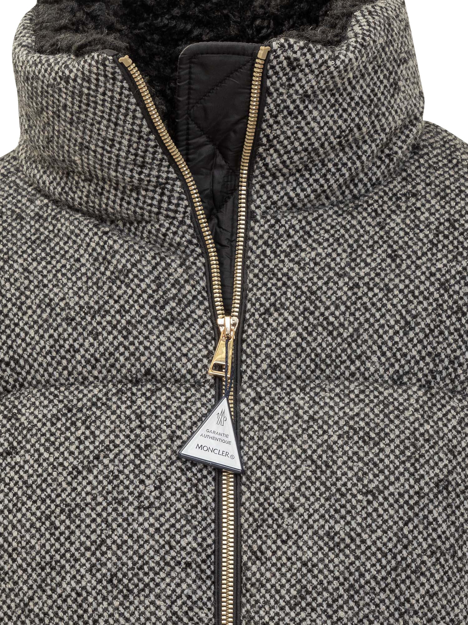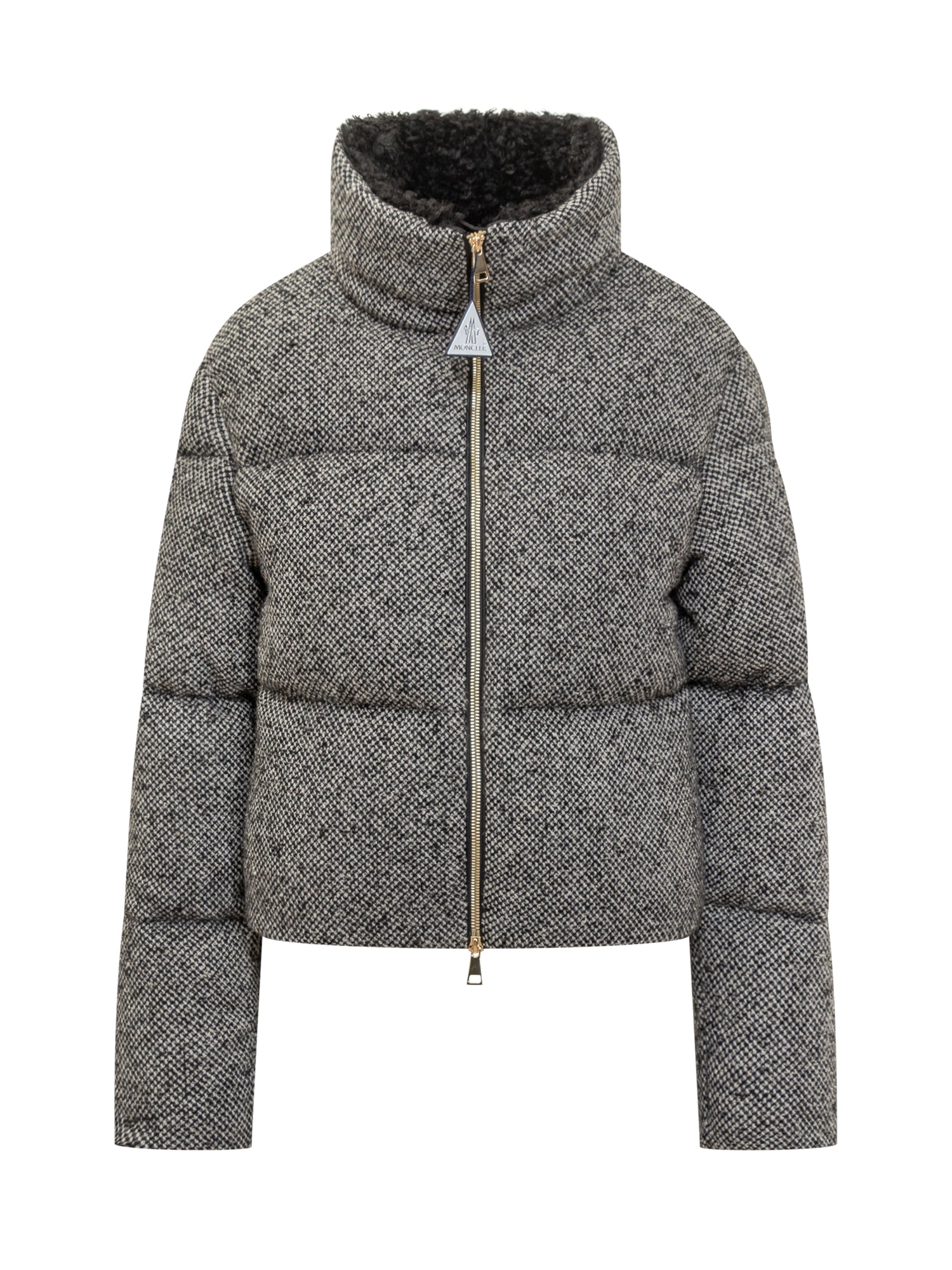 Piumino Moncler Brezesse in tessuto tweed grigio con interno caldo in shearling, zip frontale e collo alto.