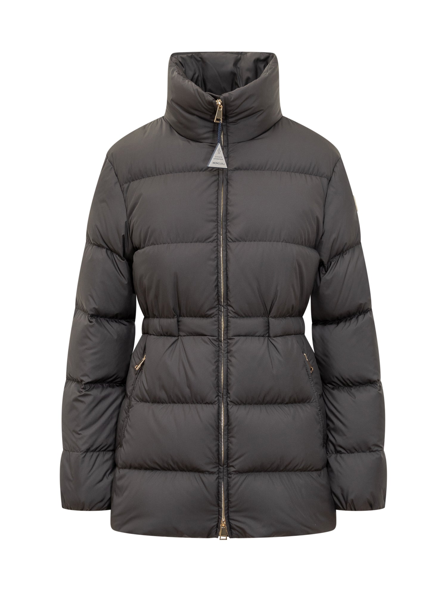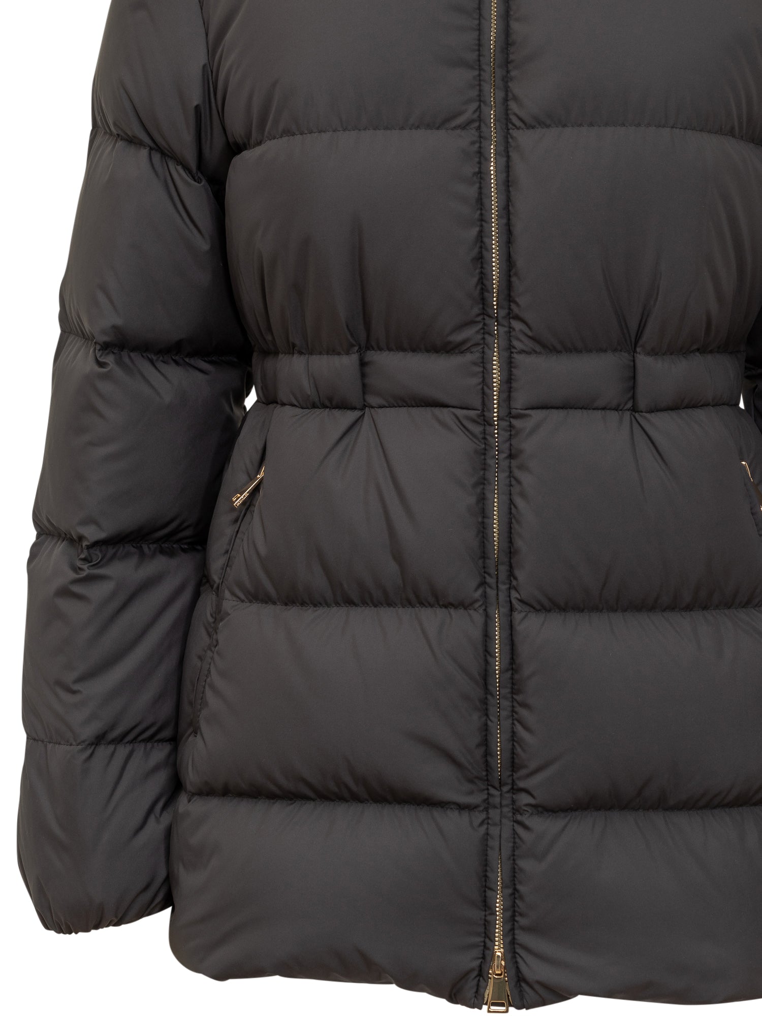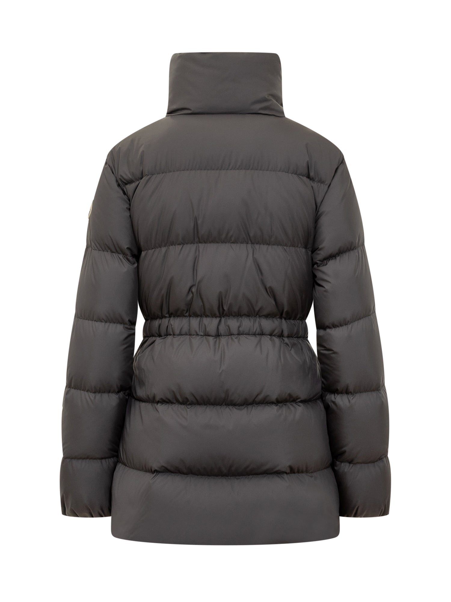 Piumino Moncler nero con trapuntatura orizzontale, chiusura a zip e colletto alto.