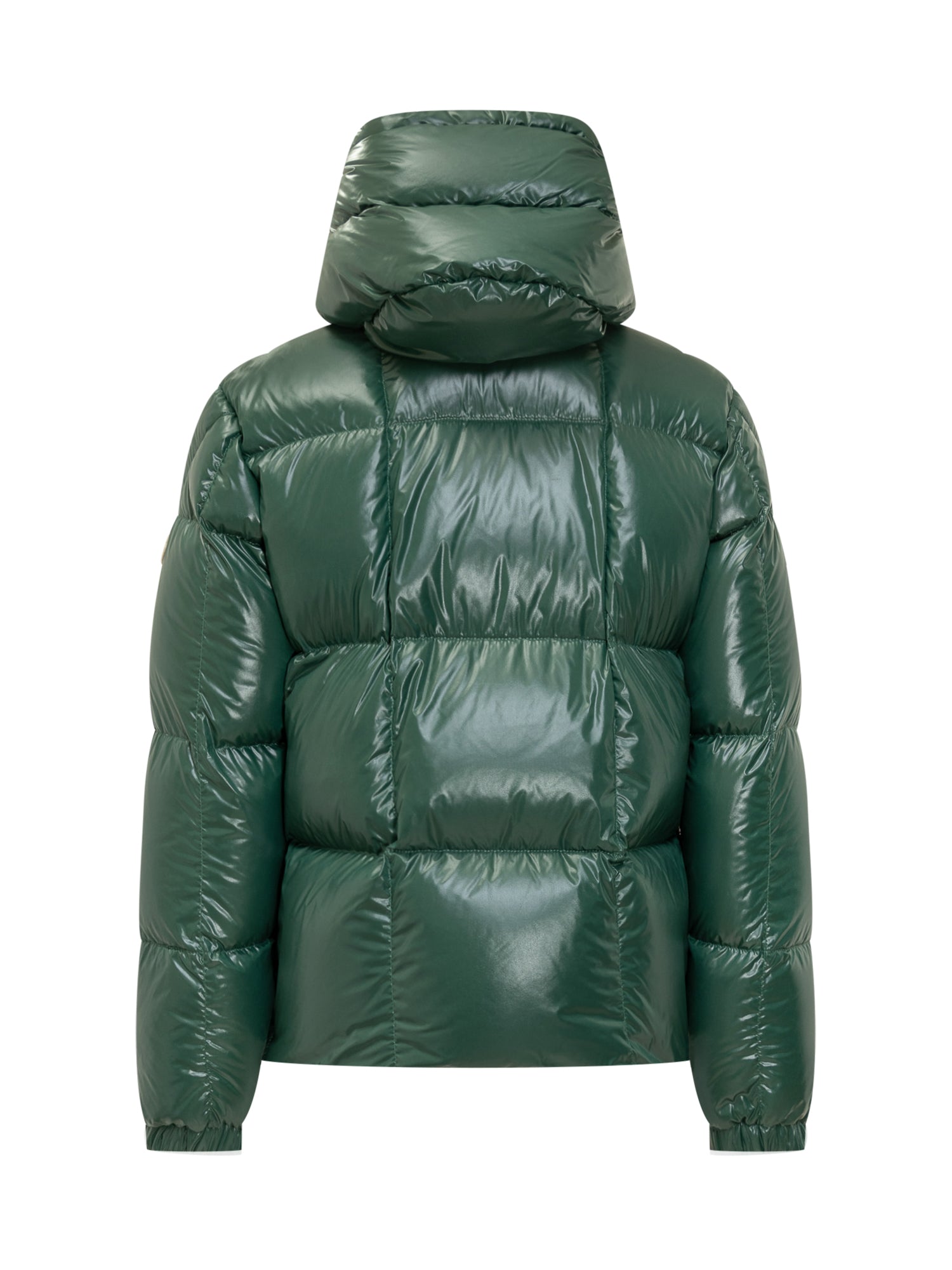 Piumino Moncler Parana verde lucido con trapuntatura a maxi quadri, cappuccio regolabile e chiusura con bottoni a pressione.