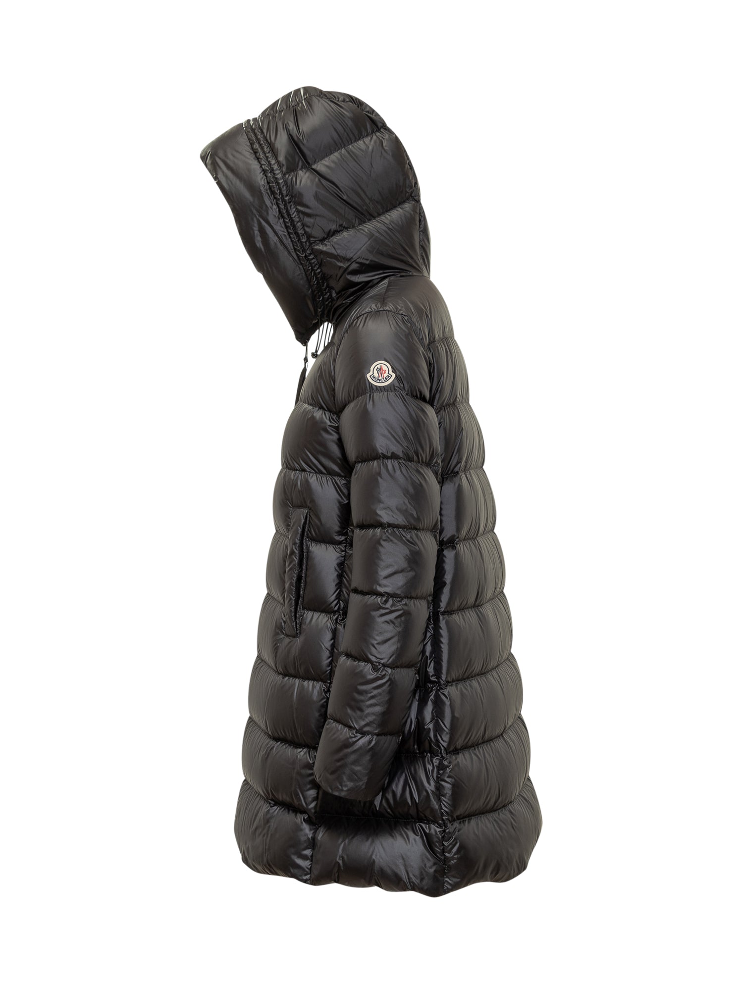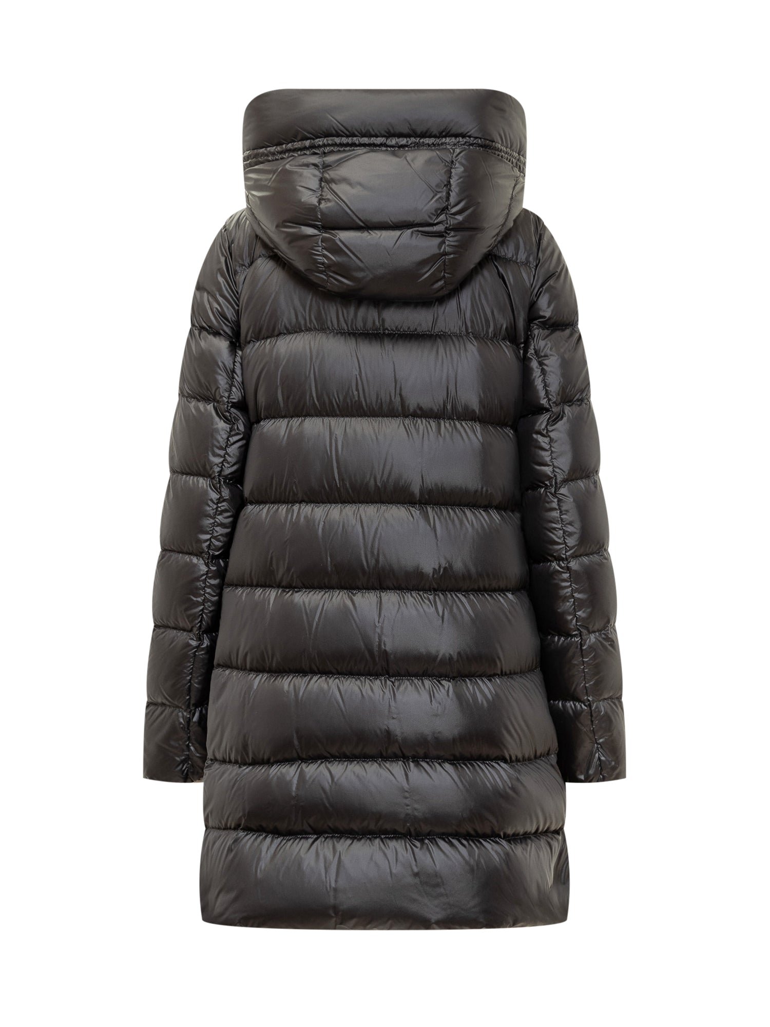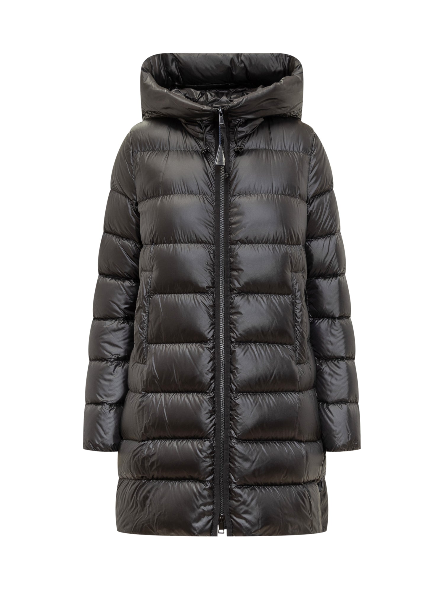 Piumino lungo da donna in nylon lucido nero con imbottitura in piuma, cappuccio fisso e zip a doppio cursore.