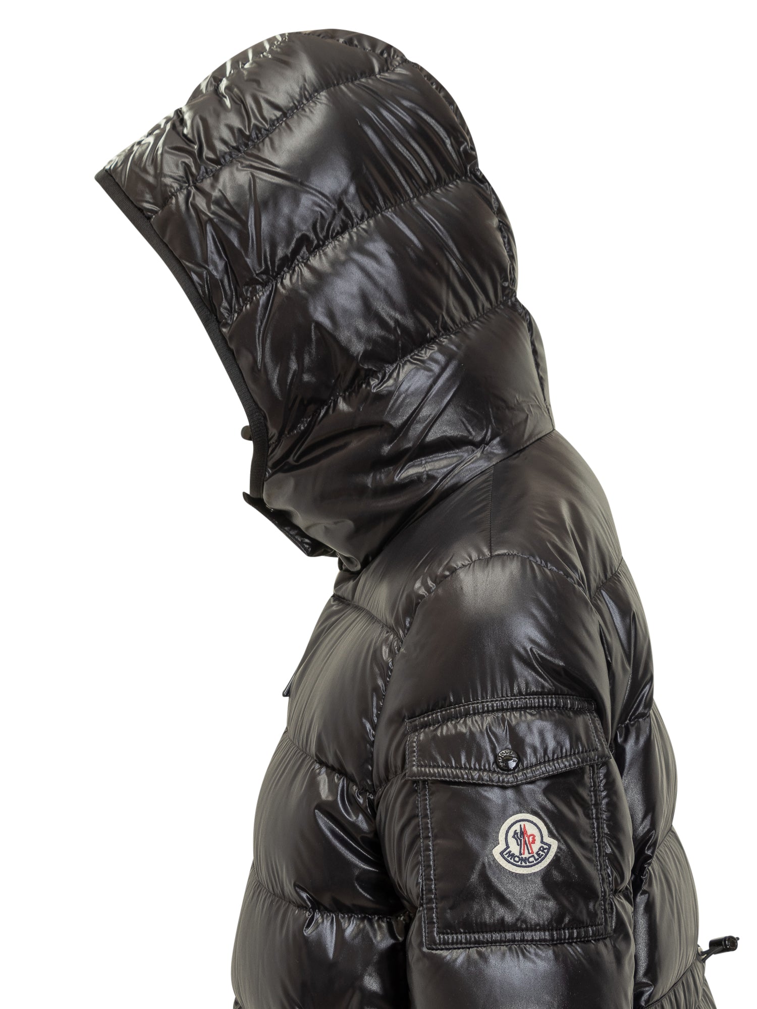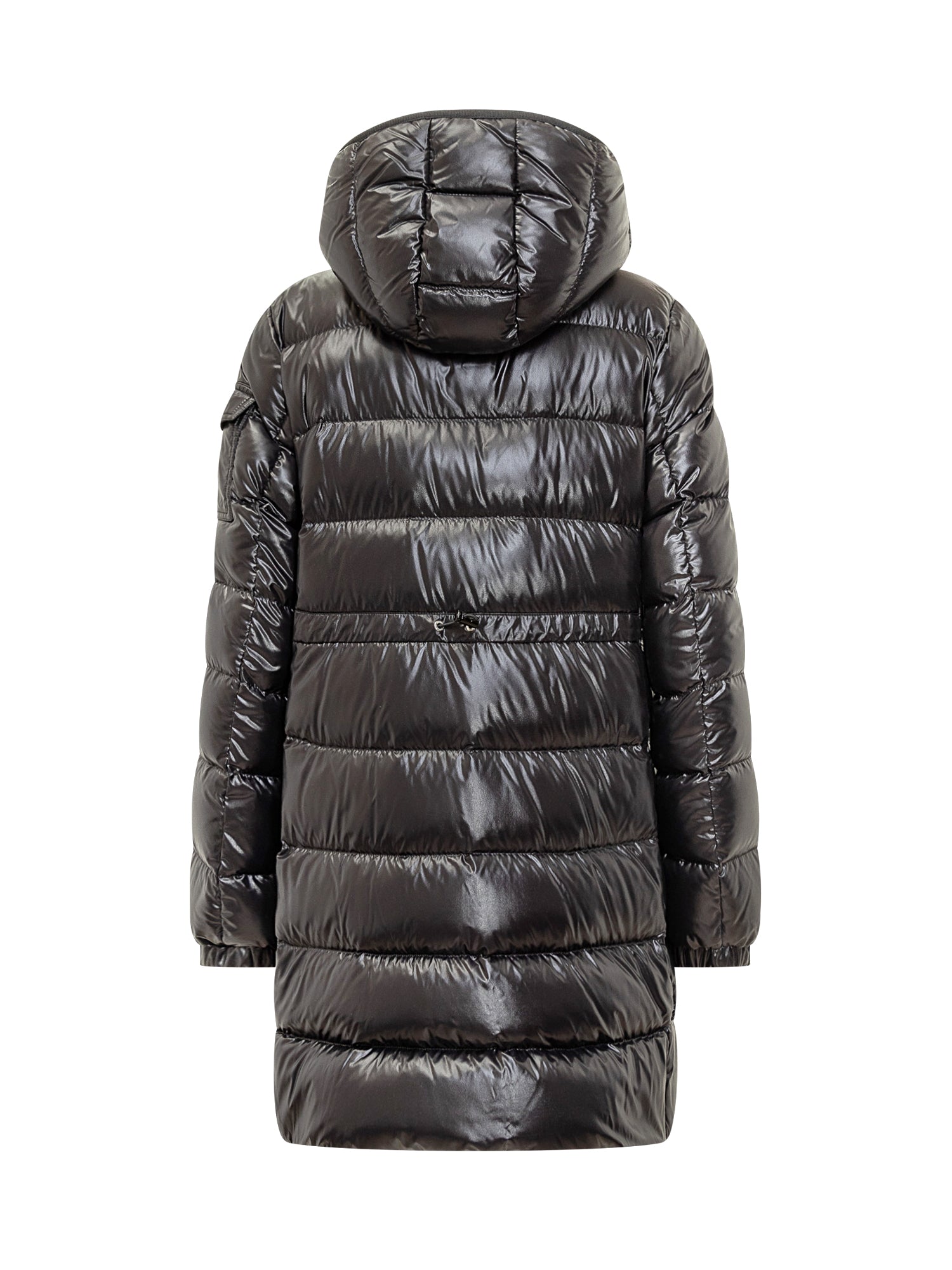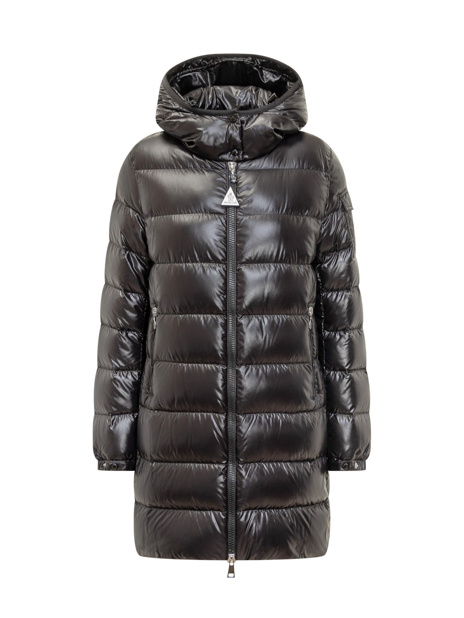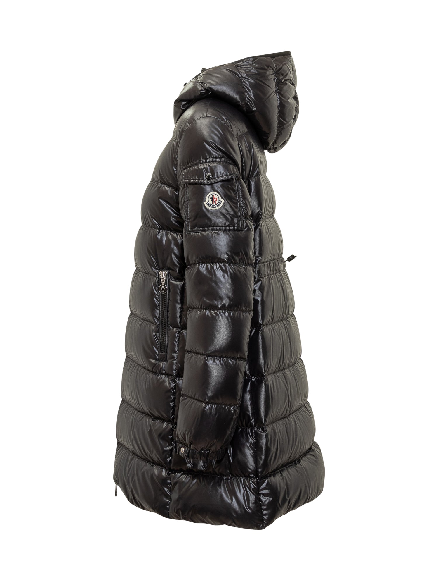 Piumino lungo da donna Moncler Courcelles in nylon lucido nero. Imbottitura in piuma, cappuccio avvolgente, chiusura zip e logo sulla manica.