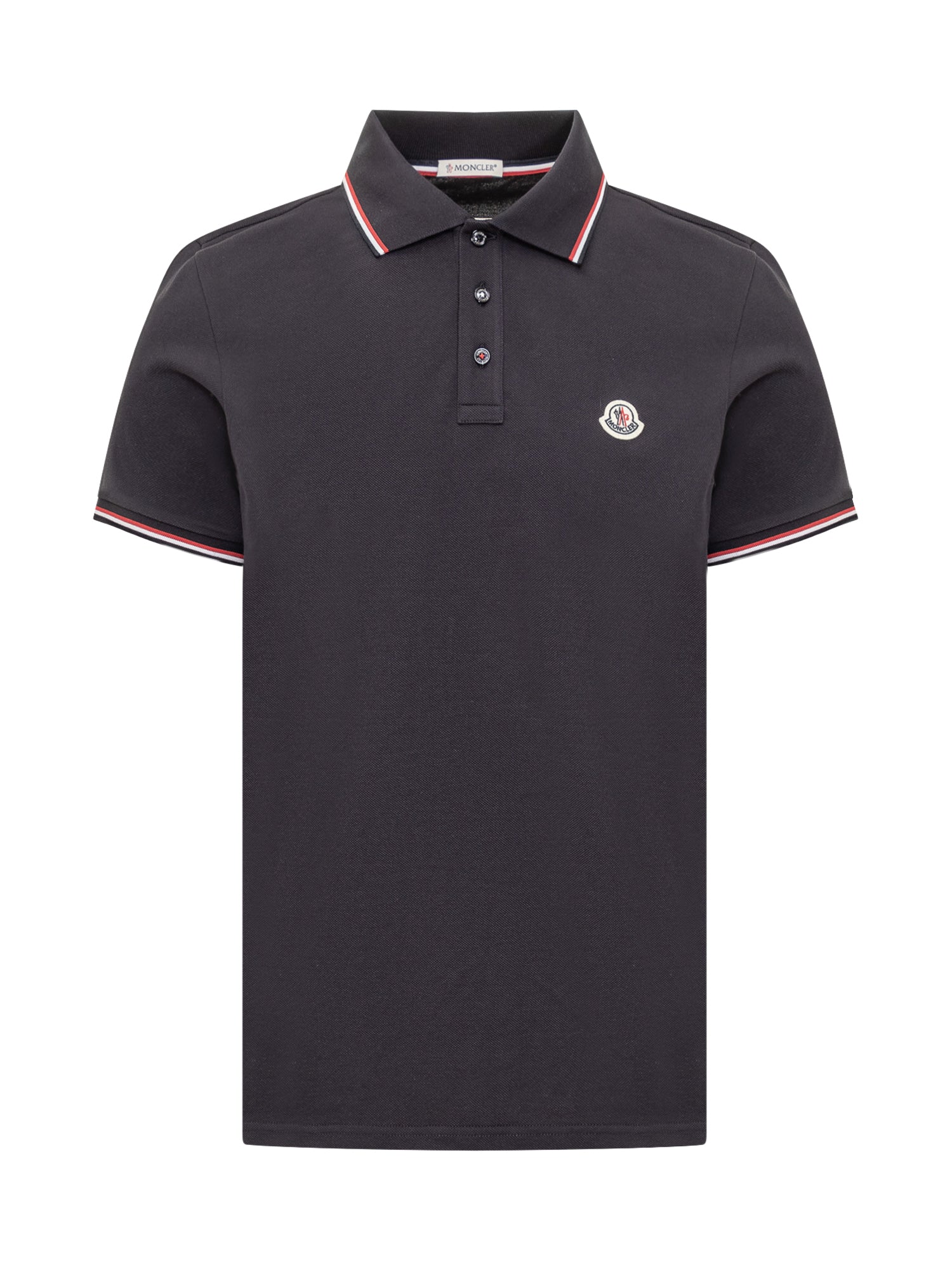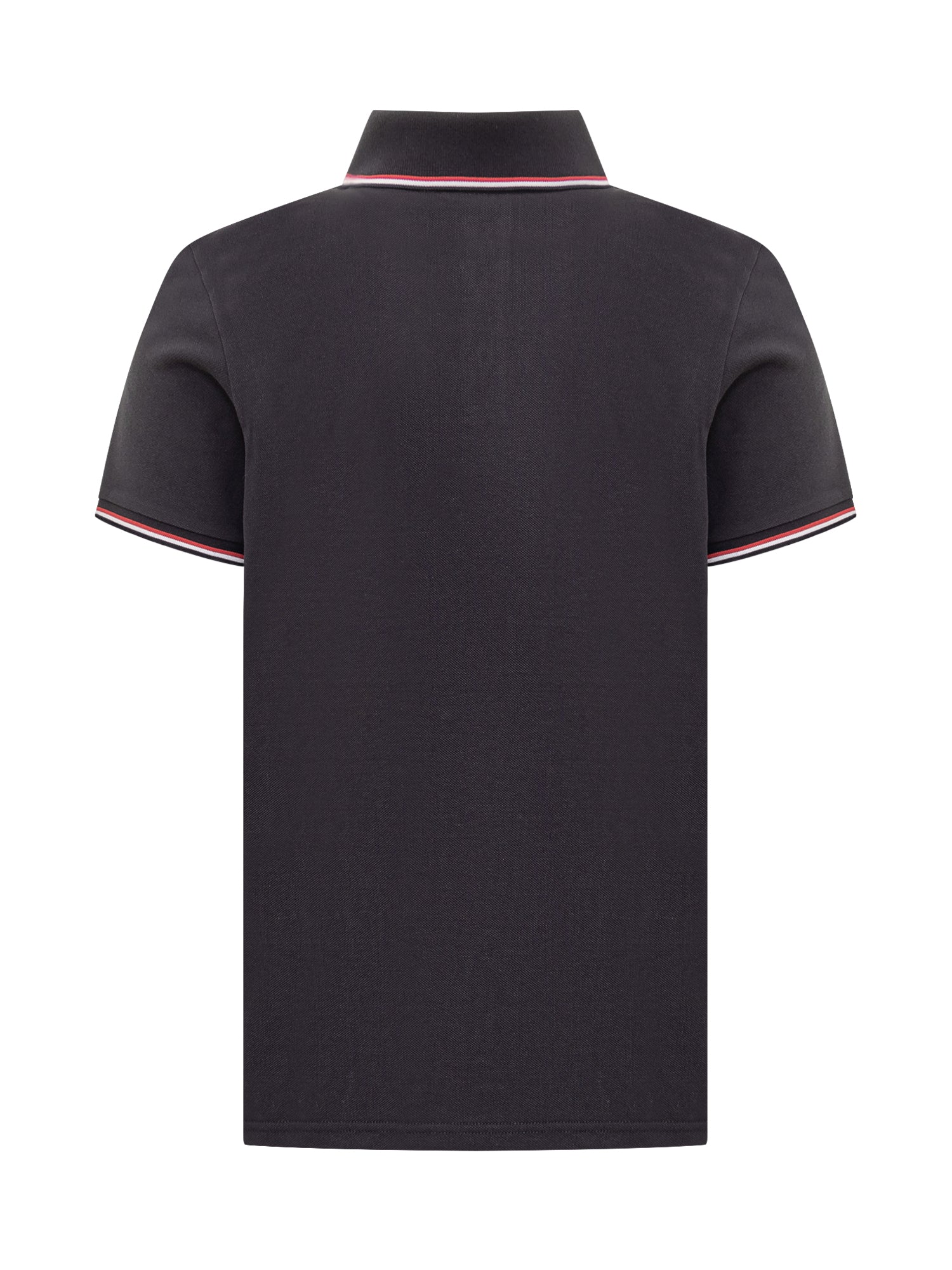 Polo Moncler in piqué di cotone nero con dettagli a righe tricolore su colletto e maniche. Logo ricamato sul petto.
