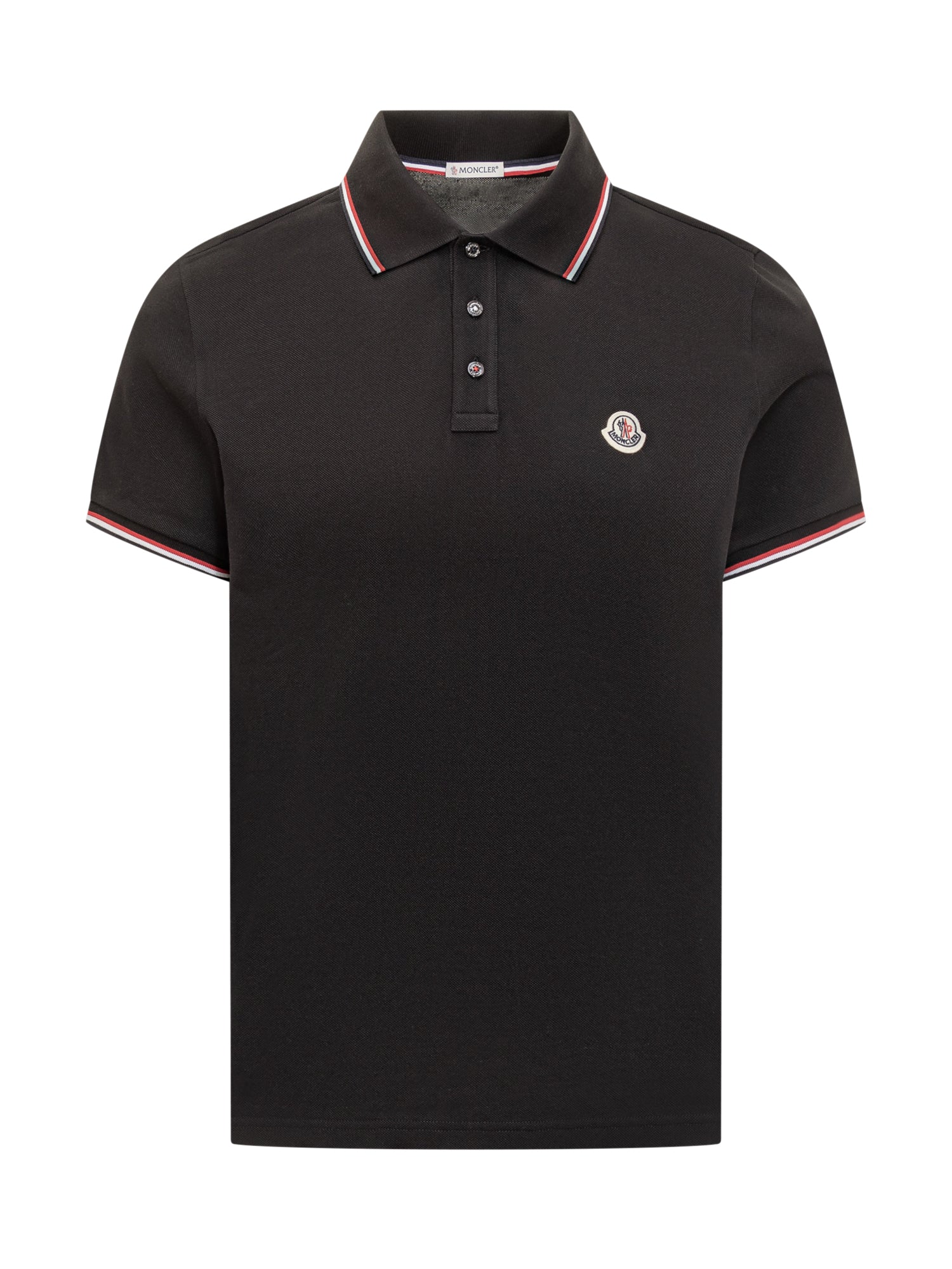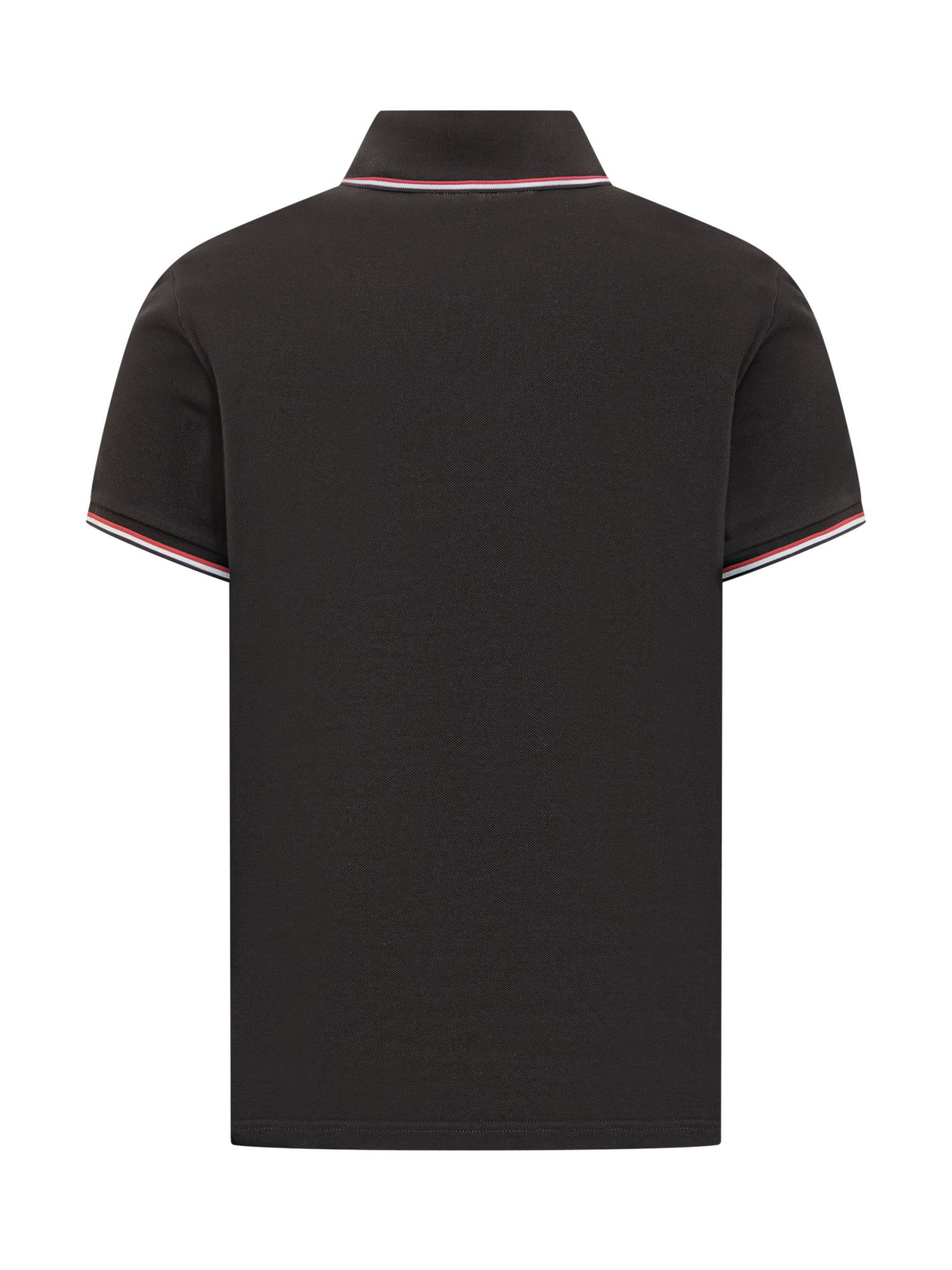 Polo Moncler nera in piqué di cotone con dettagli tricolore e logo ricamato.