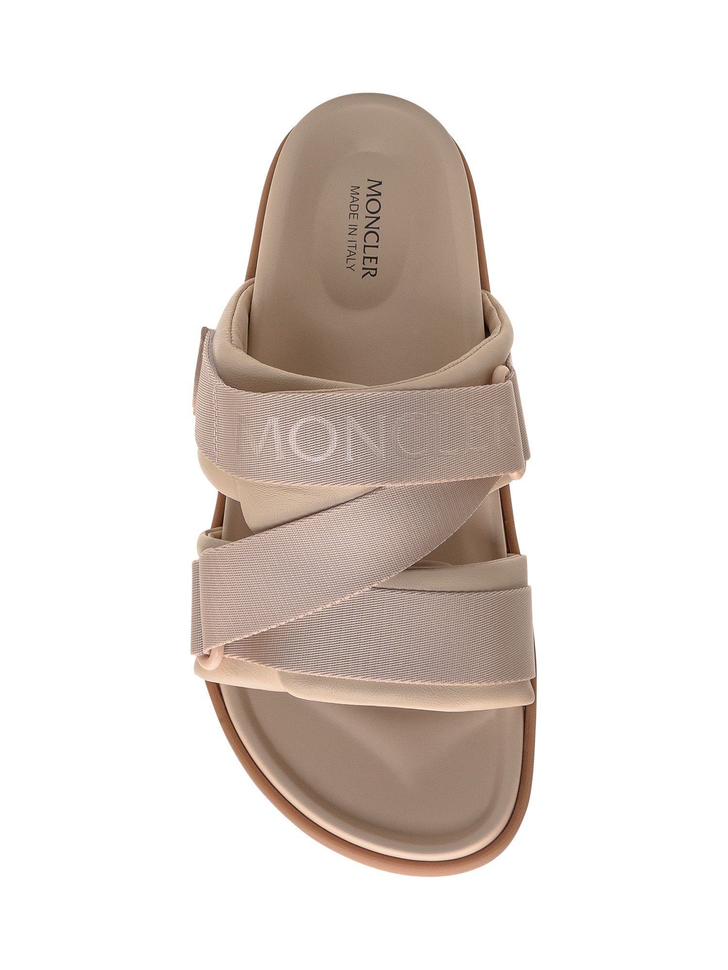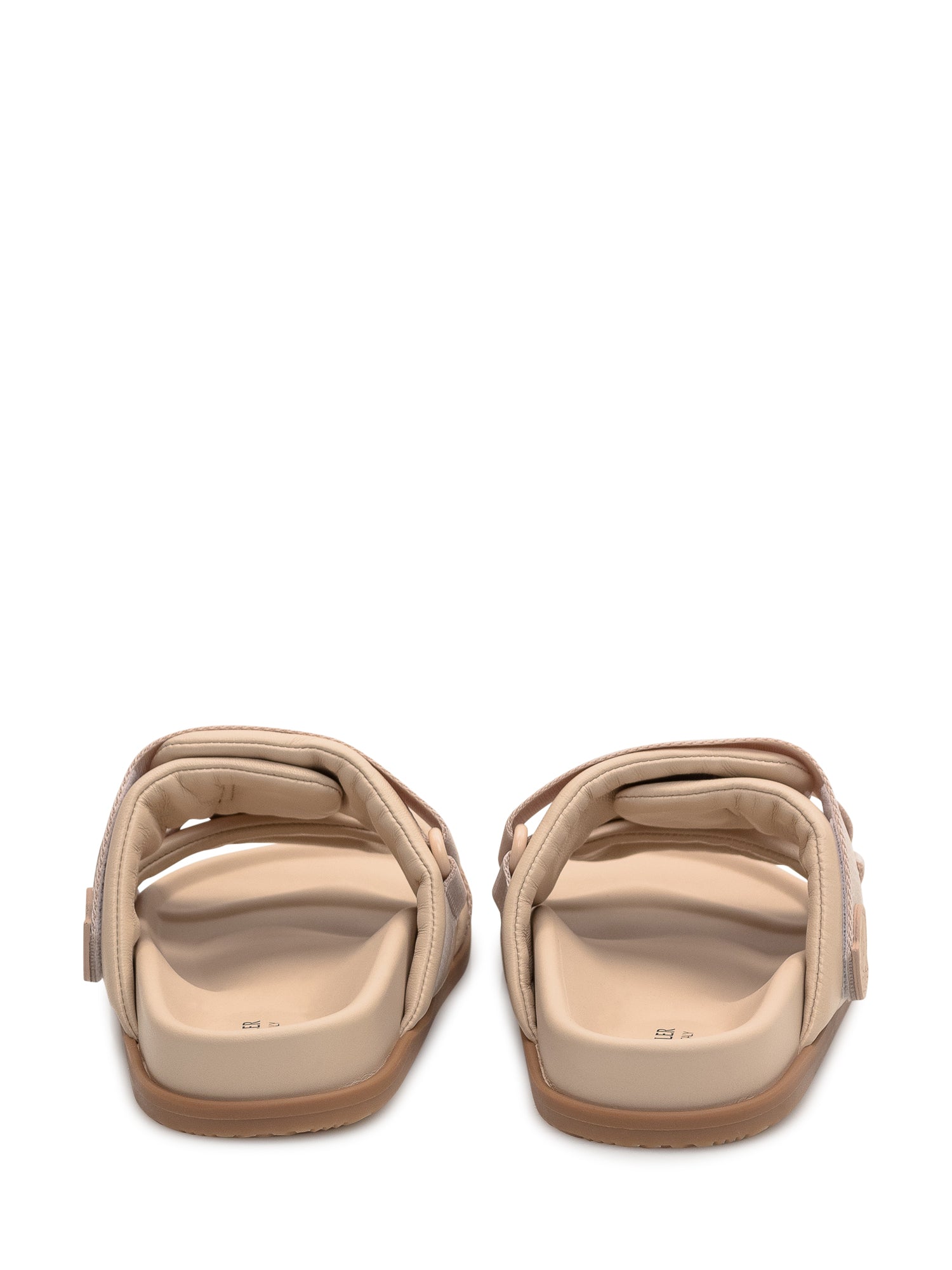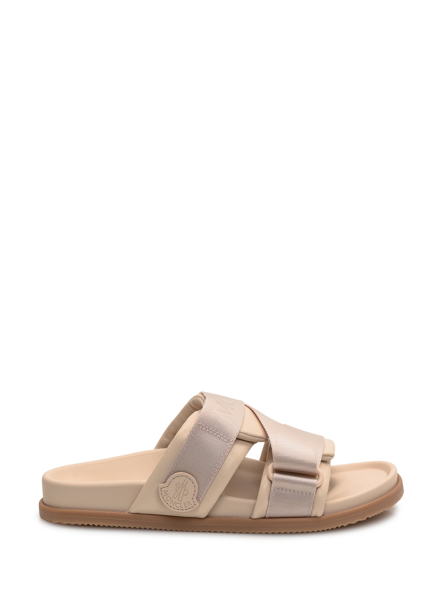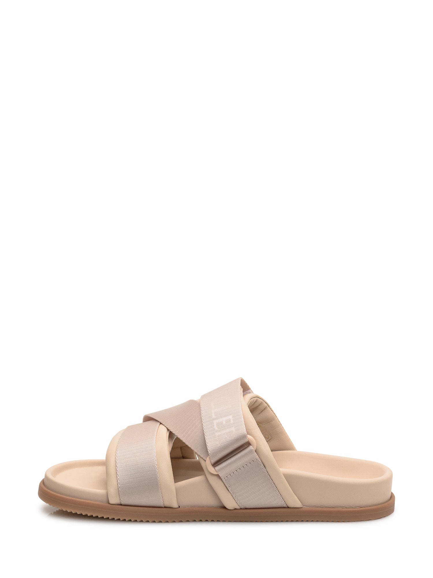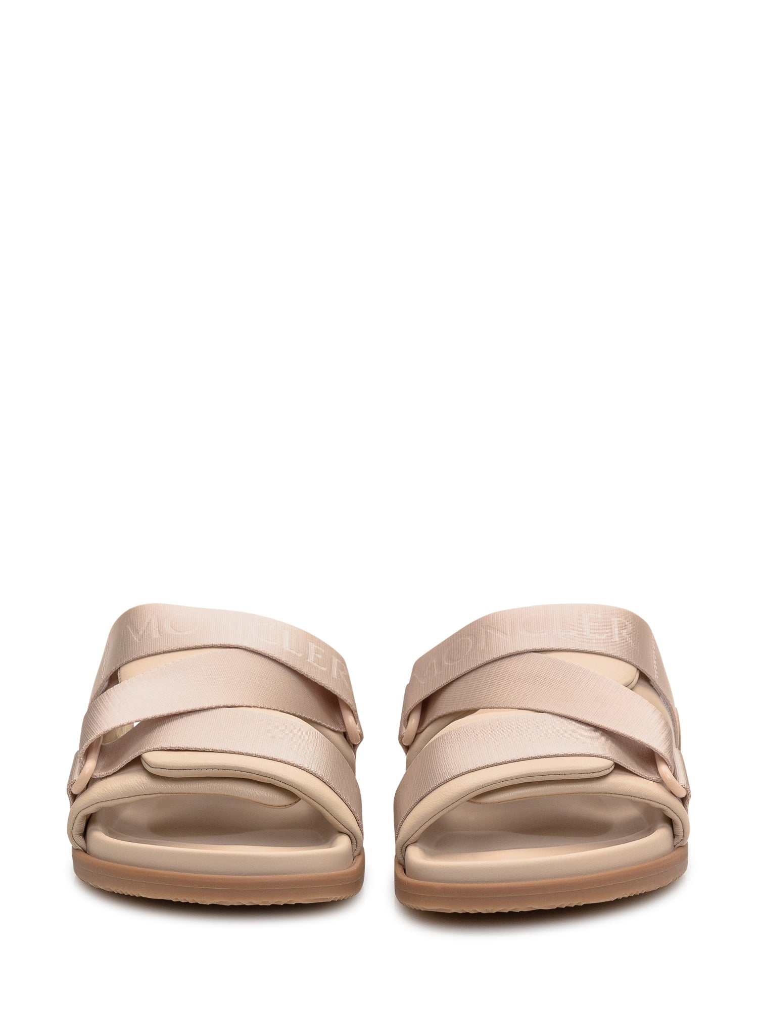 Sandalo rosa in pelle. Inserti in tessuto. Logo applicato.