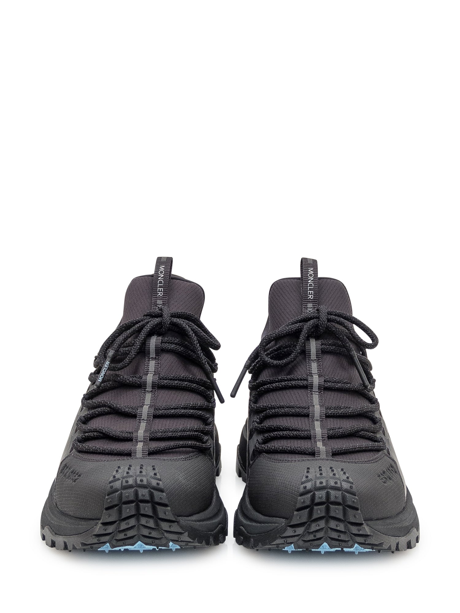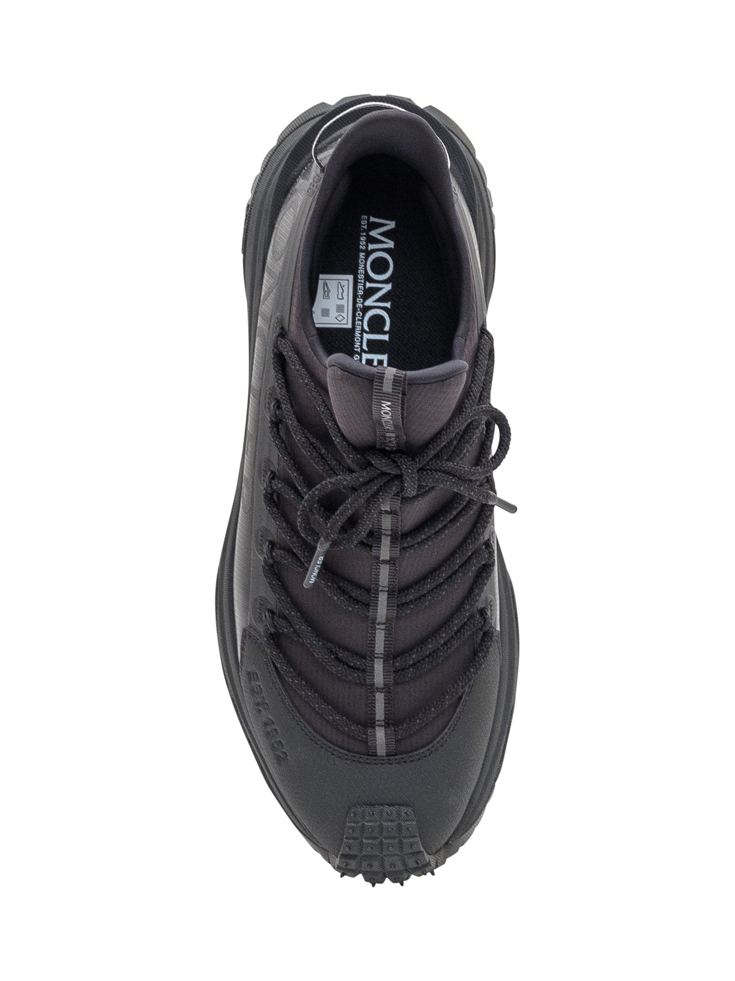 Sneakers Moncler in tessuto tecnico nero con suola robusta e dettagli ispirati al trekking. Il maxi logo laterale aggiunge un carattere deciso al design sportivo.