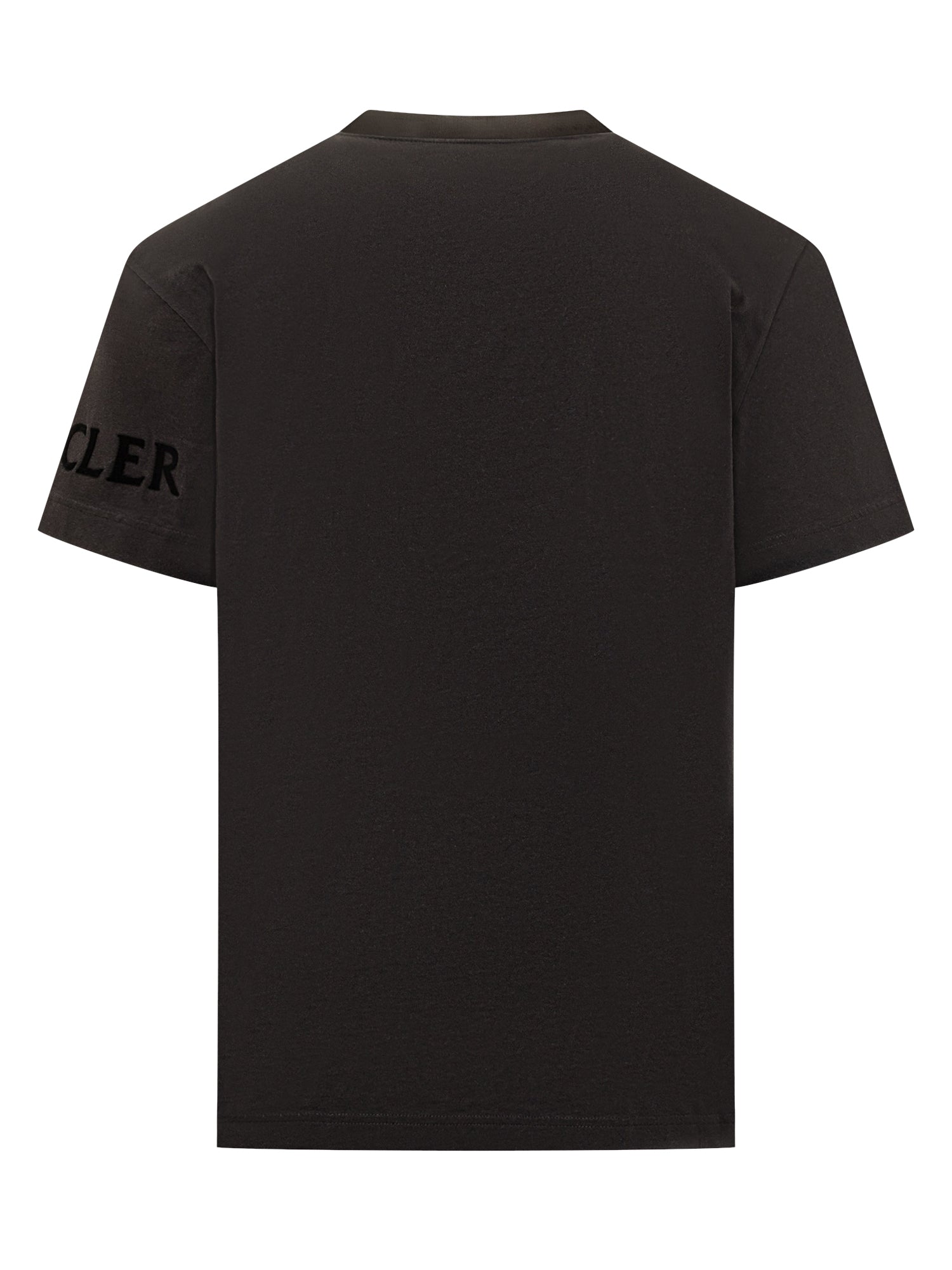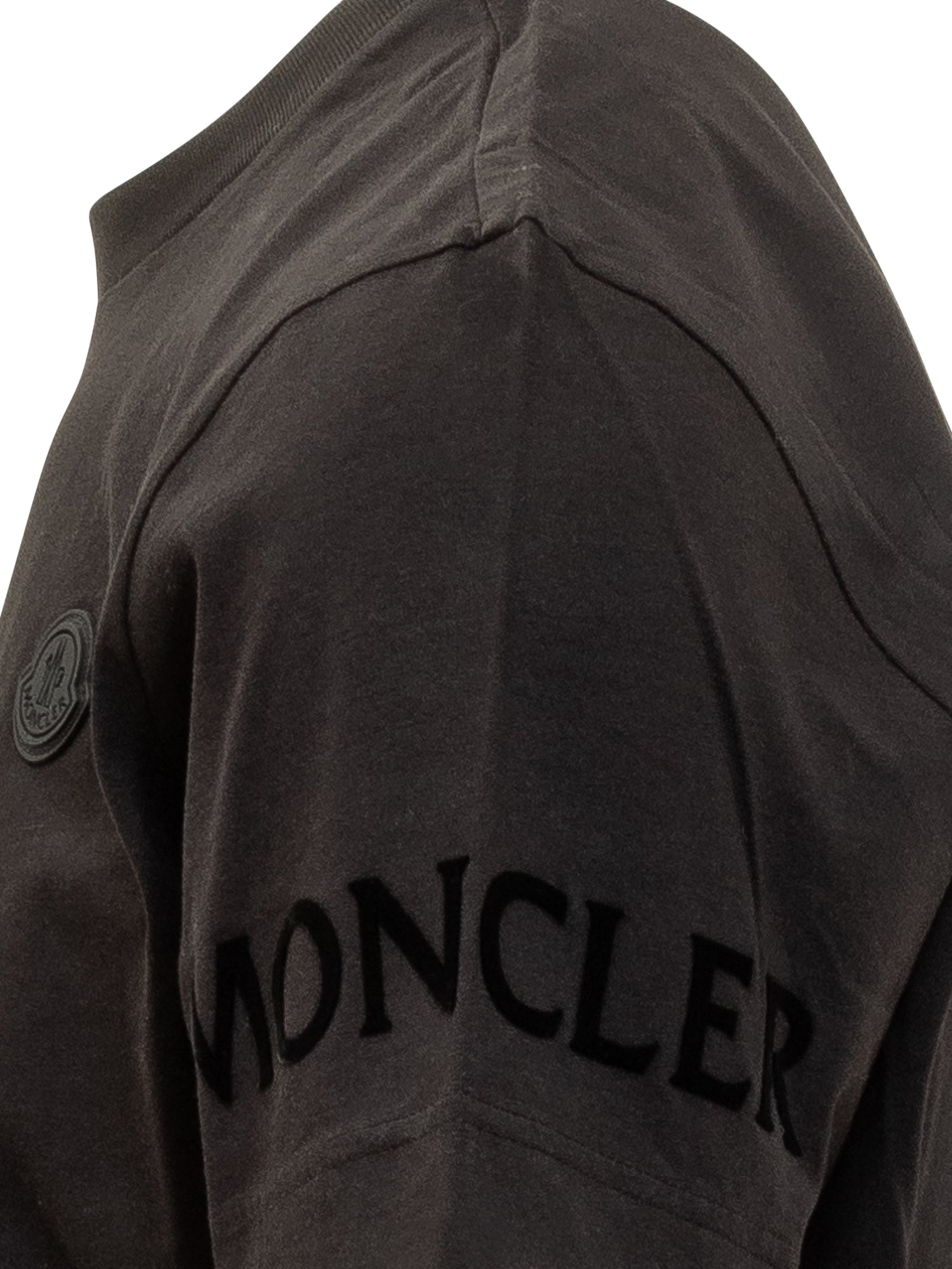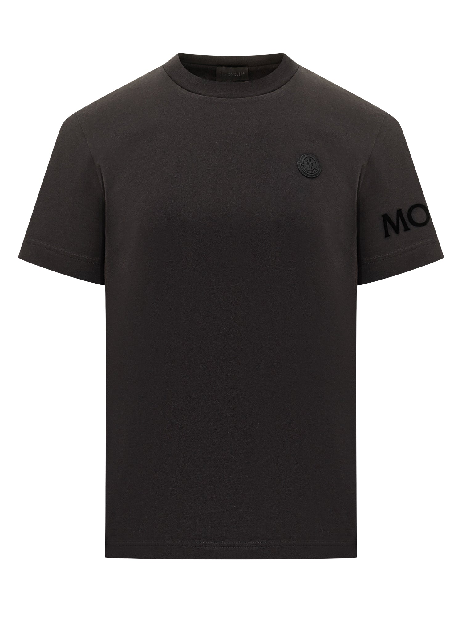T-shirt nera in cotone con logo Moncler tono su tono sul petto e scritta sul manicotto. Design essenziale e contemporaneo per look sofisticati.