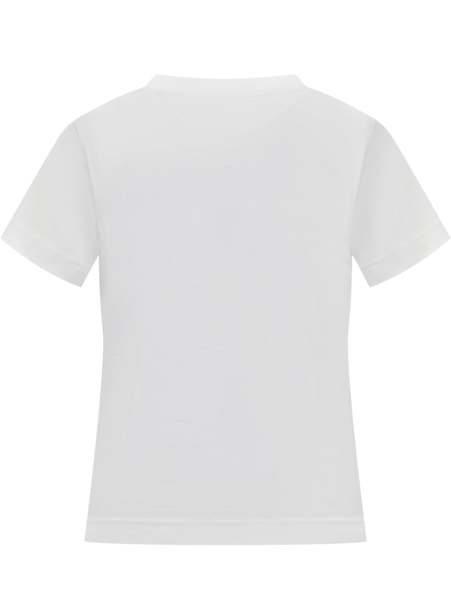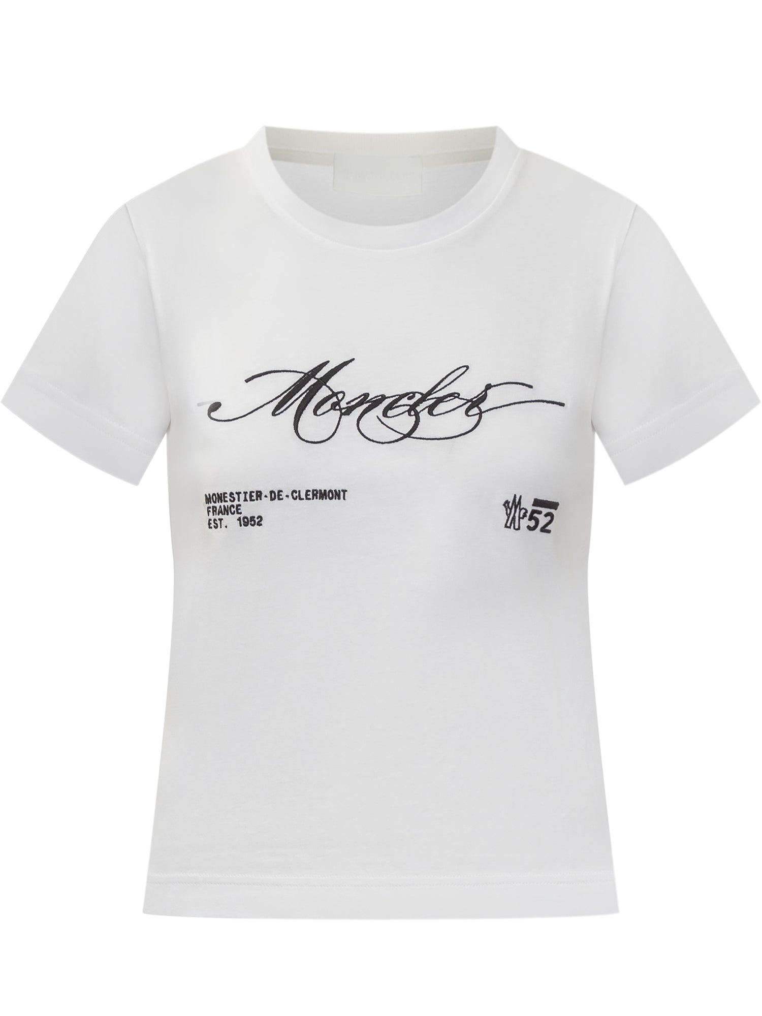 T-shirt Moncler in cotone bianco con logo Moncler ricamato in nero sul petto in carattere calligrafico. Dettagli testuali stampati in nero sul lato sinistro.
