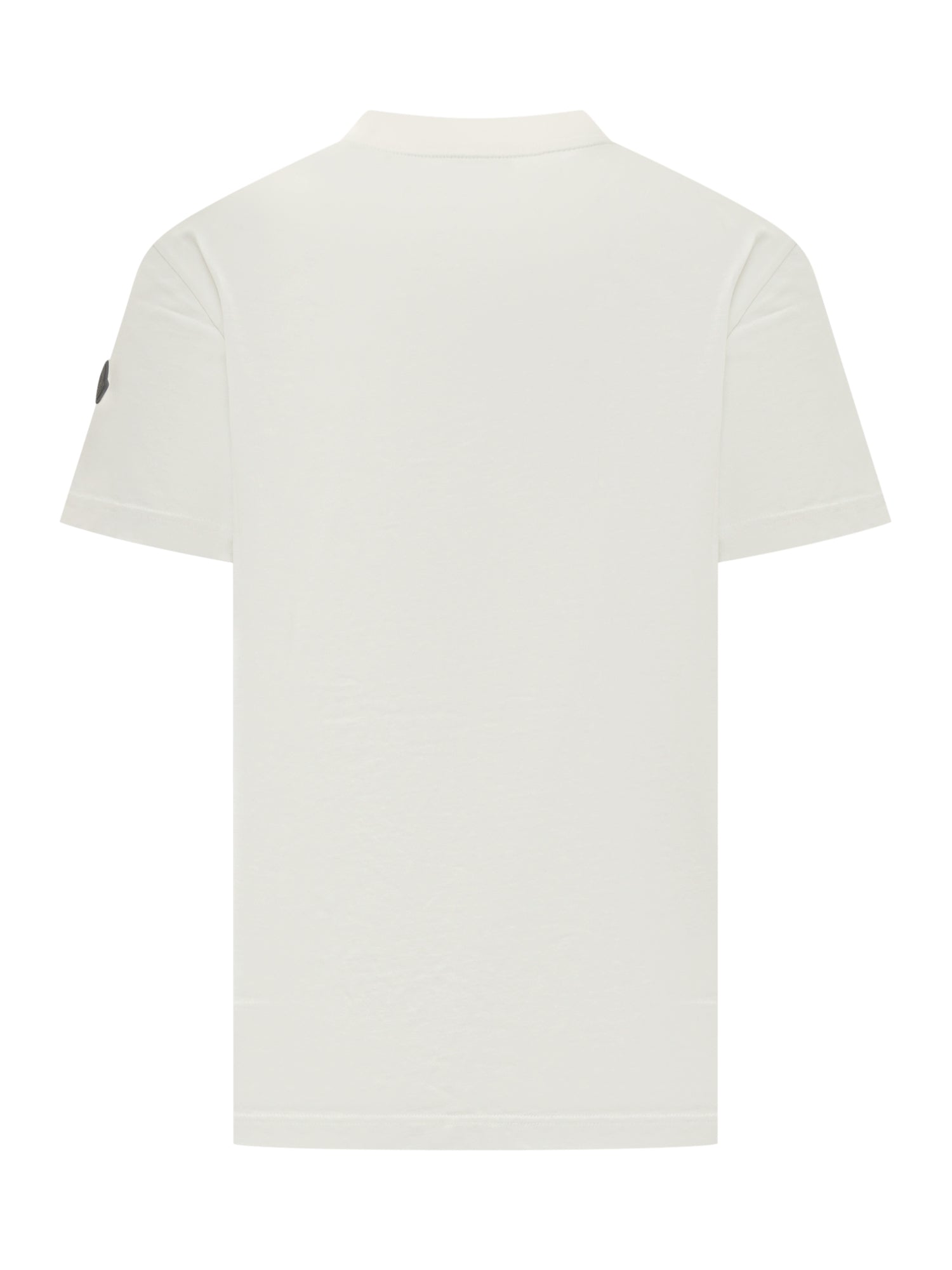 T-shirt Moncler bianca in cotone con stampa effetto spray e logo centrale.
