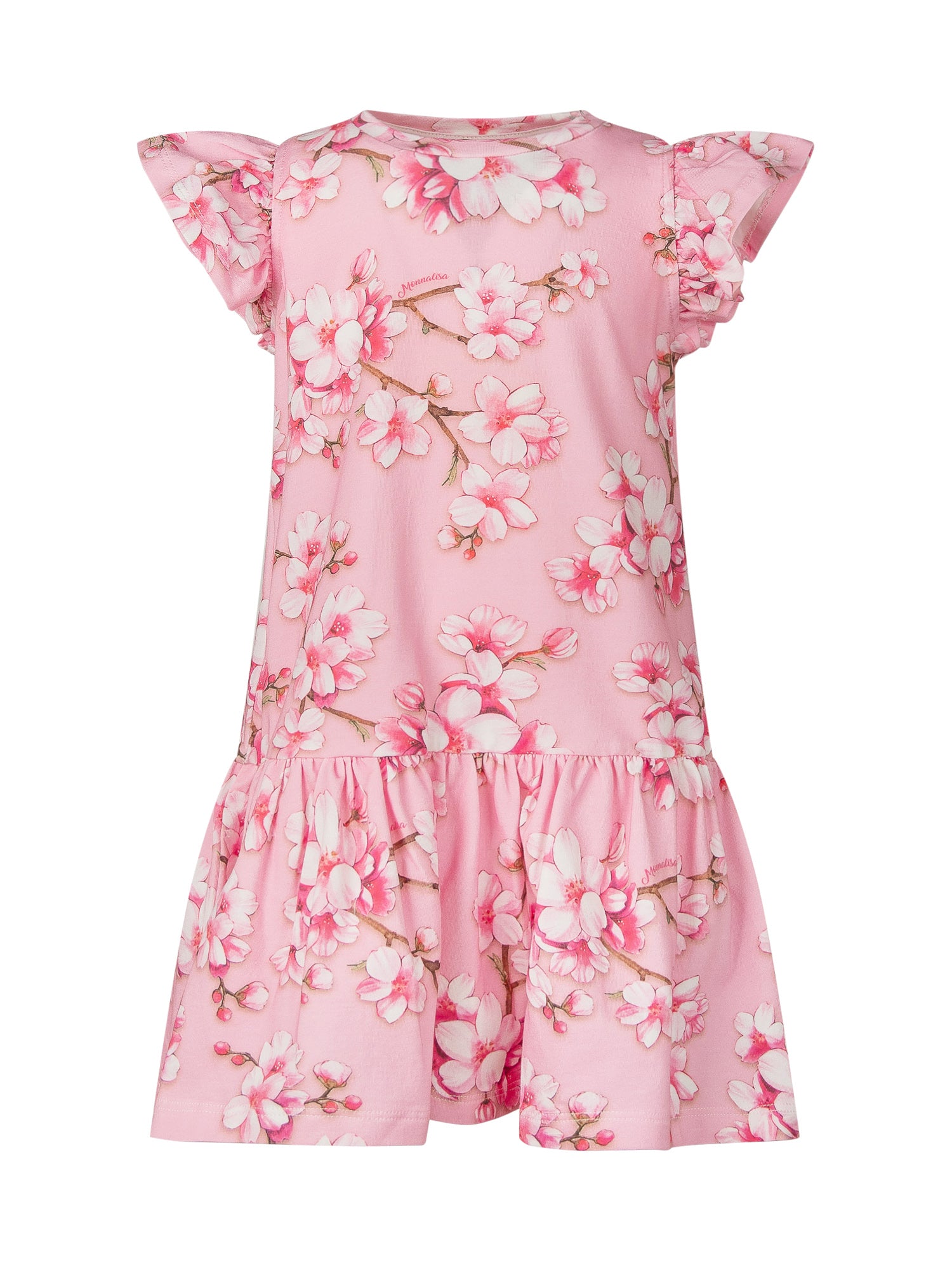 Abito corto rosa. Maniche corte. Girocollo. Motivo floreale.