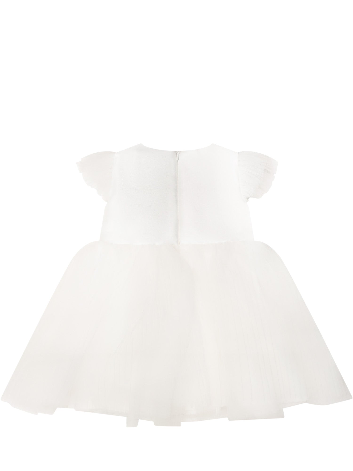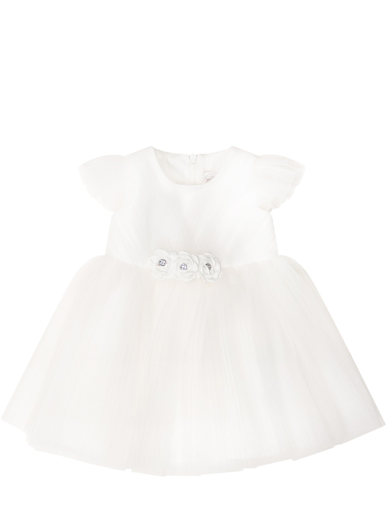 Abito bianco in tulle plissettato smanicato. Chiusura con zip sul retro. Fiori applicati sul punto vita.