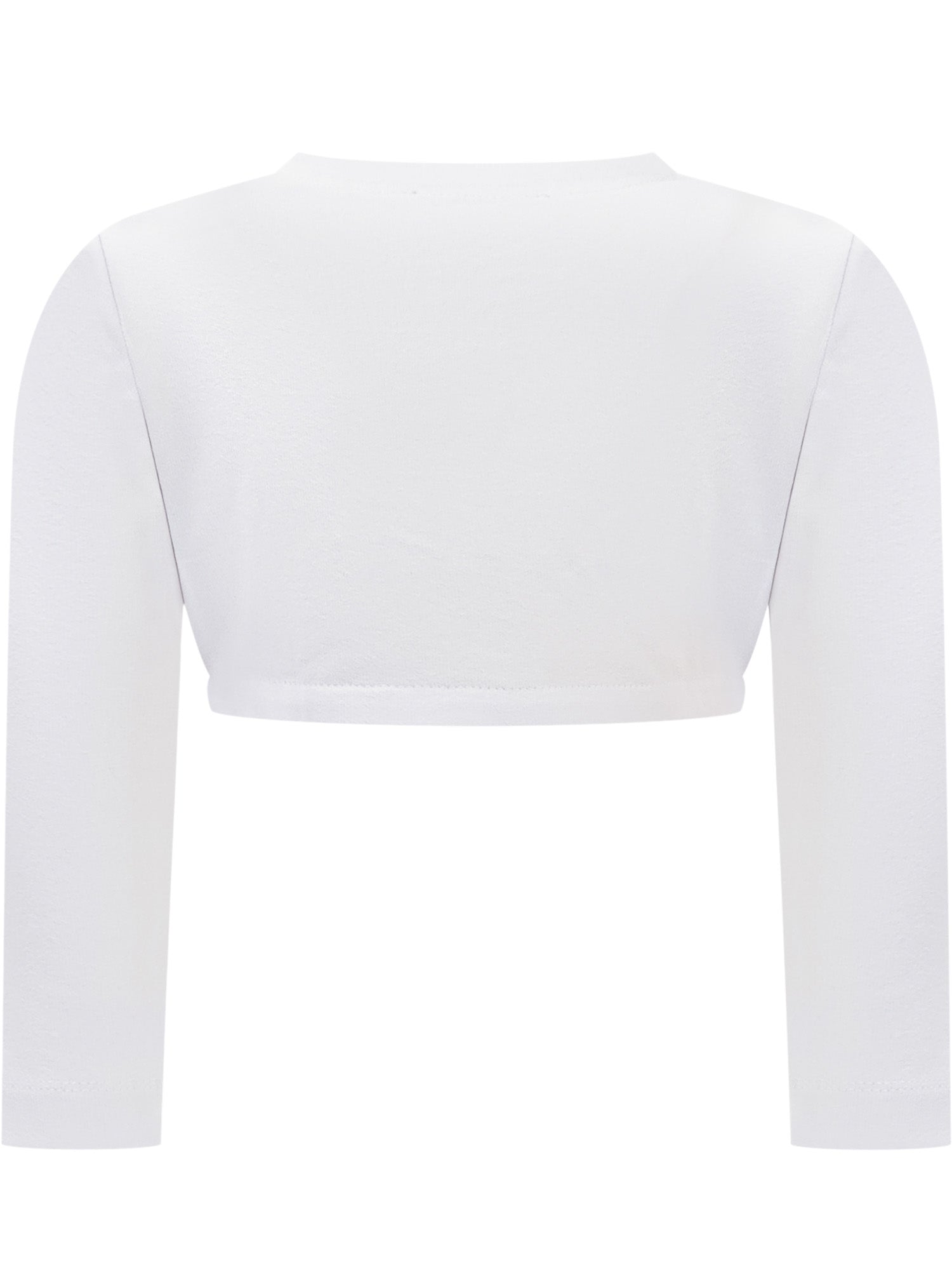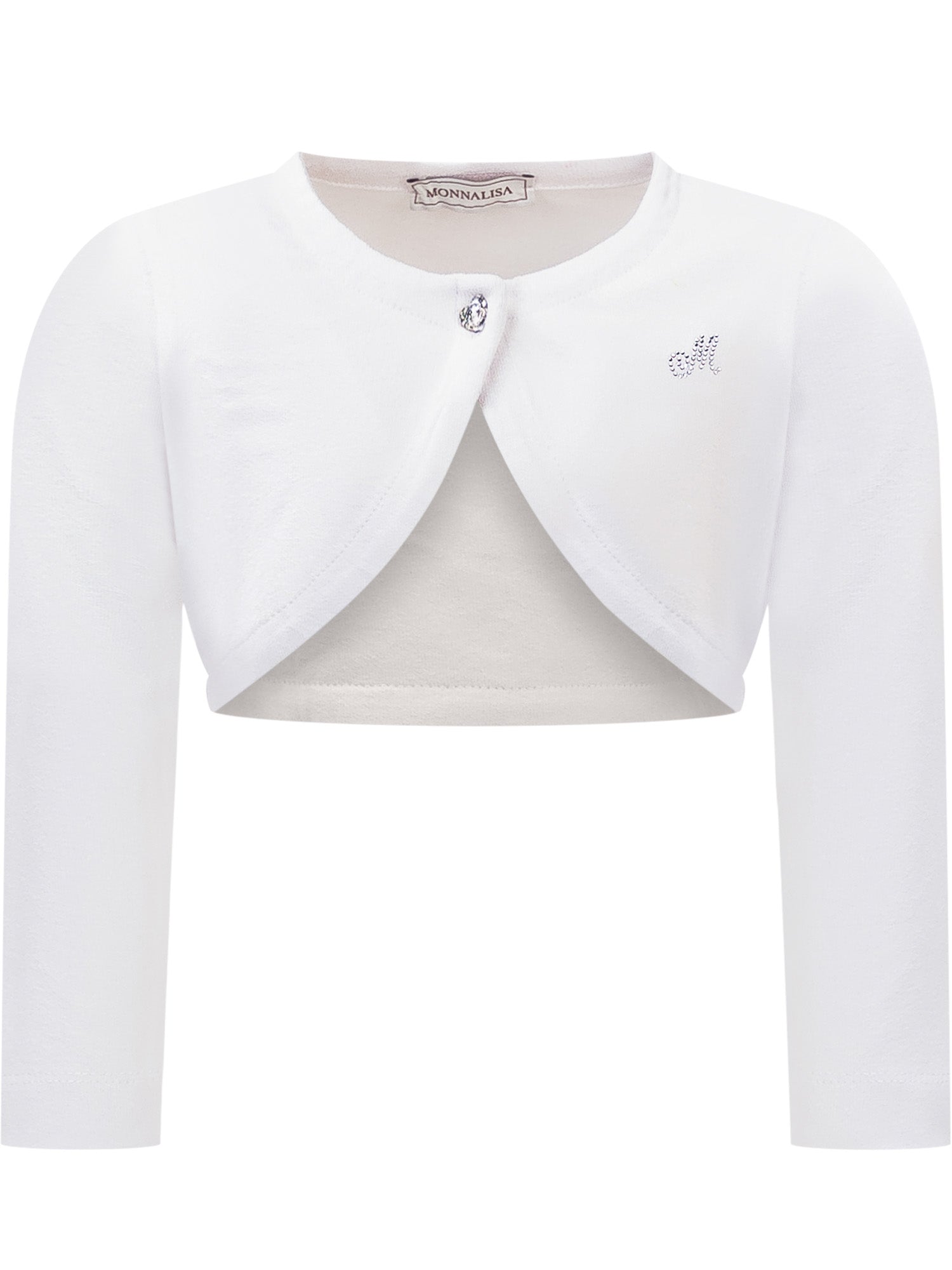 Cardigan bianco a maniche lunghe. Chiusura con bottone a cuore. Logo con strass sul davanti.