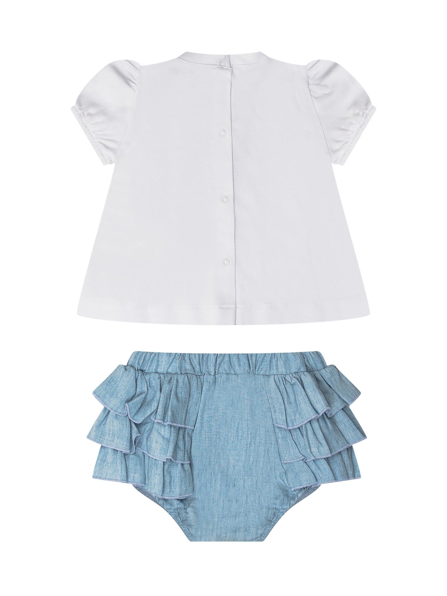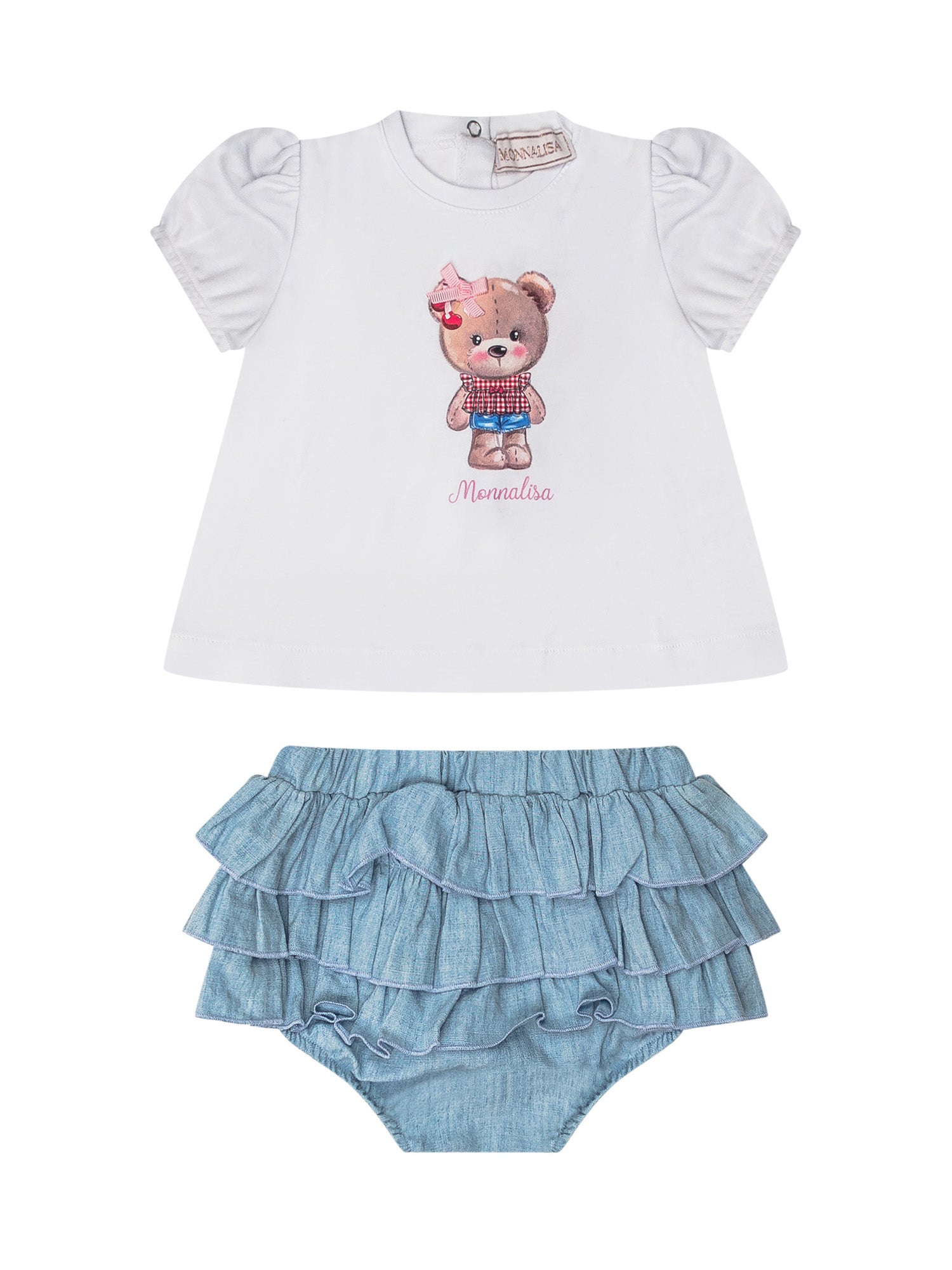 Completo a due pezzi. T-Shirt bianca a maniche corte. Chiusura con bottoni sul retro. Stampa Teddy sul davanti. Coulotte con balze e vita elasticizzata.