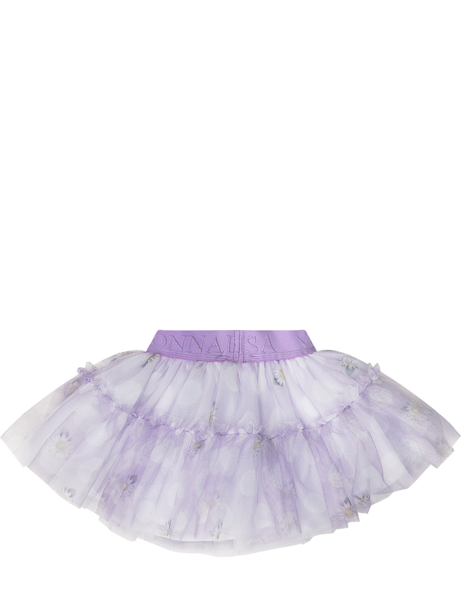 Gonna viola in tulle. Elastico in vita logato. Stampa pois e margherite all-over.