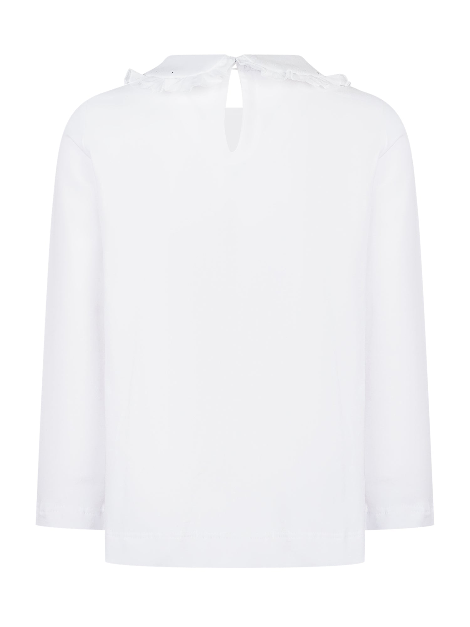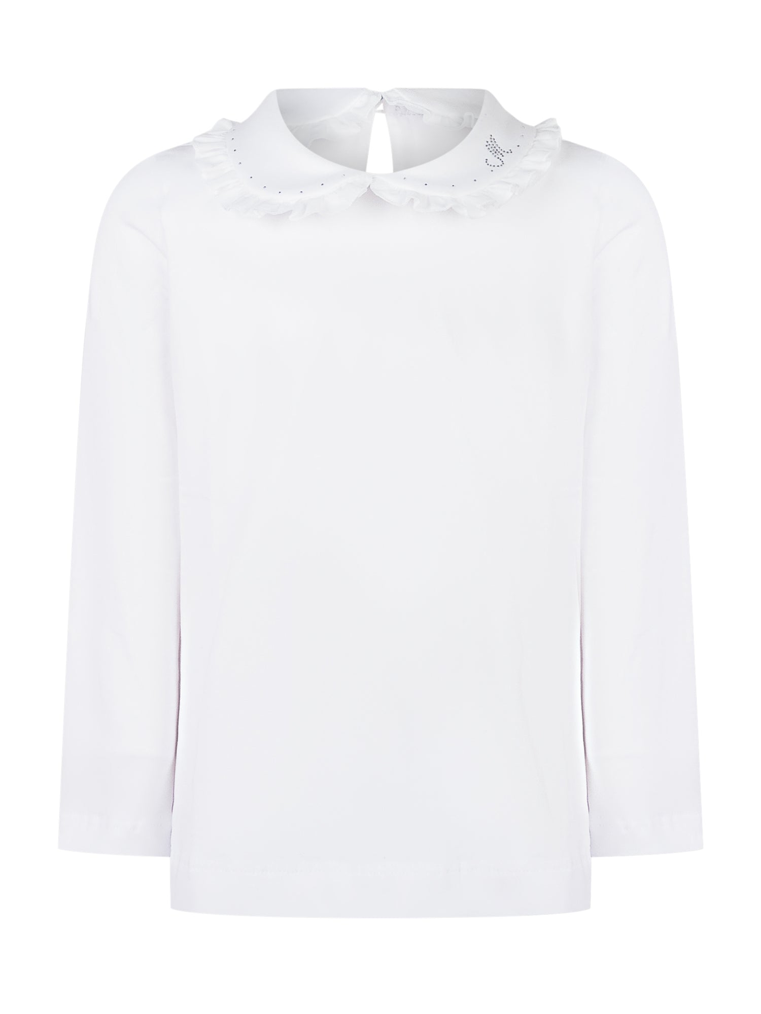 Camicia Monnalisa bianca con maniche lunghe e colletto arrotondato arricciato con ricami luminosi.