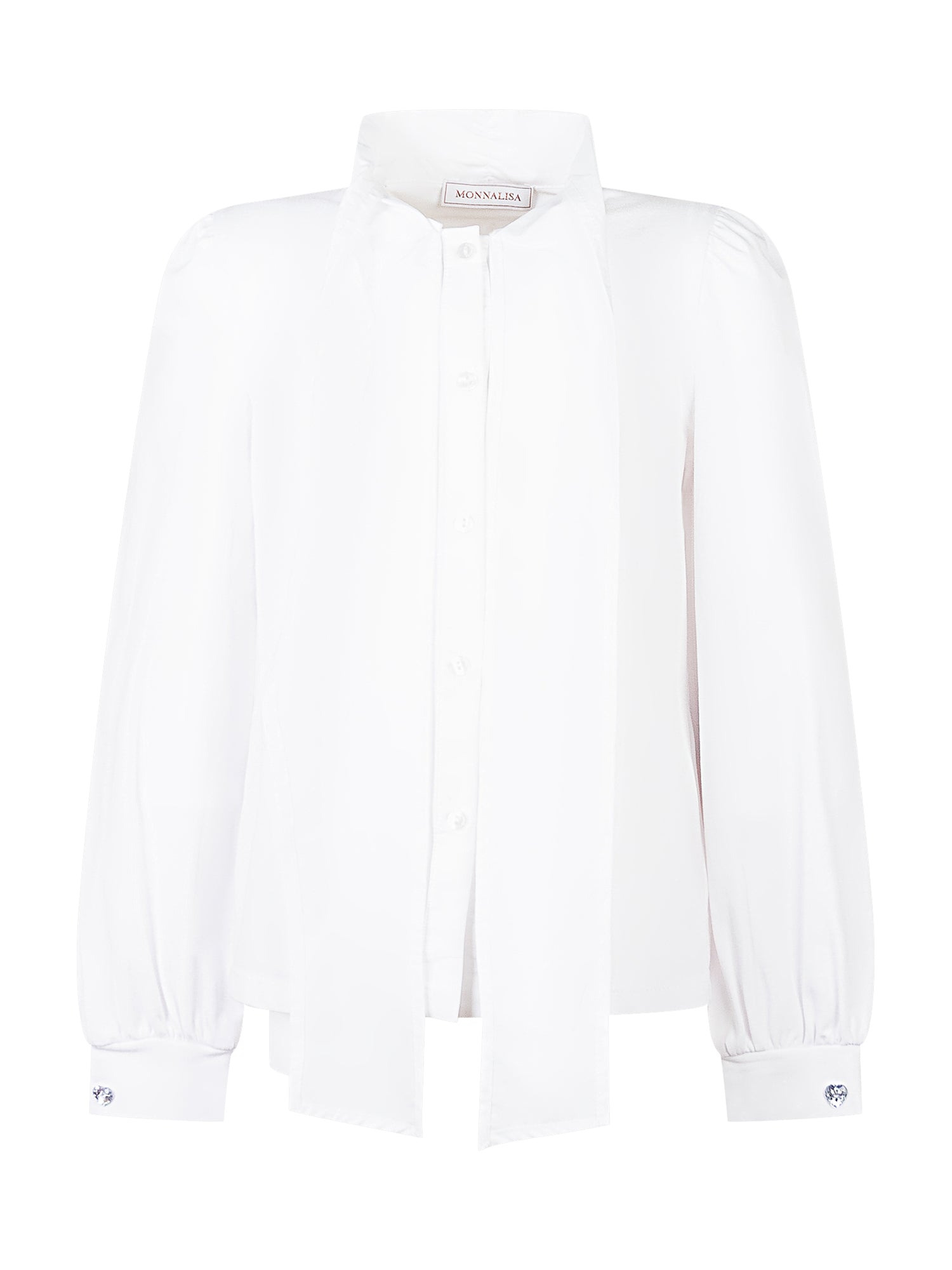 Camicia Monnalisa bianca elegante con fiocco al collo e maniche lunghe.