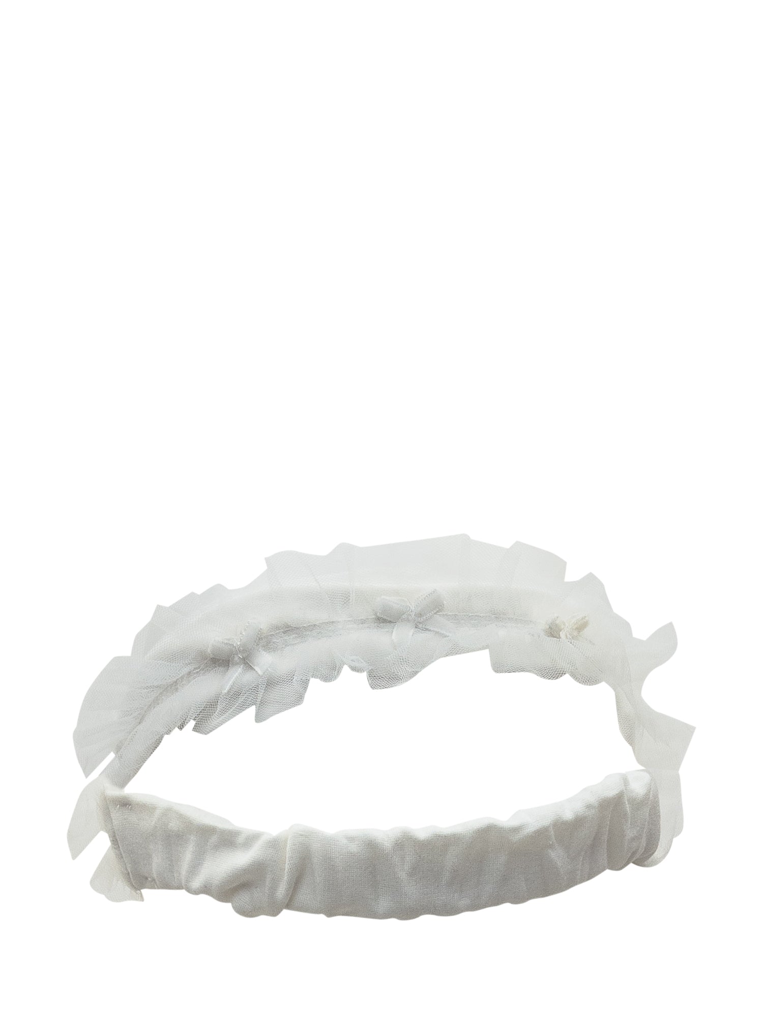 Fascia per bambina in tessuto bianco con dettagli in tulle e piccoli fiocchi decorativi.