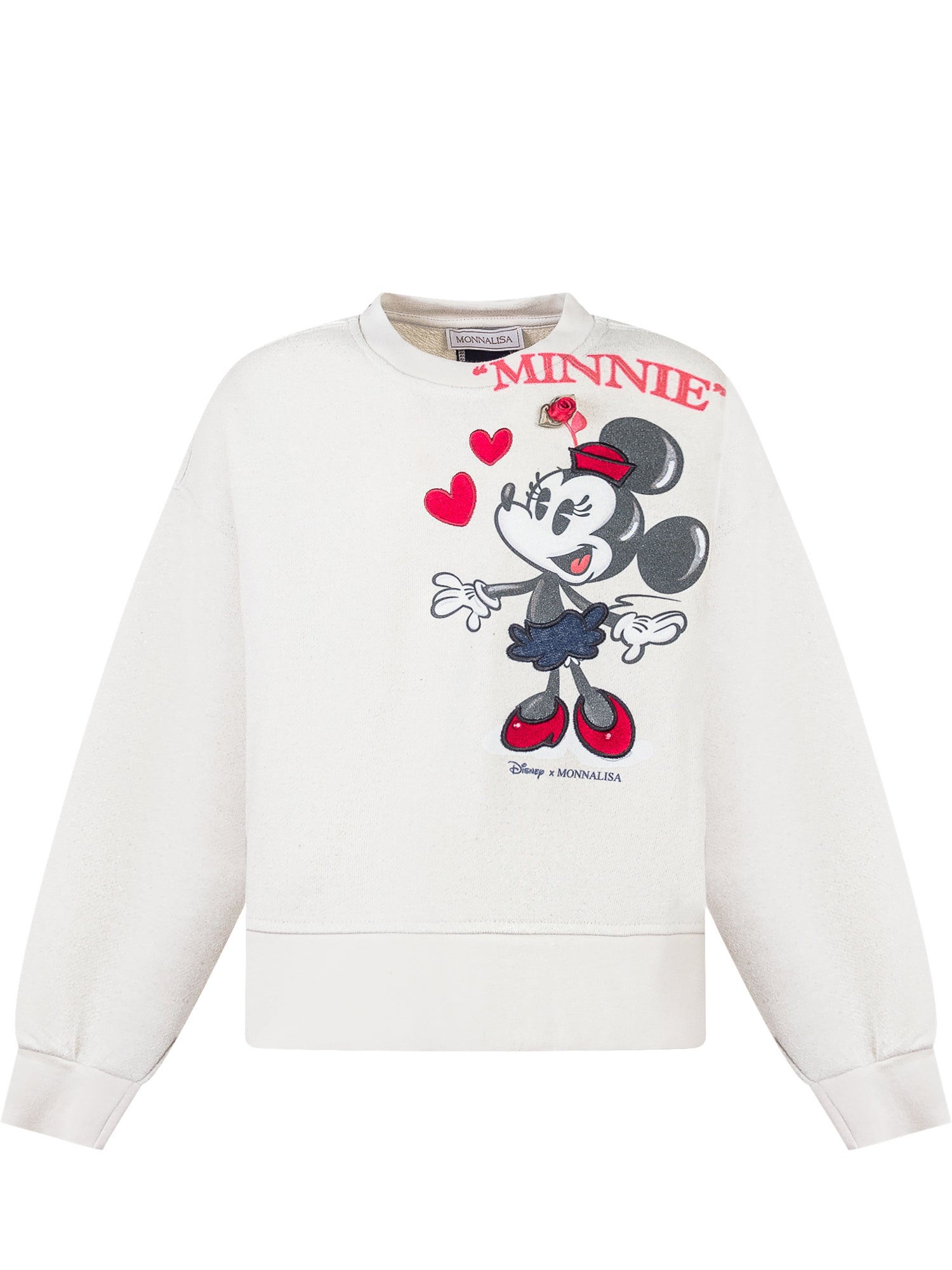 Felpa Monnalisa bianca in cotone con stampa di Minnie e cuori rossi.