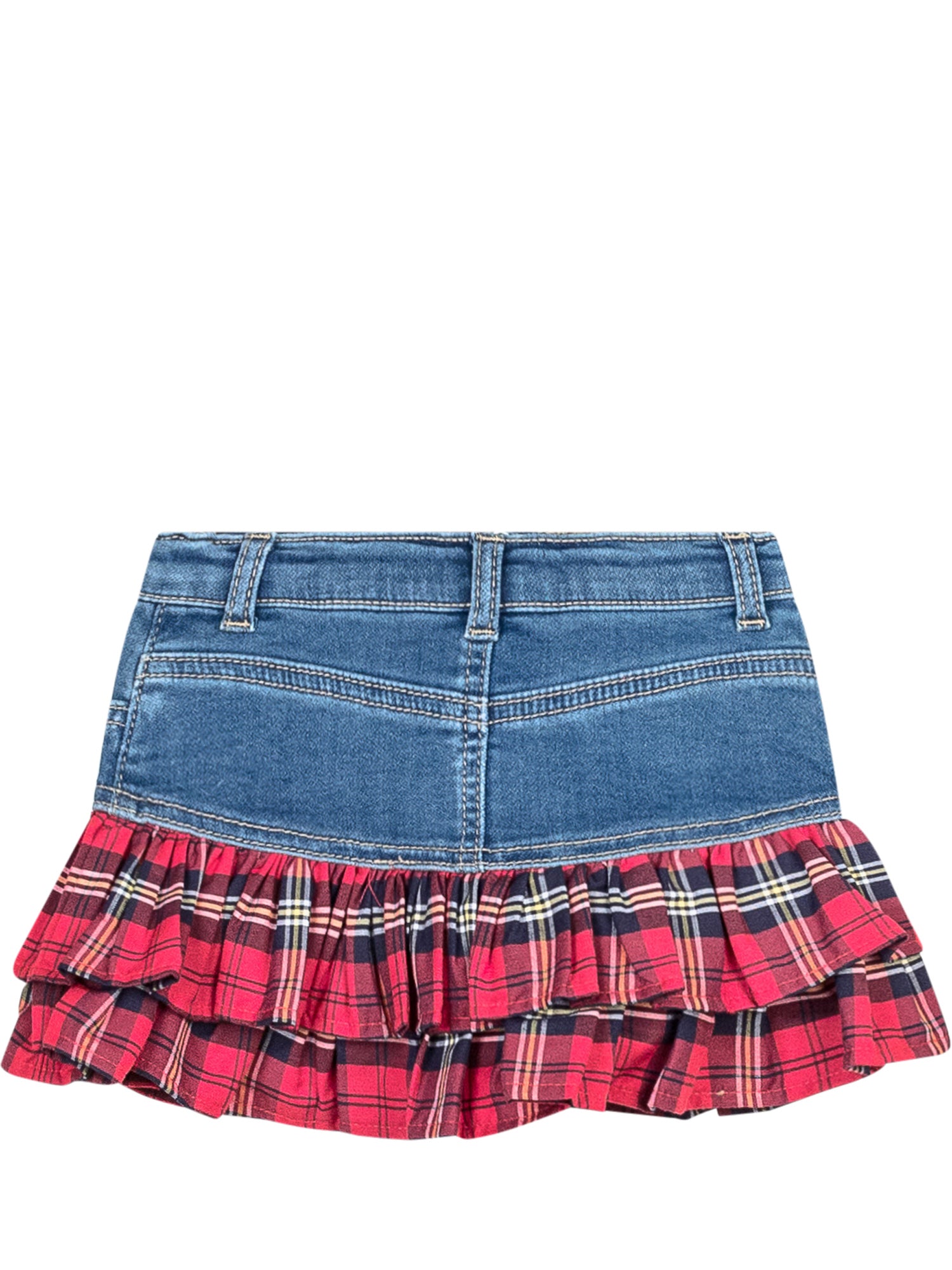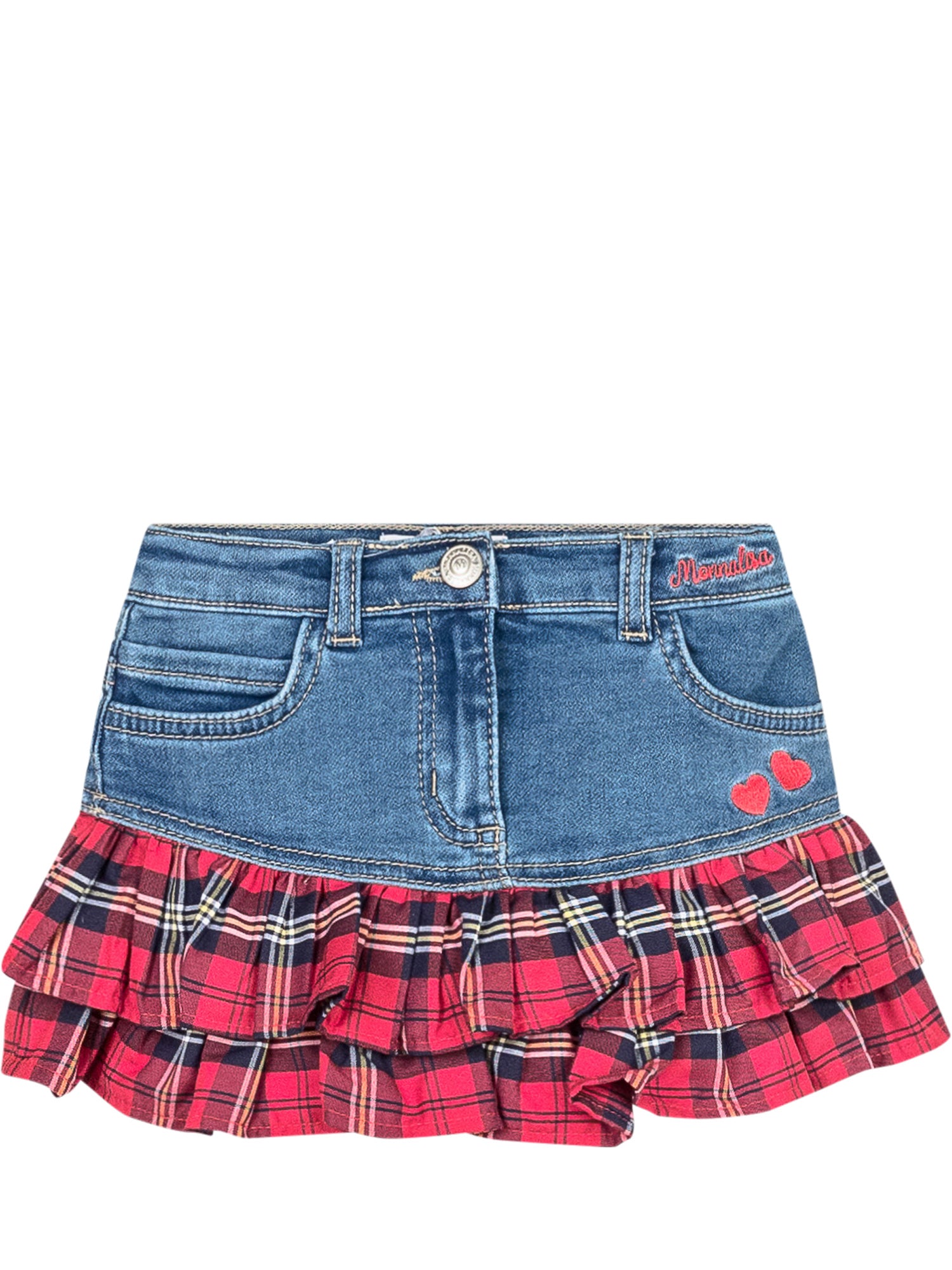 Gonna Monnalisa in denim blu con balze in tessuto scozzese rosso e cuoricini ricamati.