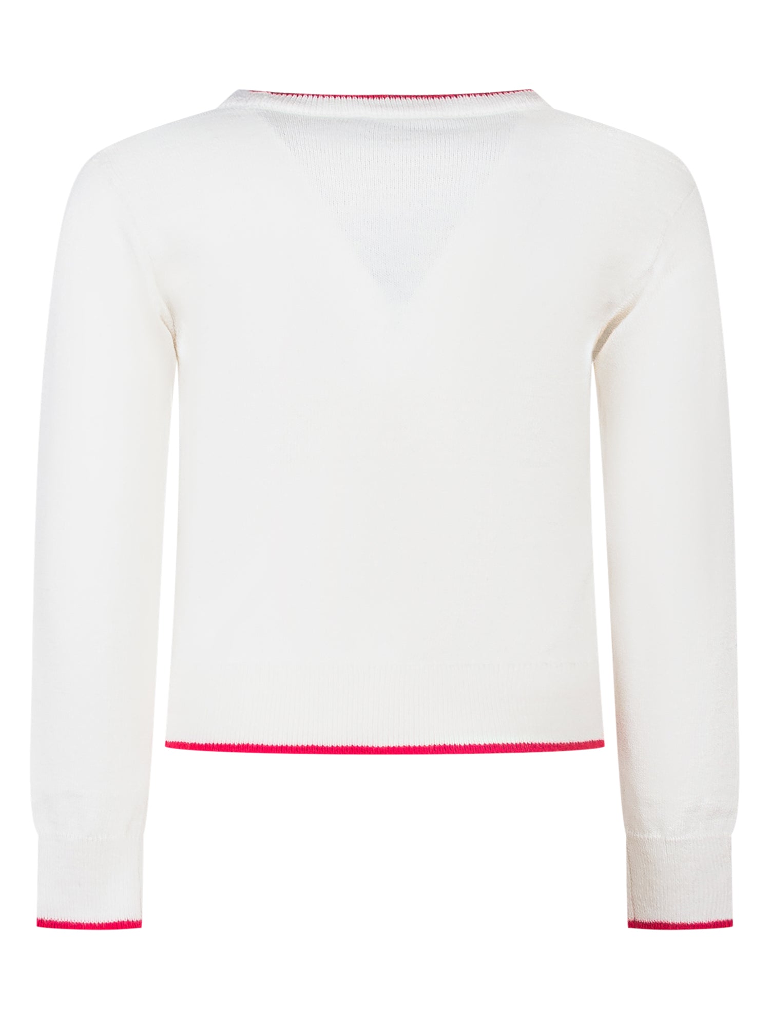 Maglione Monnalisa bianco in cotone con maxi intarsio di Minnie e cuori rossi.