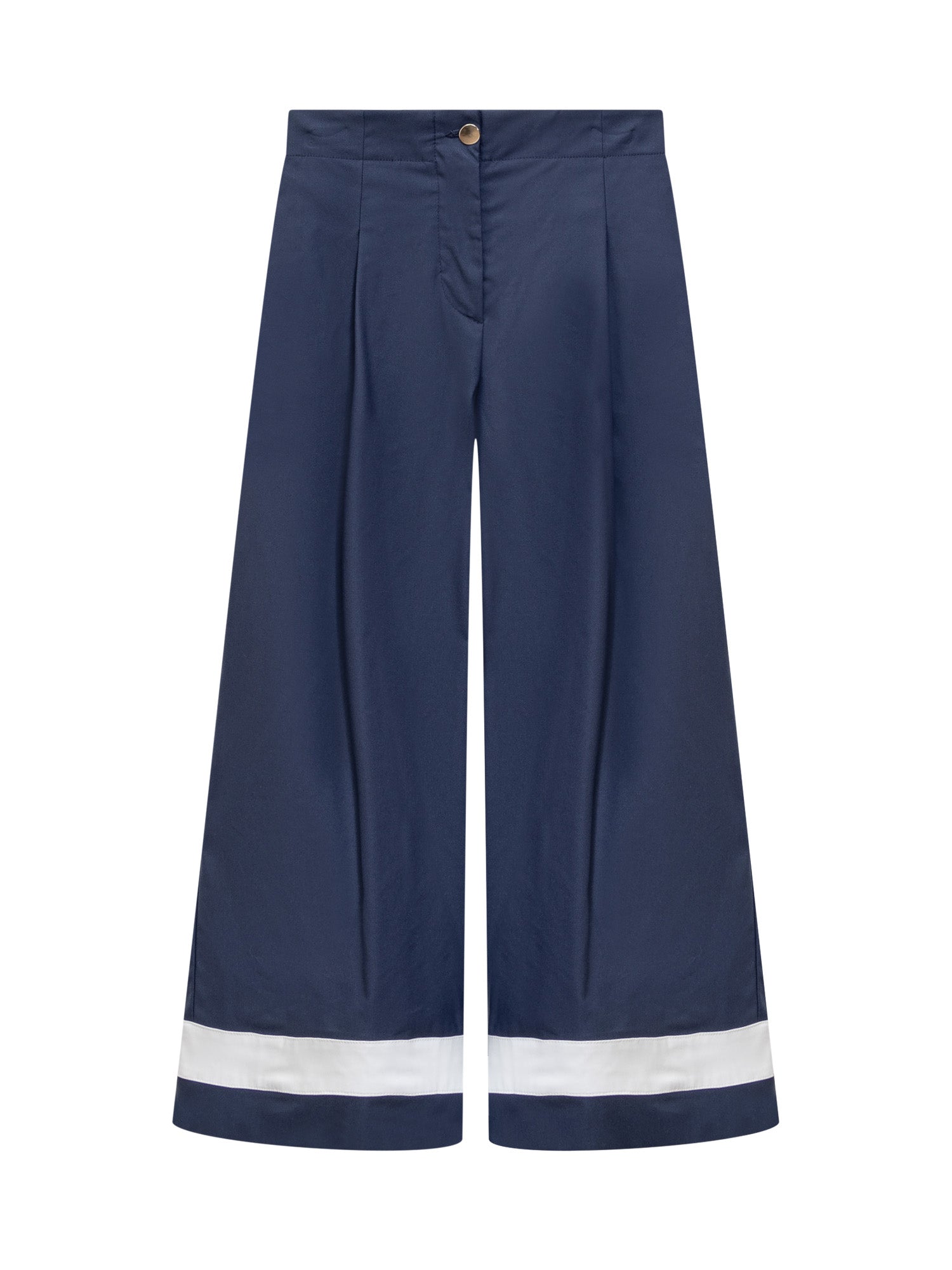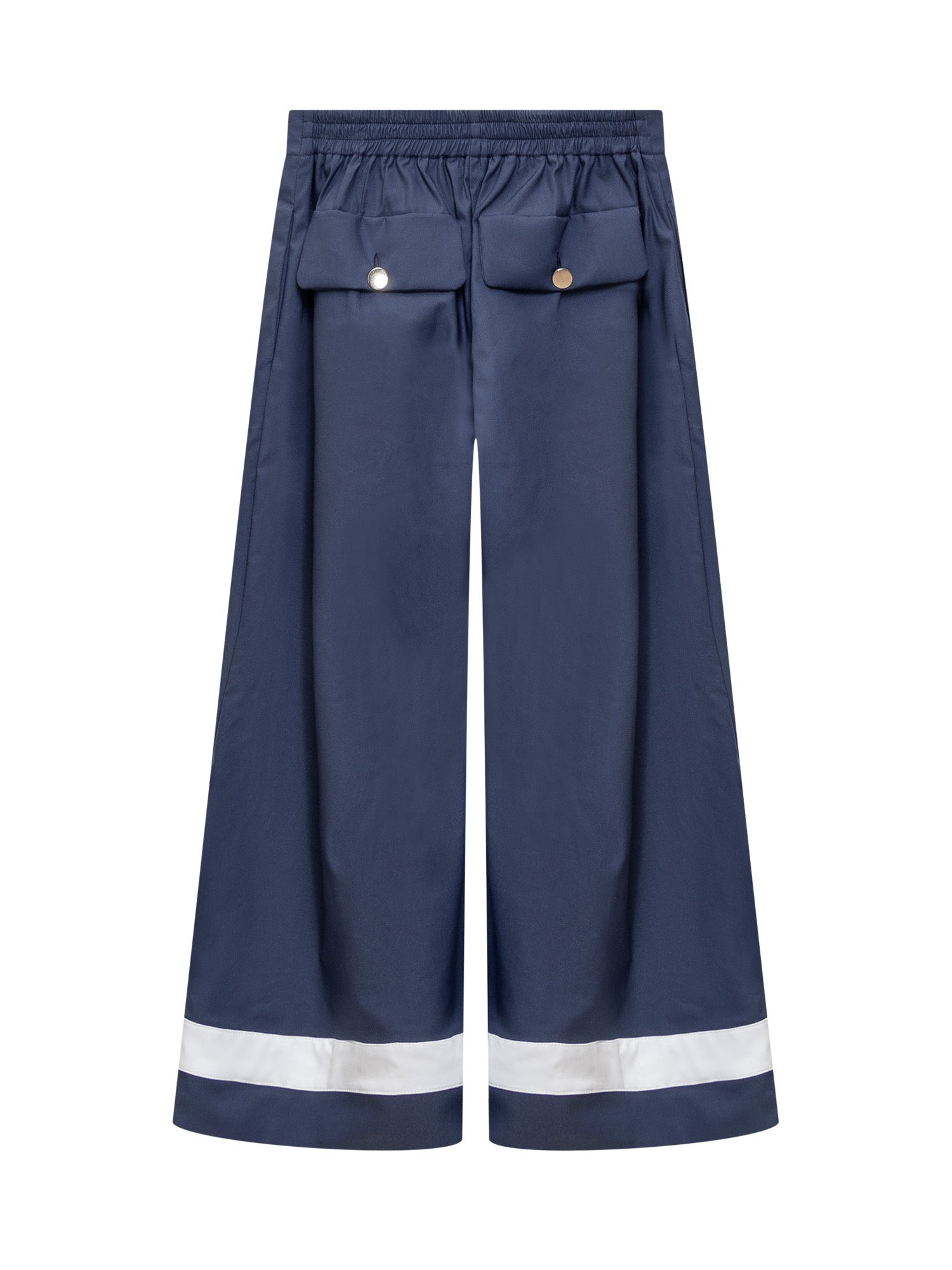 Pantaloni stretch blu. Chiusura con zip e bottone sul davanti. Due tasche sul retro. Inserto elasticizzato sul retro.