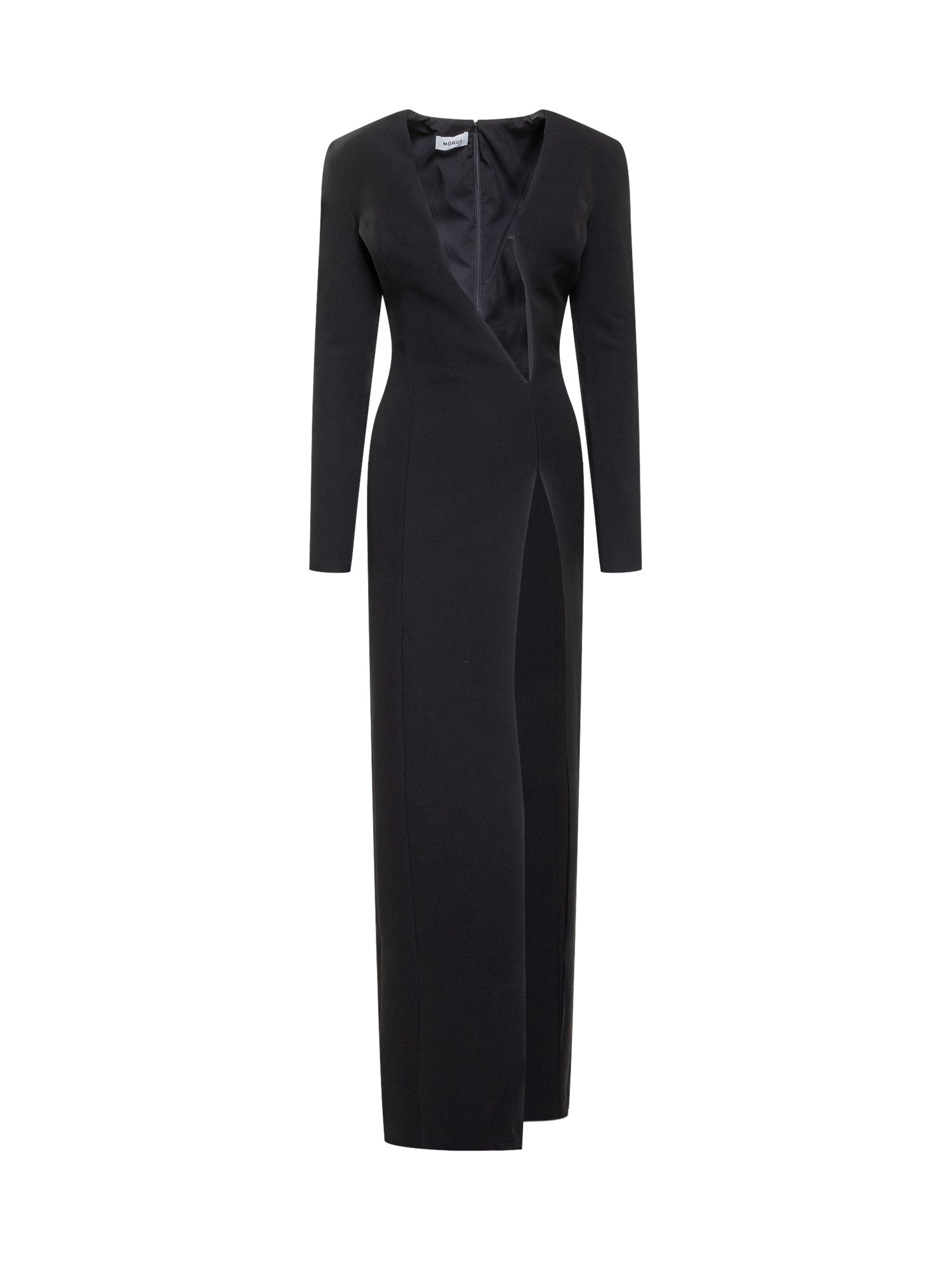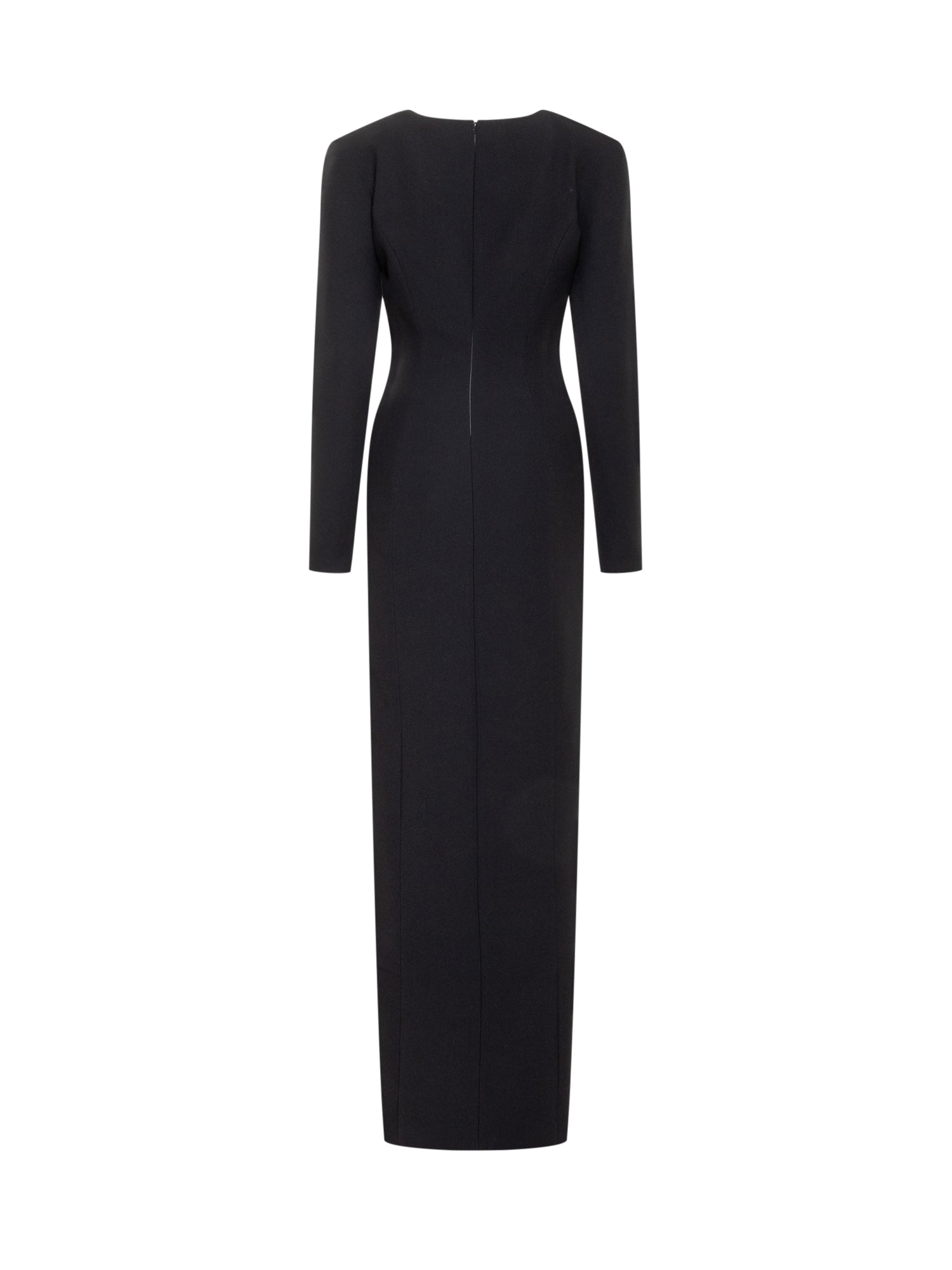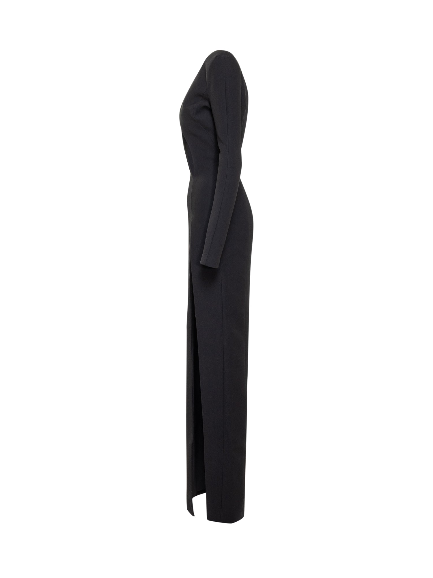 Abito lungo nero. Scollo a V asimmetrico sul davanti. Chiusura con zip e gancino sul retro. Grande spacco laterale.