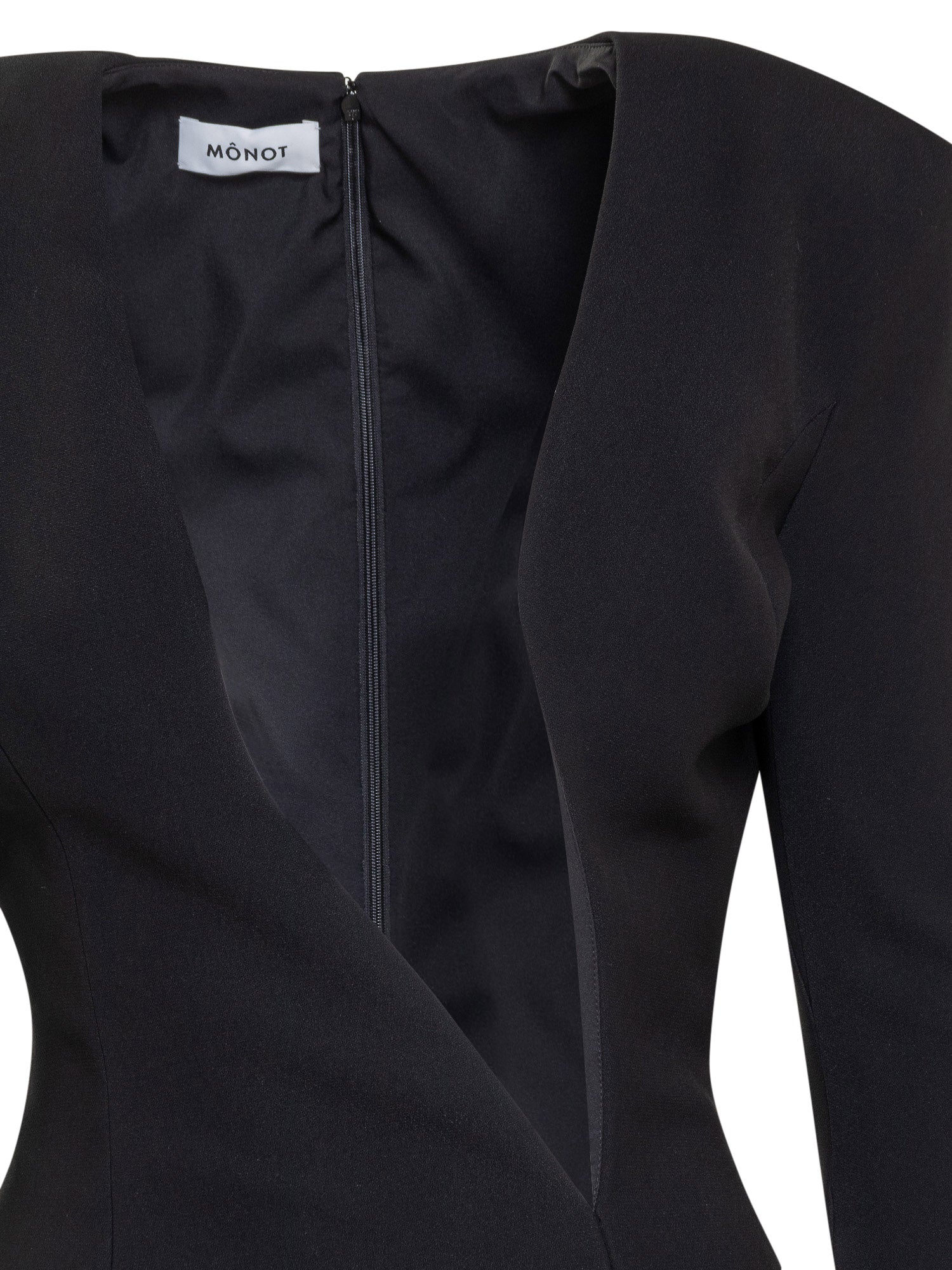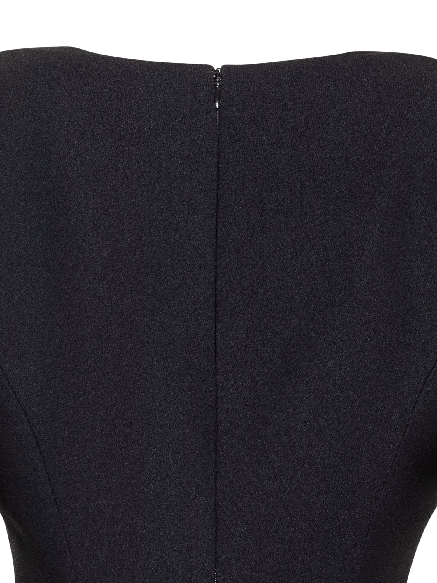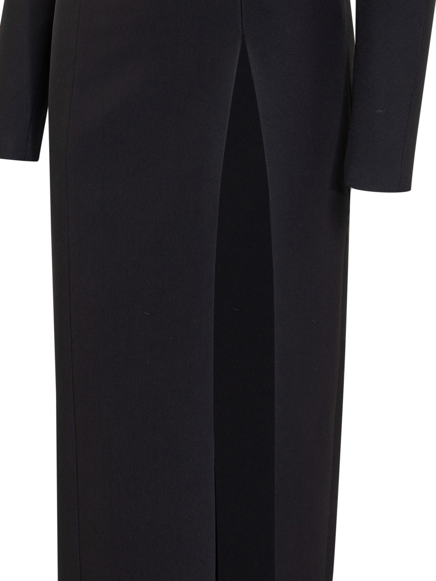 Abito lungo nero. Scollo a V asimmetrico sul davanti. Chiusura con zip e gancino sul retro. Grande spacco laterale.
