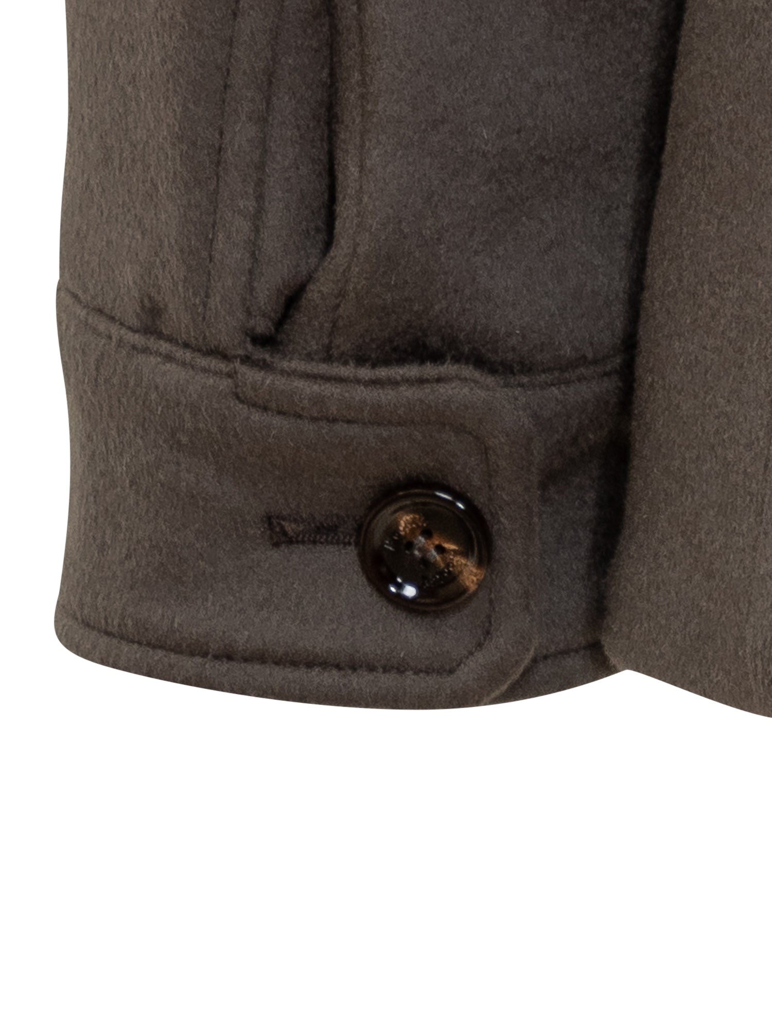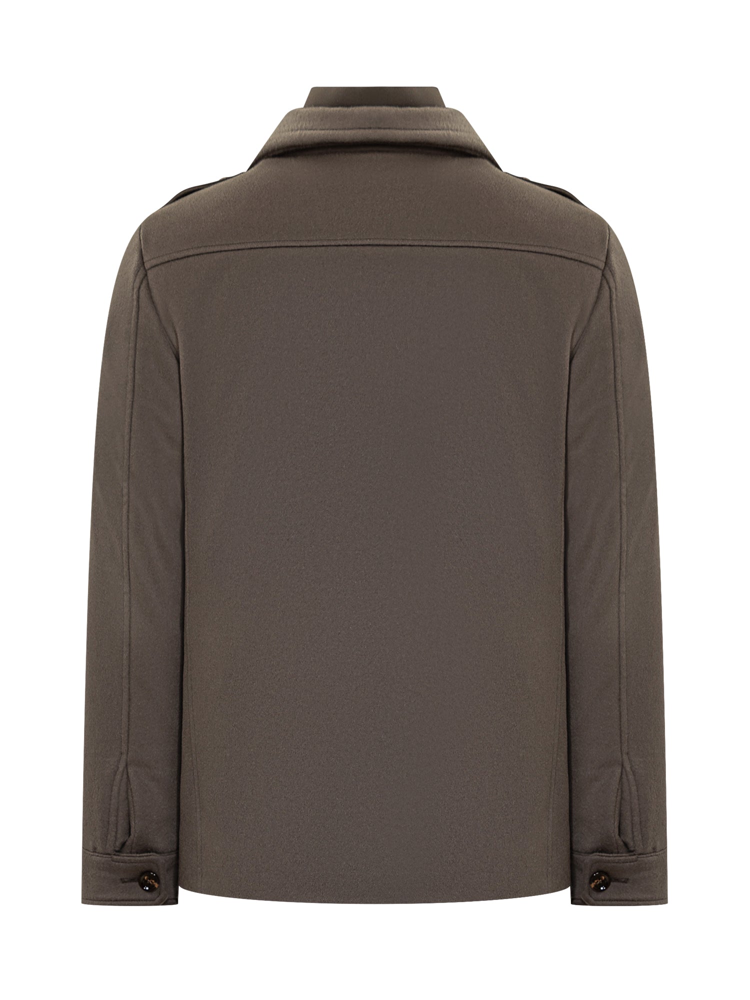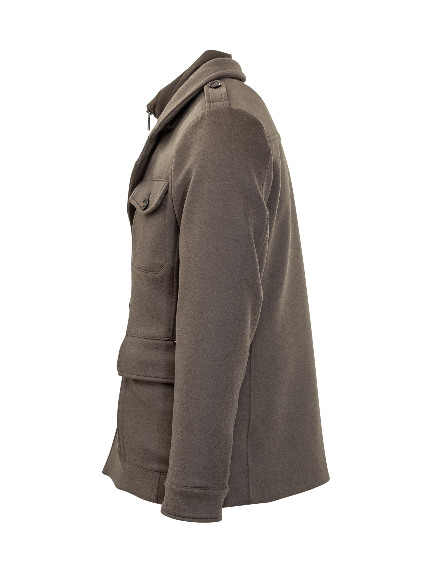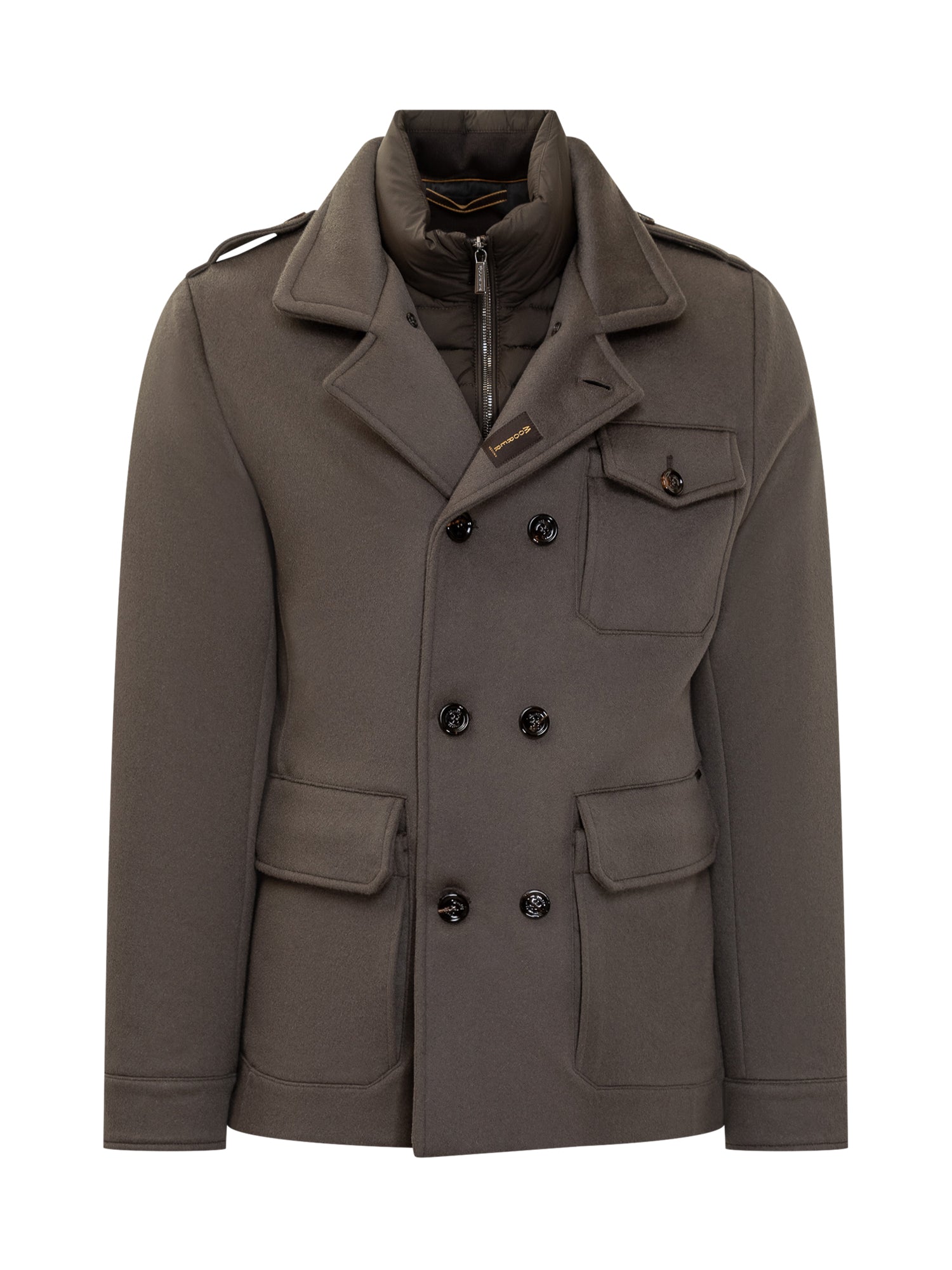 Cappotto Boeri-LE Moorer in lana tecnica grigia con pettorina imbottita removibile. Design doppiopetto con tasche a patta e spalline.